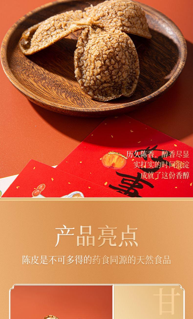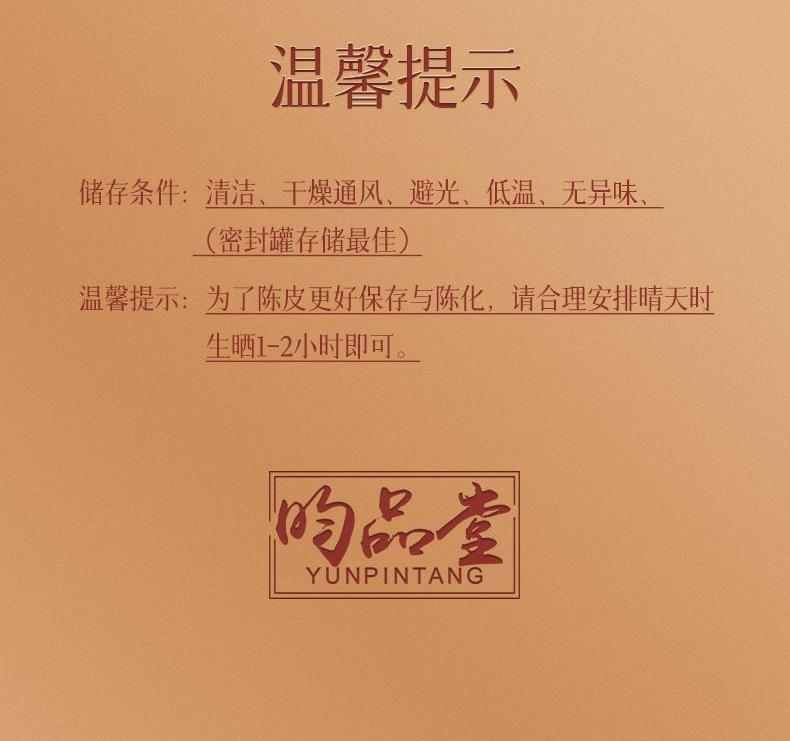 净含量:150g 毛重:2.9kg 产区:广东新会南坦核心产区 原料:新会干仓陈皮 规格:单瓶 1.选用广东新会南坦产区15年陈皮原料,香气醇厚,表面油光感足 2.从采收,洗选,开皮,翻皮到晒皮贮存与陈化等每一个环节都坚持人手工制作,精心挑选。 3.新会陈皮味辛性温,甘香醇陈,油包粒大,油室饱满,芳香浓郁,具有唤醒味蕾,改善食欲不振,消滞健胃。 4.新会陈皮不仅能单独泡茶,还可以用来与其他茶叶搭配冲泡,白茶,红茶,普洱等。