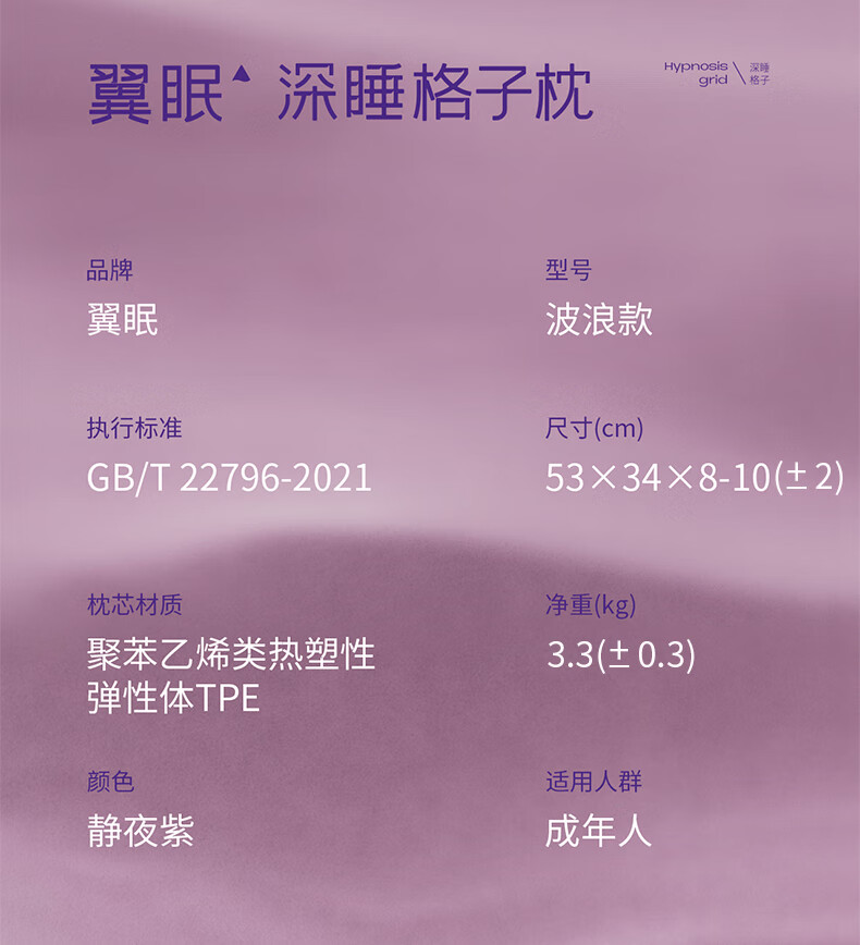 产品尺寸:53*34*10/8cm 重量:约3.3kg 颜色:富贵紫,静谧蓝 适用人群:成人 产品包含:波浪无压枕芯 *1 ,枕套*1 波浪型,一枕两用,高弹复合材料TPE, 亲肤,造型符合人体工学, 可水洗,持久使用, 透气,不变形,安全环保无毒。