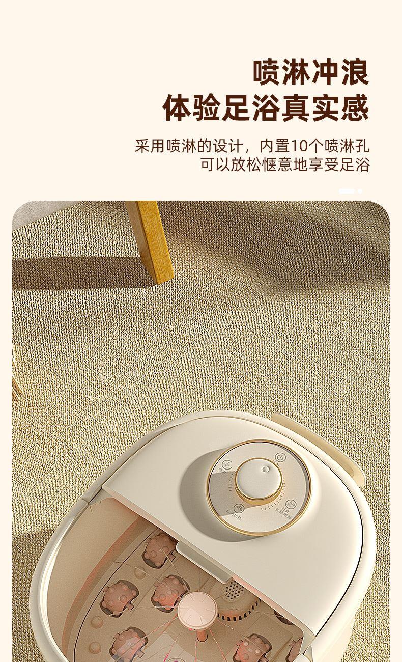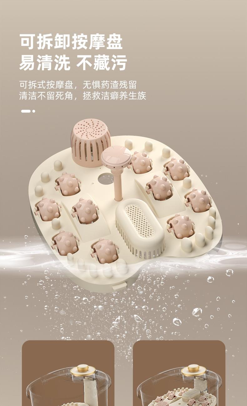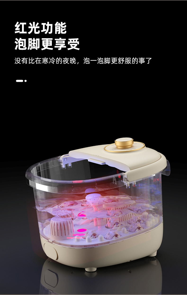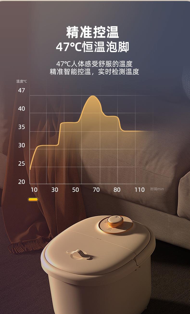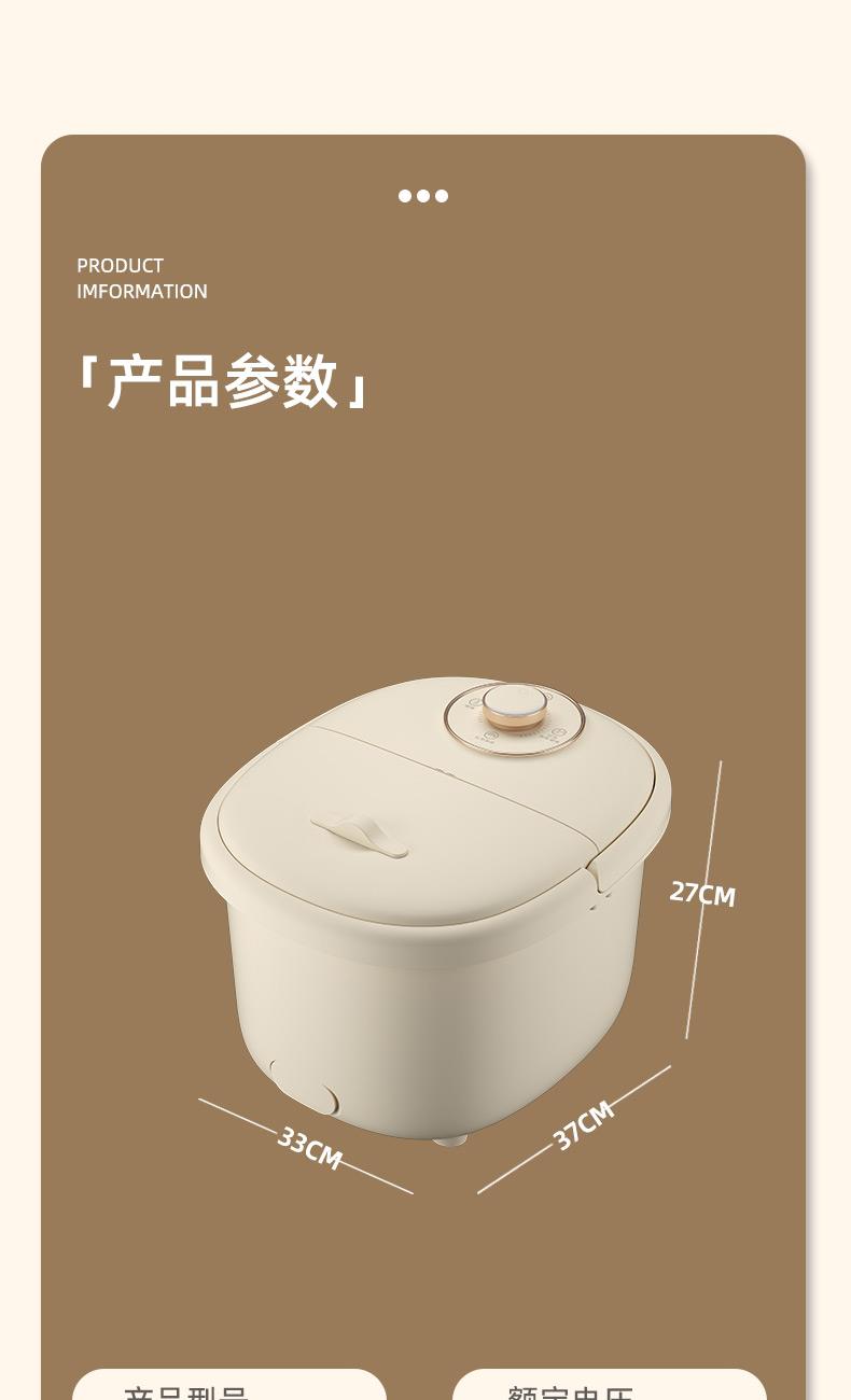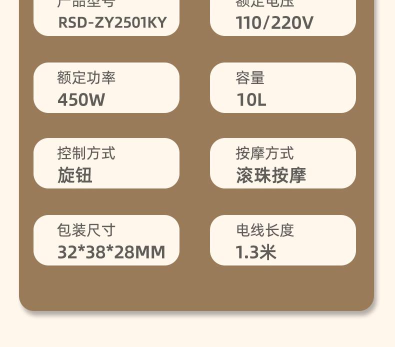 产品型号:RSD-ZY2501KY 额定电压:220V 额定功率:450W 容 量:8L 材 料:全新PP 执行标准:GB 4706.1-2005 GB 4706.10-2008 产品尺寸: 37.5*31*28.5cm 彩包尺寸:32*29*38cm 单台毛重 : 2.2KG · 旋钮控制,自动加热,恒温47℃ · 防干烧,干烧不漏水,使用更安全 (杜绝一切因干烧漏水引起的安全隐患和售后) · 创新控温设计,直击顾客痛点,产品加热速 度提升一倍,控温±1℃ · 花洒喷淋,可使桶内水温更均匀,增加泡脚乐趣 · 按摩组件可拆卸清洗设计,减少细菌滋生 .躺泡设计,更符合力学原理,泡脚更舒适 · 准国标配置,10组按摩轮,内置药盒,可牵挂式防尘保温盖