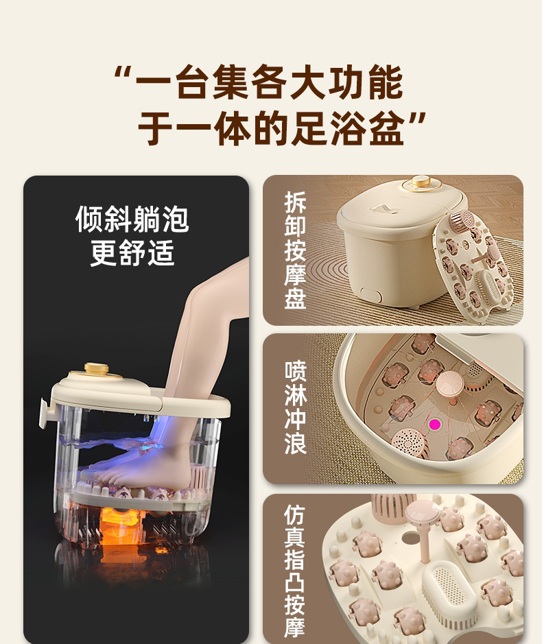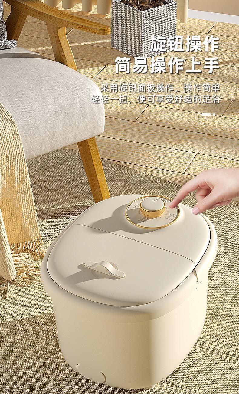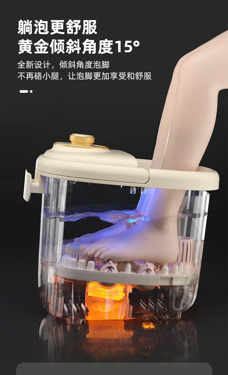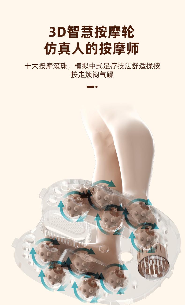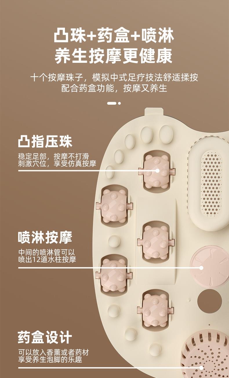 产品型号:RSD-ZY2501KY 额定电压:220V 额定功率:450W 容 量:8L 材 料:全新PP 执行标准:GB 4706.1-2005 GB 4706.10-2008 产品尺寸: 37.5*31*28.5cm 彩包尺寸:32*29*38cm 单台毛重 : 2.2KG · 旋钮控制,自动加热,恒温47℃ · 防干烧,干烧不漏水,使用更安全 (杜绝一切因干烧漏水引起的安全隐患和售后) · 创新控温设计,直击顾客痛点,产品加热速 度提升一倍,控温±1℃ · 花洒喷淋,可使桶内水温更均匀,增加泡脚乐趣 · 按摩组件可拆卸清洗设计,减少细菌滋生 .躺泡设计,更符合力学原理,泡脚更舒适 · 准国标配置,10组按摩轮,内置药盒,可牵挂式防尘保温盖