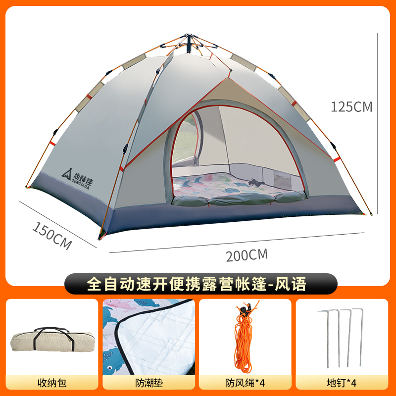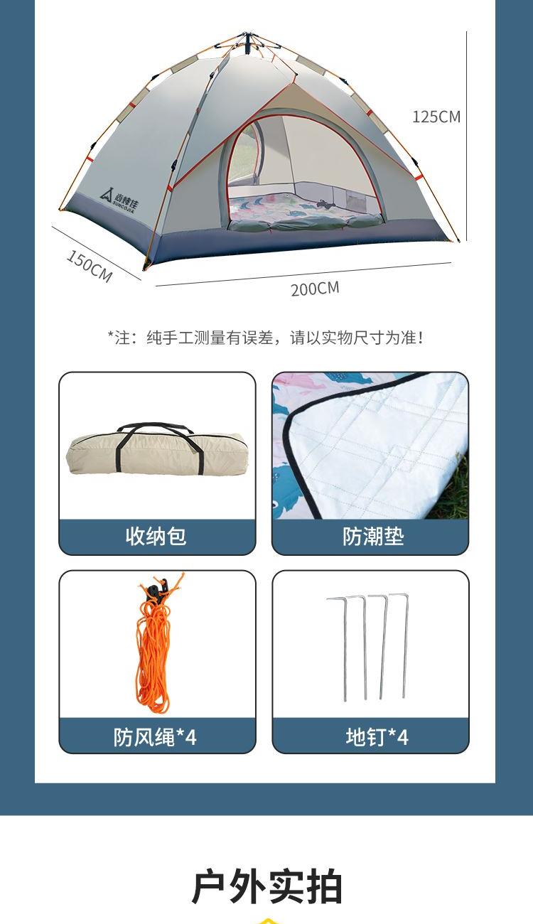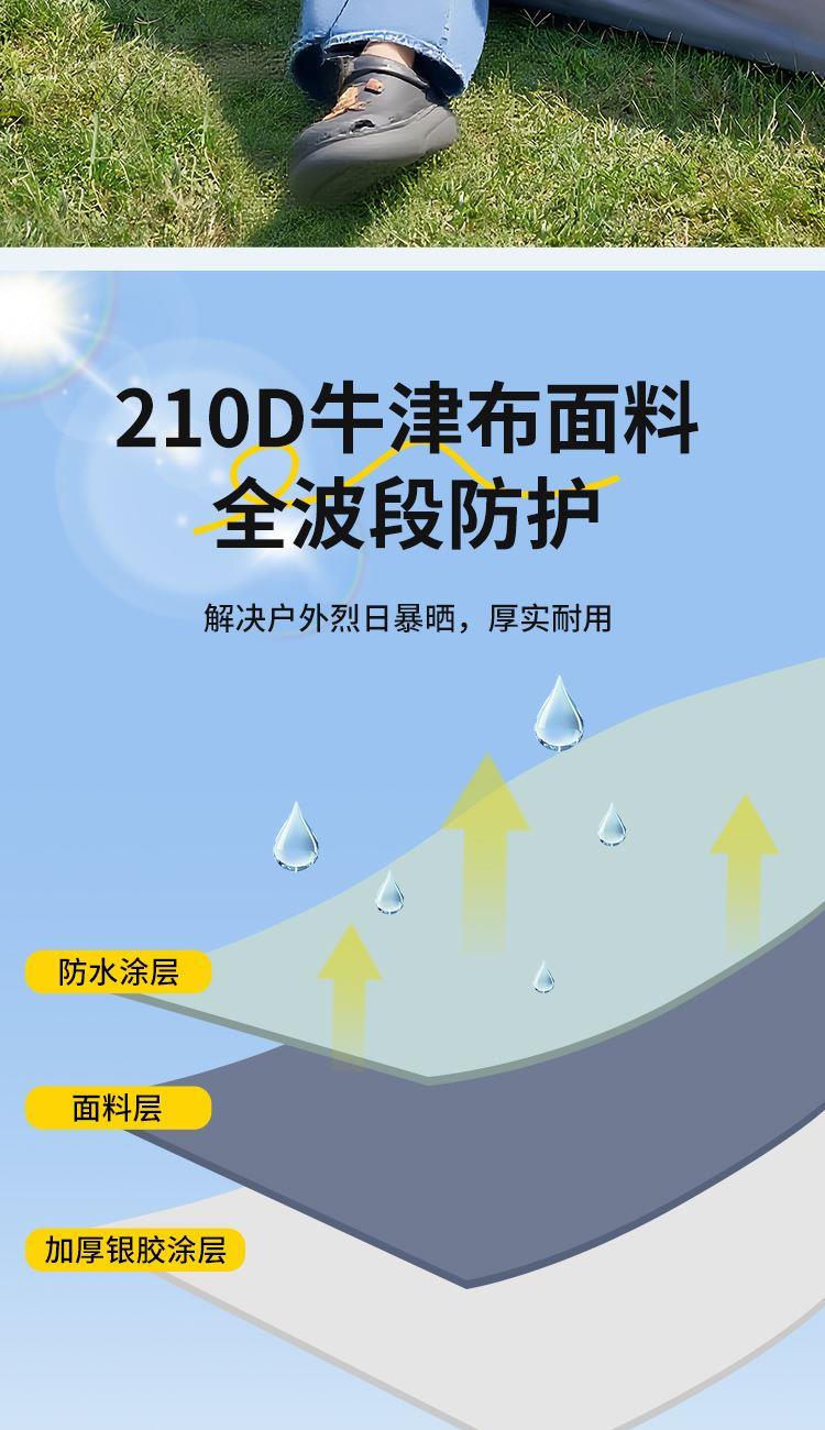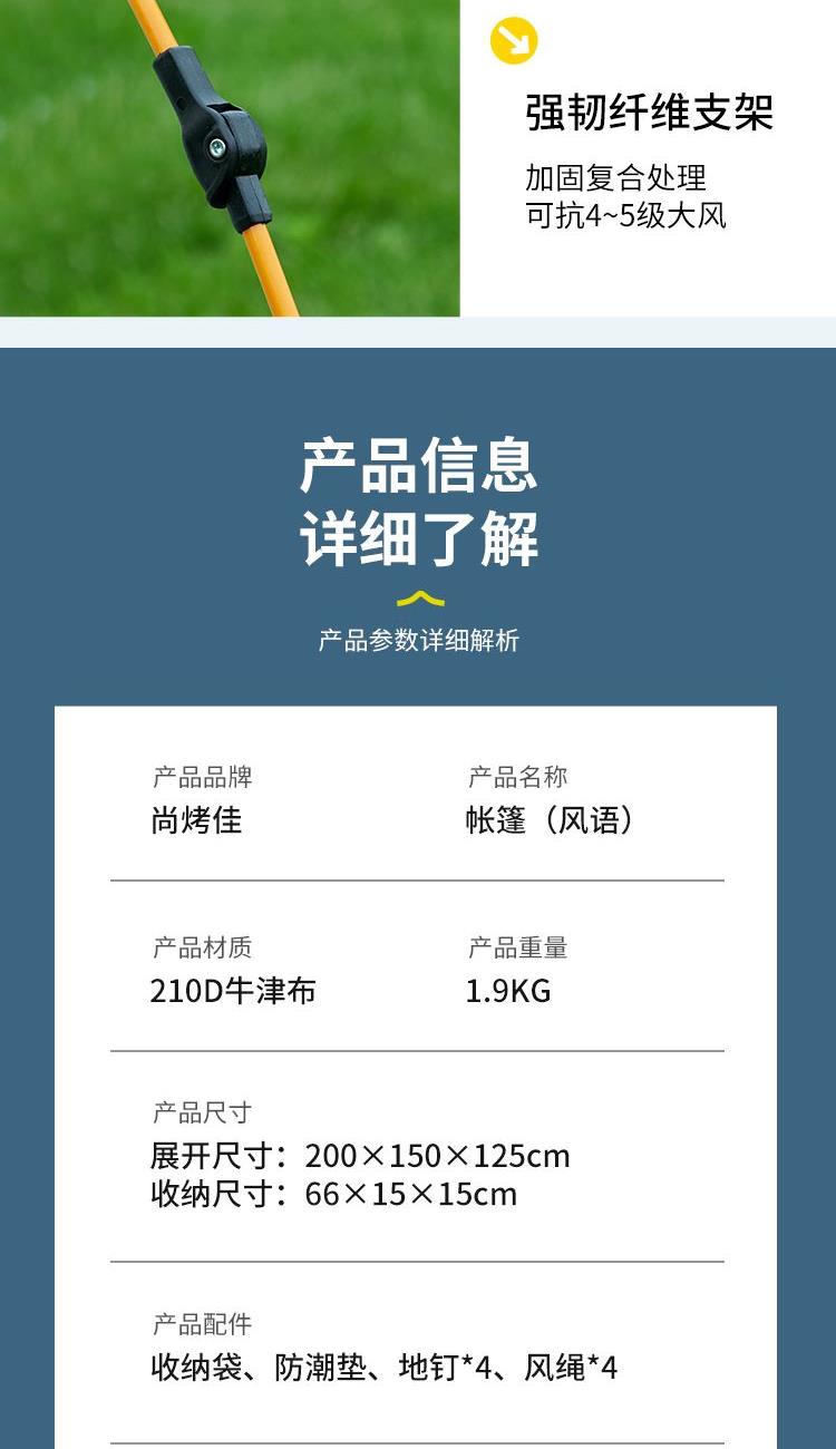 产品材质 210D牛津布 产品重量 1.9KG 产品尺寸 展开尺寸:200x150x125cm收纳尺寸:66x15x15cm 产品配件 收纳袋、防潮垫、地钉*4、风绳*4