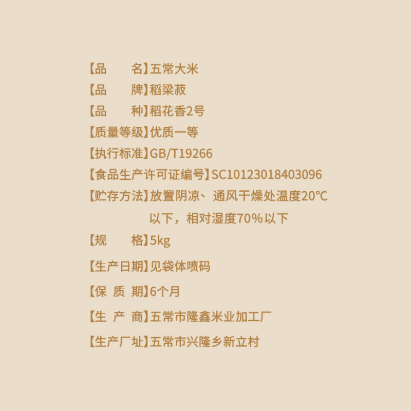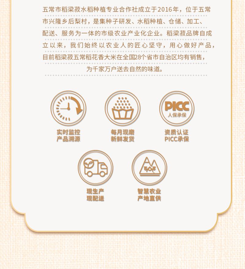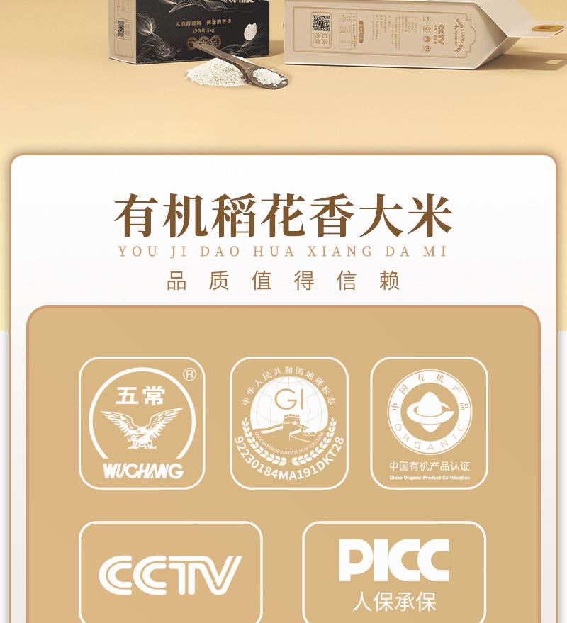 包装:真空袋装 执行标准:GB/T 19266 保质期:6个月 质量等级:优质一级 产地:黑龙江五常市 产品尺寸:300mm*240mm*80mm 推荐理由: 1、五常有机稻花香2号米。 2、PICC人保承保产品。 3、稻田24小时实时监控。 4、智慧农业系统。 5、当月现磨新米发货。 6、独立溯源码。 7、双层真空保鲜。