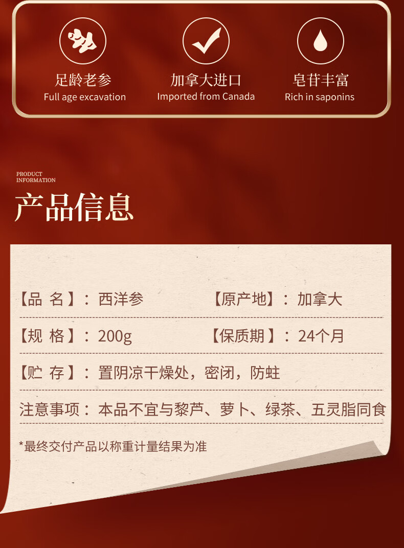 [原产地]:加拿大 [规格]:200g 【保质期]:24个月 [贮存]:置阴凉干燥处,密闭,防蛀 注意事项:本品不宜与黎芦、萝卜、绿茶、五灵脂同食