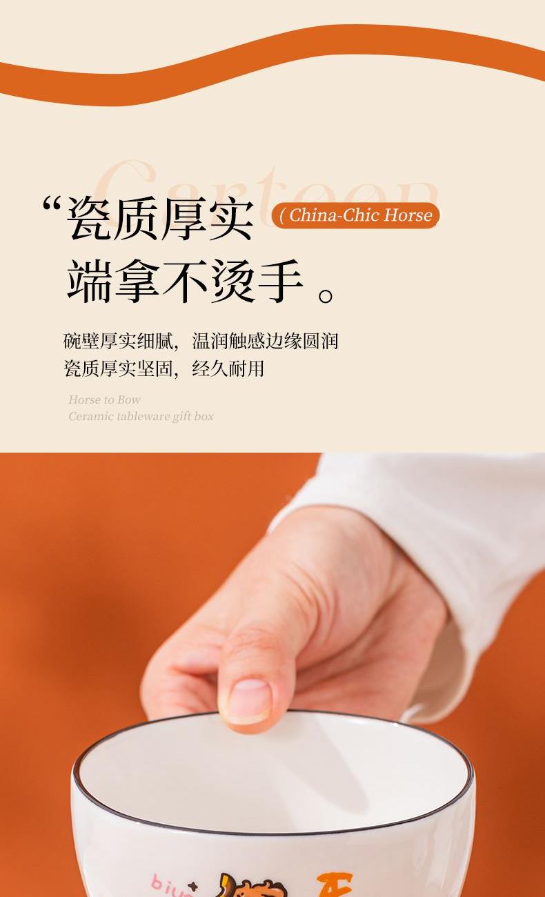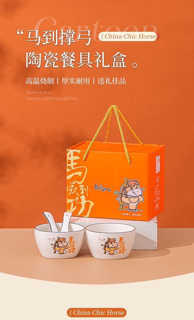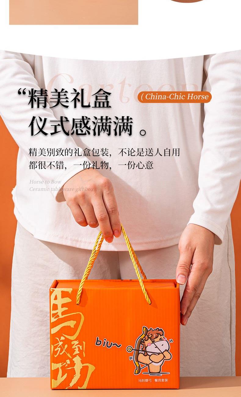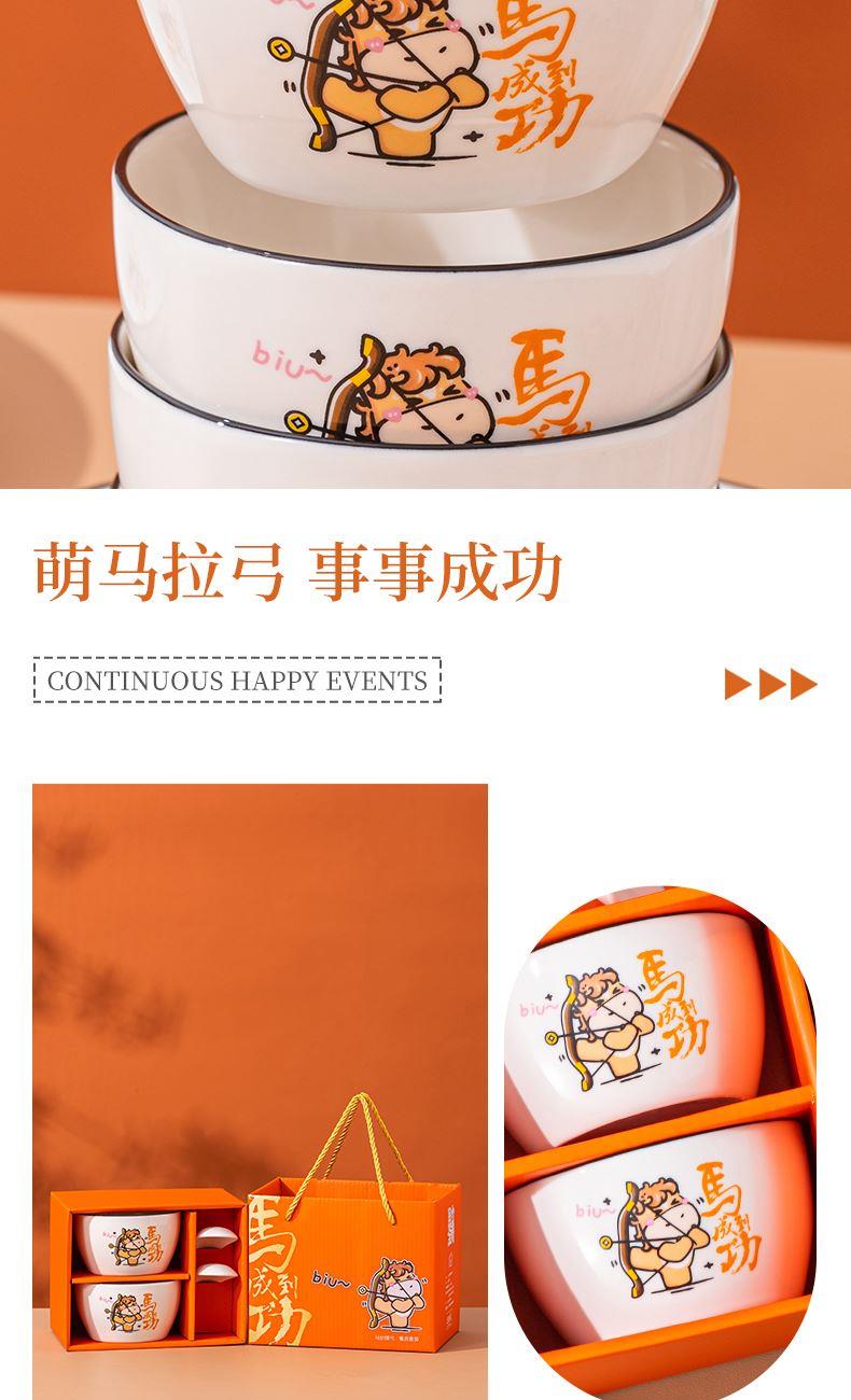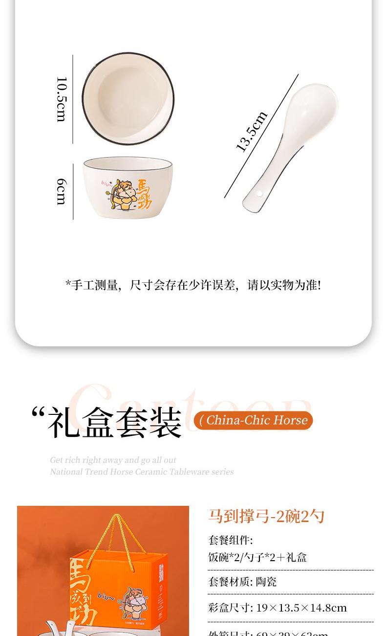 产品组成:整套=2碗2勺 产品材质:强化瓷 产品规格:陶瓷碗=口径10.5cm,高度6cm;三弯勺=长13.5cm 彩盒尺寸:19×13.5×14.8cm 外箱毛重:29kg 外箱尺寸:69×39×62cm - 马到撑弓,事事成功 喜欢这种把祝福藏进小细节里的感觉!小马到撑弓的憨劲,小萌马攥着劲拉弓的样子,连箭尖都像带着“能成”的底气。加上“马到撑弓 事事成功”这八个字,不管是贴在心里当念想,还是说给身边人听,都像在说“别怕用力,你想成的事,都会顺着这股劲成了”,简单却特别戳心。新的一年都能跟着这股攒劲的劲儿,件件成、事事顺。