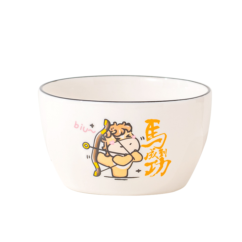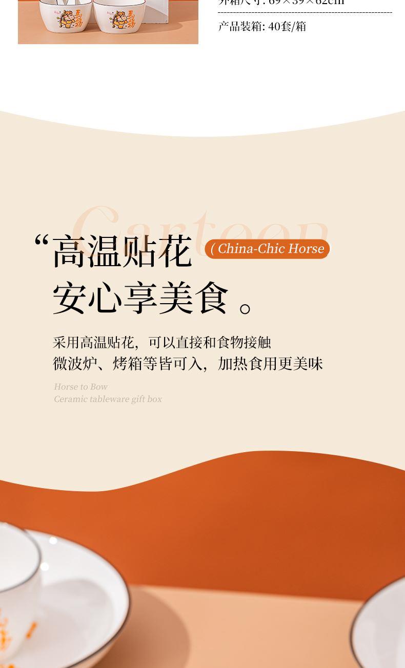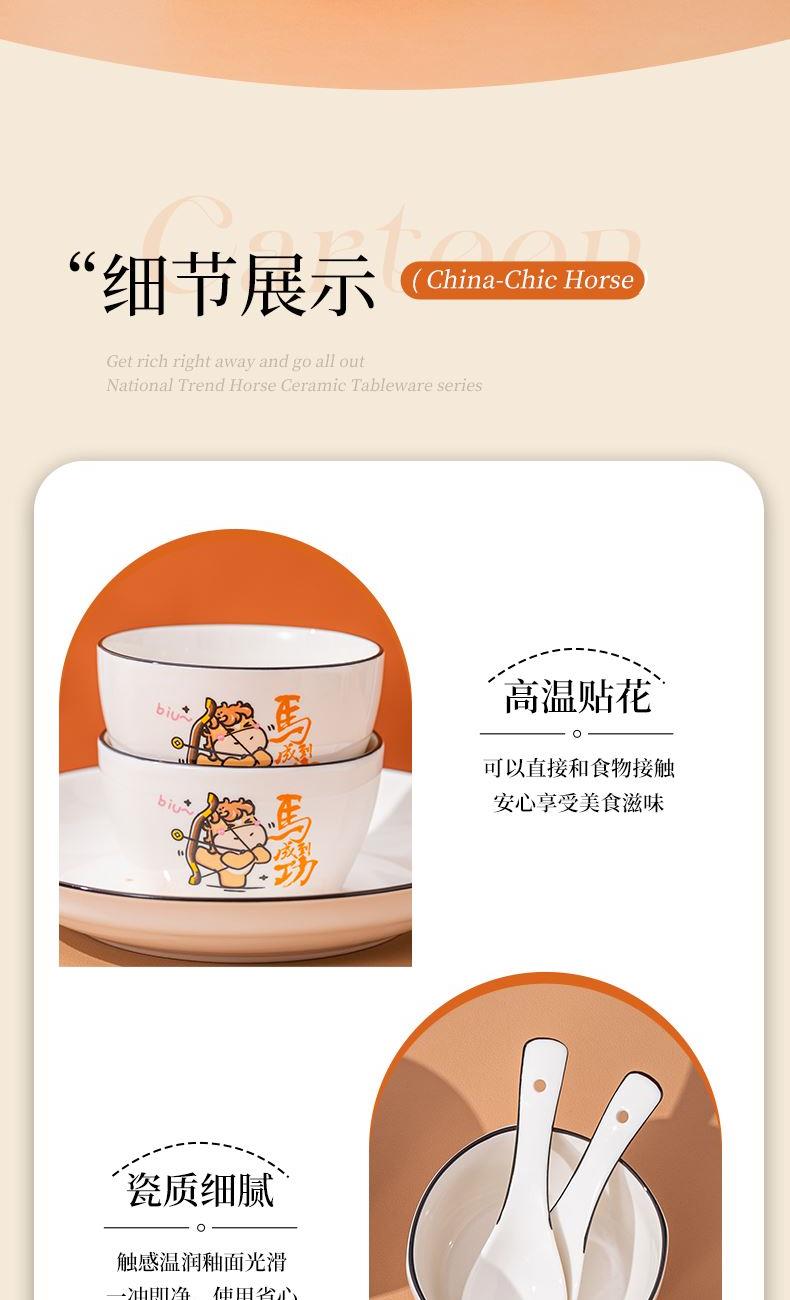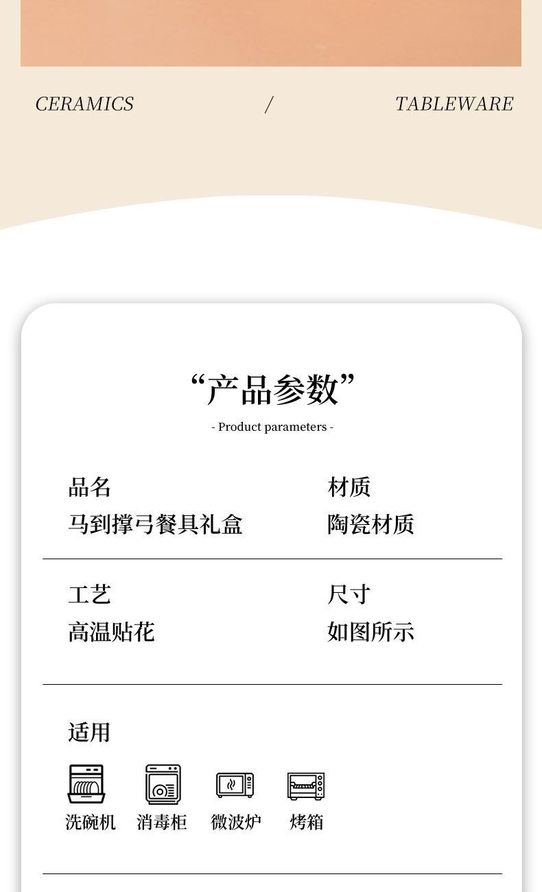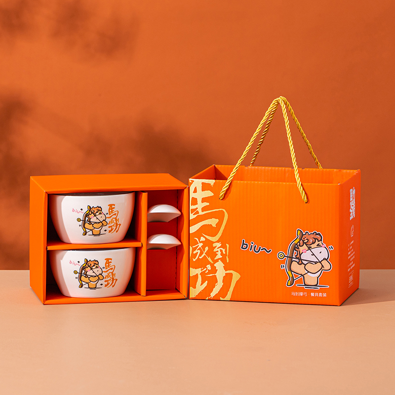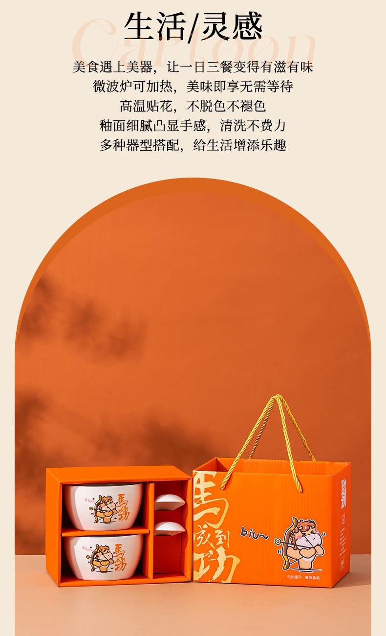 产品组成:整套=2碗2勺 产品材质:强化瓷 产品规格:陶瓷碗=口径10.5cm,高度6cm;三弯勺=长13.5cm 彩盒尺寸:19×13.5×14.8cm 外箱毛重:29kg 外箱尺寸:69×39×62cm - 马到撑弓,事事成功 喜欢这种把祝福藏进小细节里的感觉!小马到撑弓的憨劲,小萌马攥着劲拉弓的样子,连箭尖都像带着“能成”的底气。加上“马到撑弓 事事成功”这八个字,不管是贴在心里当念想,还是说给身边人听,都像在说“别怕用力,你想成的事,都会顺着这股劲成了”,简单却特别戳心。新的一年都能跟着这股攒劲的劲儿,件件成、事事顺。