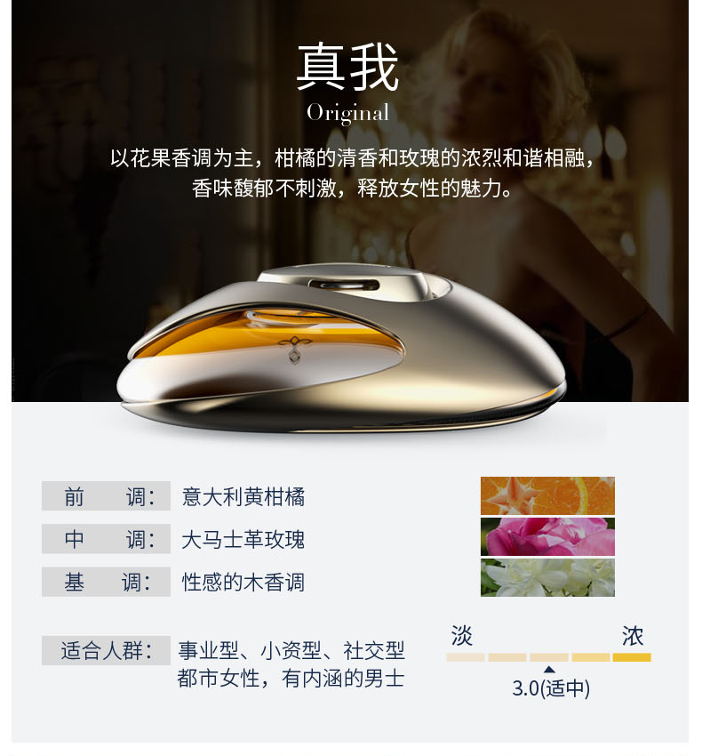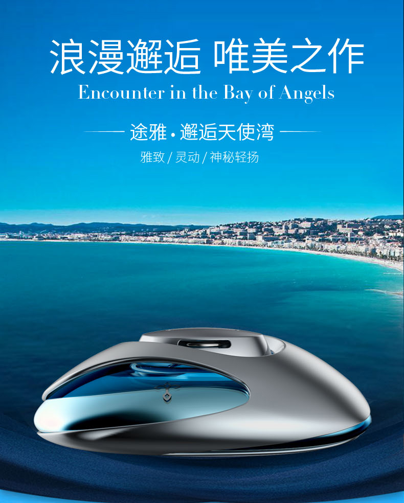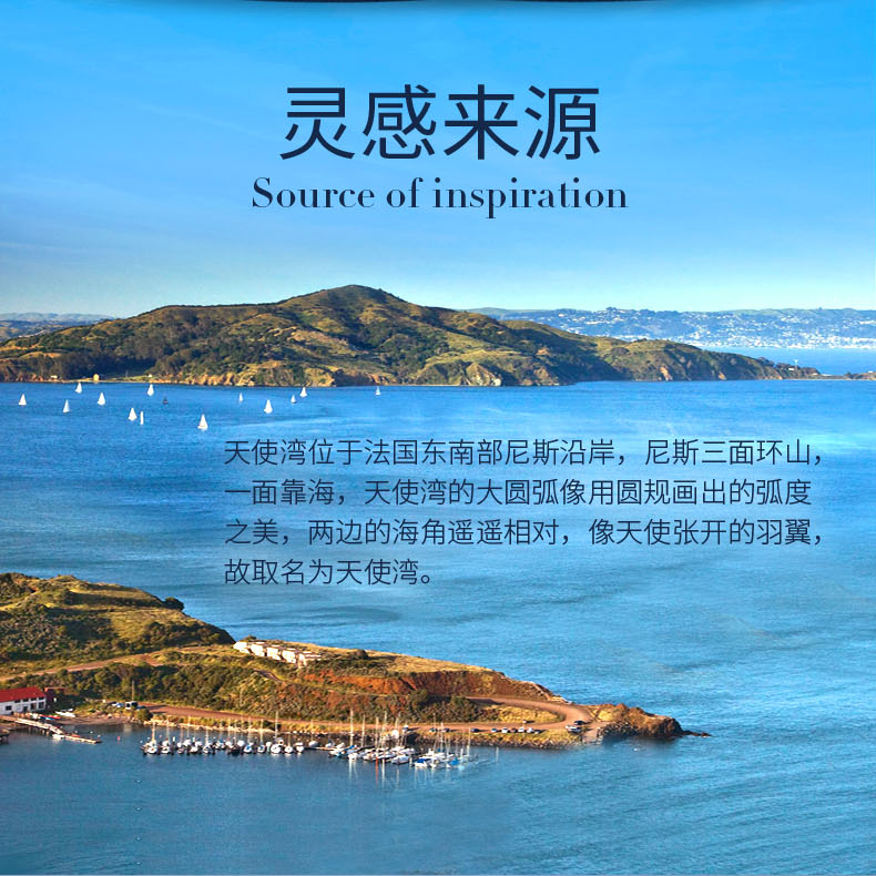 邂逅天使湾设计灵感来自法国地中海沿岸绚烂的海湾——天使湾,轻扬的弧形瓶身犹如天使的羽翼遥相呼应,温暖地拥抱着一片蔚蓝和金色的海岸,温柔中透露着性感。琥珀男士香水以浓郁复杂的琥珀香调为基础,搭配干净清新的百里香、茉莉、丁香,呈现出大胆清新、抽象神秘的阳刚性感味道。浓郁的琥珀香与清新的花果香形成对比,让此款香水充满惊奇和诱惑,为懂得欣赏复杂香味,有魅力的男士量身定制。