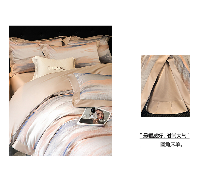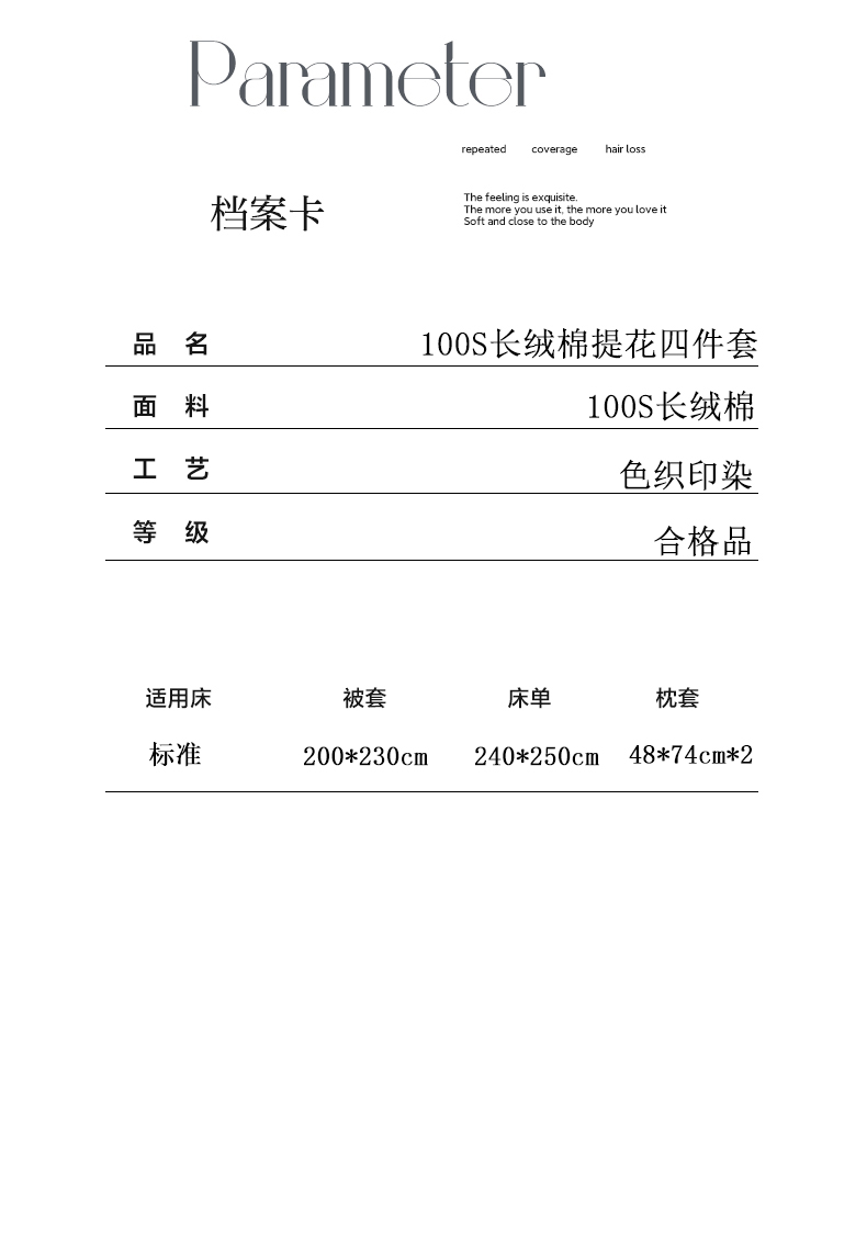被套:200*230cm 床单:240*250cm 枕套:48*74cm*2 面料:100S长绒棉 特点:采用长绒棉棉高密活性印染,洗后不易脱色、不变形、不起球,依然如新。绿色无污染,手感细腻柔软,经纬额度均匀,面料厚实不起球,不缩水。