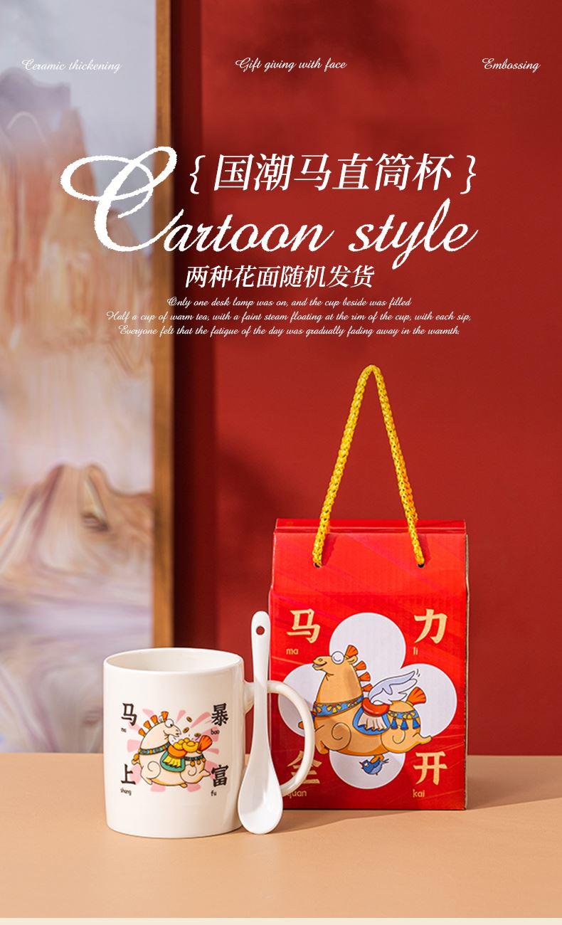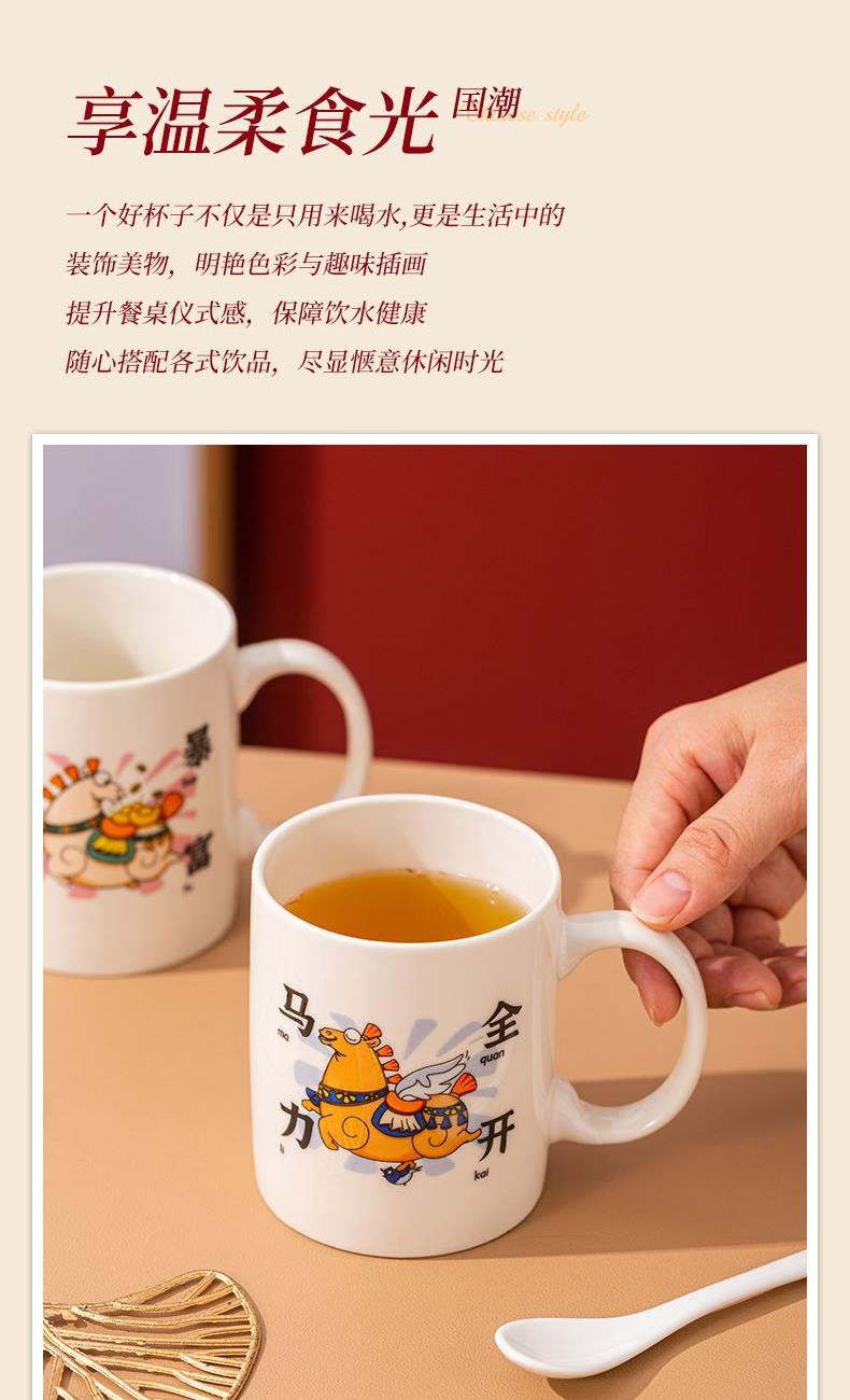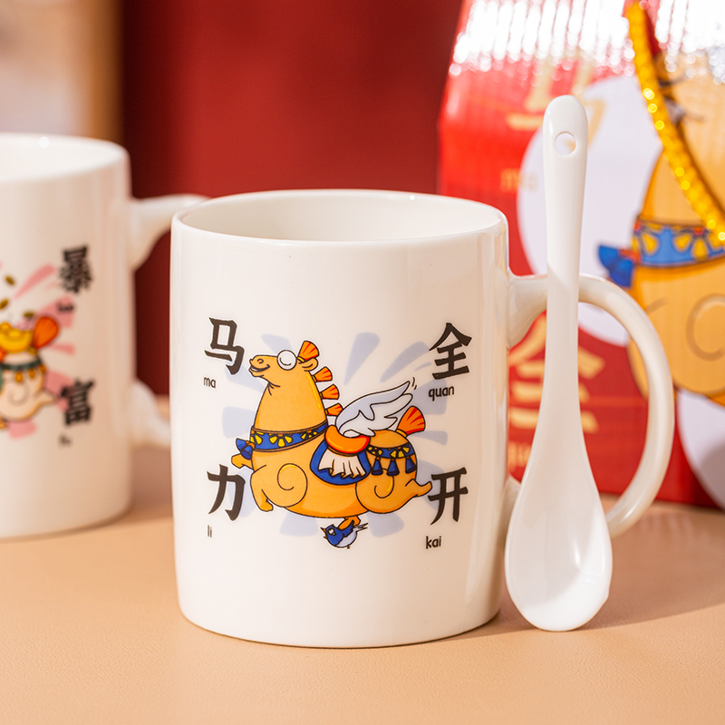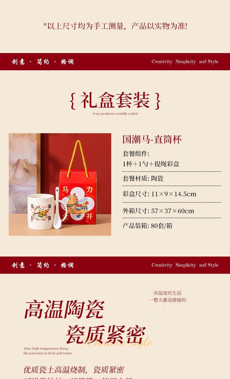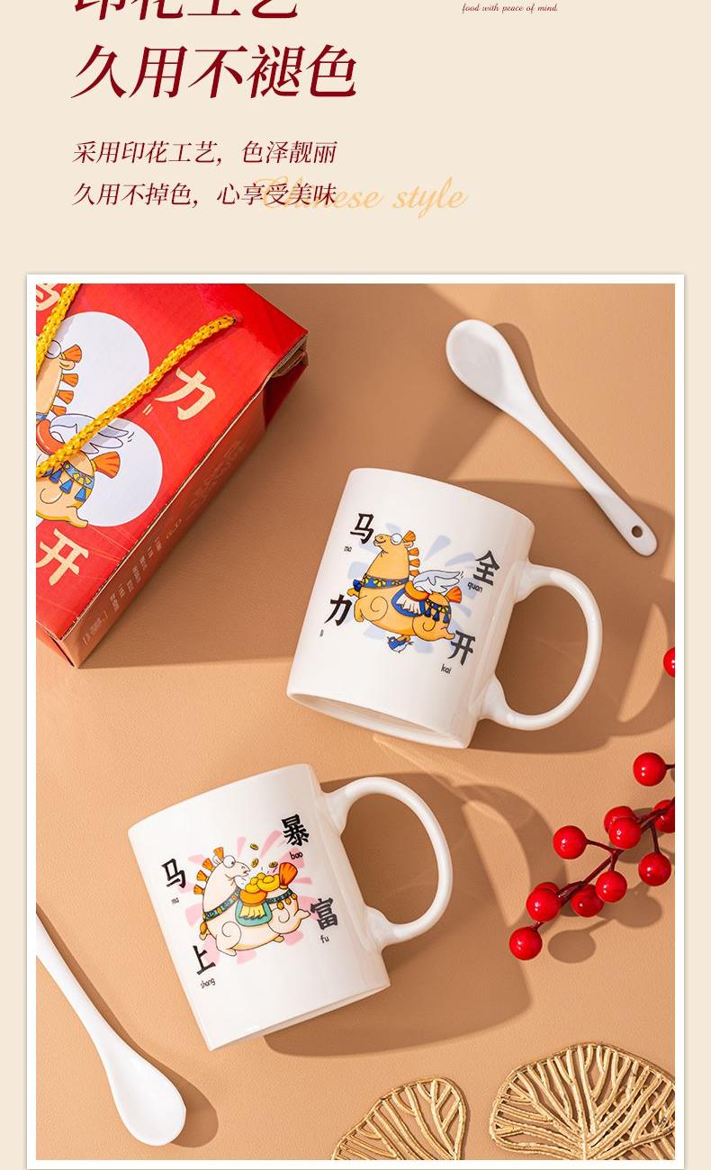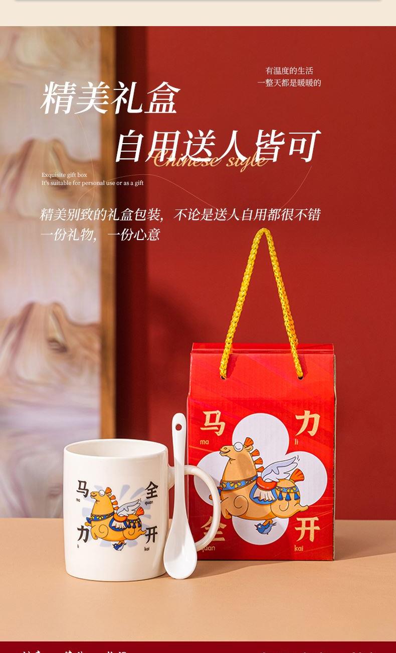 产品组成:整套=1杯+1勺+提绳彩盒 产品材质:镁质瓷 产品规格:杯=口径8cm,高度9.7cm;陶瓷勺=长度12.8cm 彩盒尺寸:11×9×14.5 cm 产品毛重:30kg 外箱尺寸:57×37×60cm --------- “活力十足+财运满满”双buff叠满的礼品套装! 「翼马踏燕」纹样灵动鲜活,仿佛骏马振翅带风,踏出满室生机;不是老气的纹样,反而有点卡通新国风那味儿,摆桌上直接拉满视觉张力;让人新的一年活力十足,马力全开。 「元宝驮马」图案精致讨喜,圆润金元宝衬着矫健骏马,一眼见财气。马上驮的金元宝更绝,画得圆滚滚还带点小俏皮,像刚从“财富星球”运回来的,看着就超有范!!!