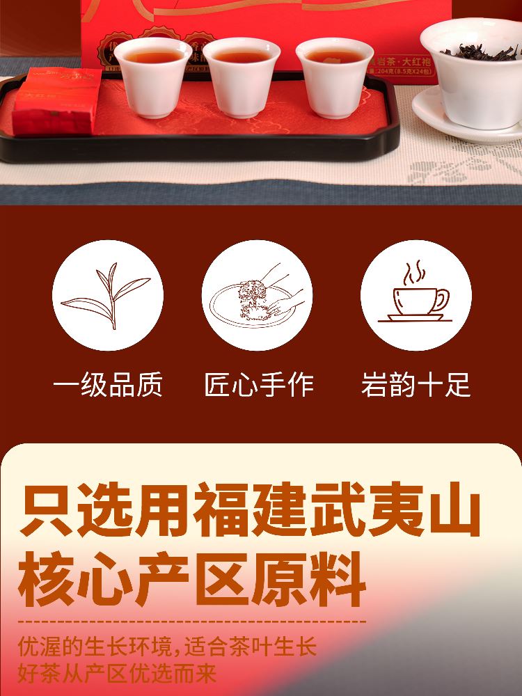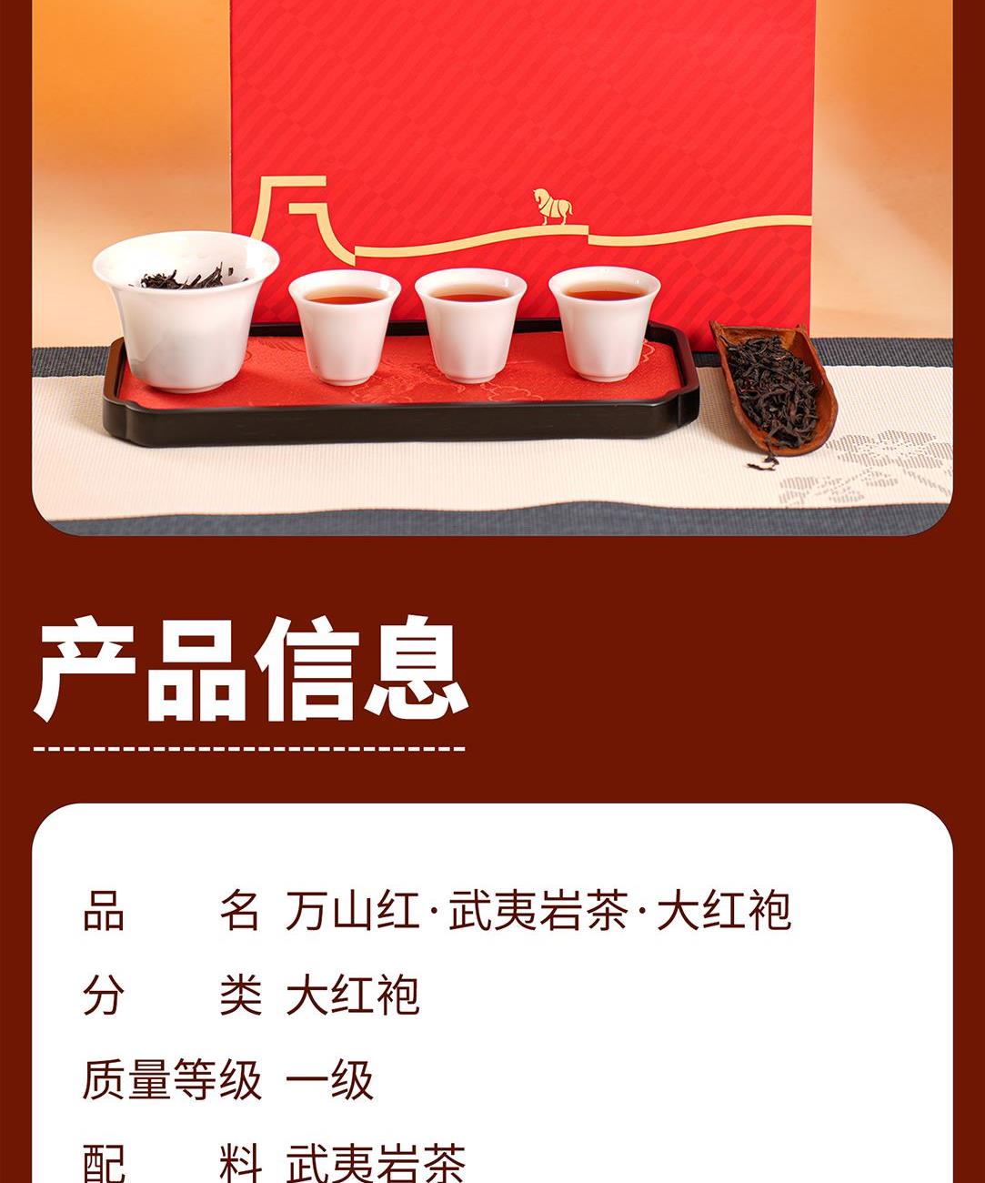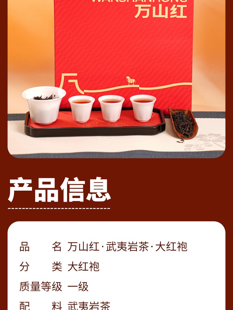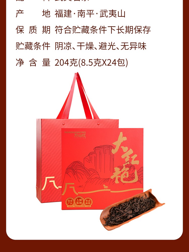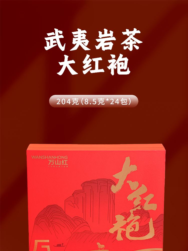 礼盒内配: 万山红武夷岩茶大红袍204克 净含量:204g 单罐内配:大红袍300克 净含量:300g 推荐理由: 自饮一罐,送礼一盒 推荐理由; - 自饮优选:对于喜爱武夷岩茶的消费者,其地道的焙火工艺和醇厚口感,能充分展现大红袍的岩骨花香,无论是日常品饮还是收藏品鉴,都能带来优质体验。 - 礼赠佳品:实力强、产地正宗且包装喜庆有格调,传递品质与心意的同时,能满足春节、中秋等传统节日,以及商务馈赠、亲友互赠的礼赠需求,彰显品味与诚意。