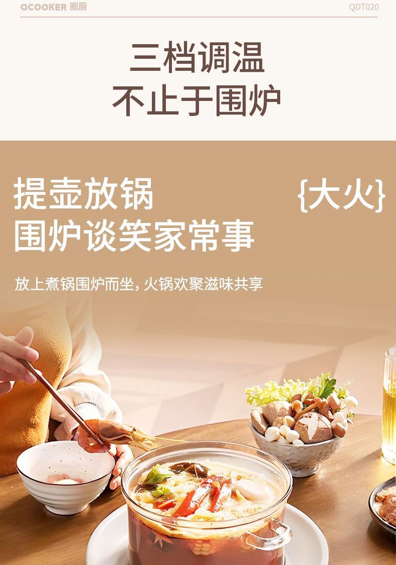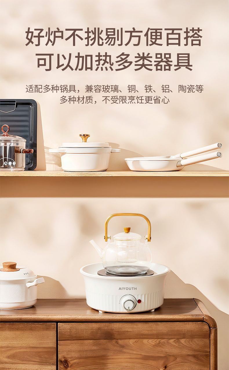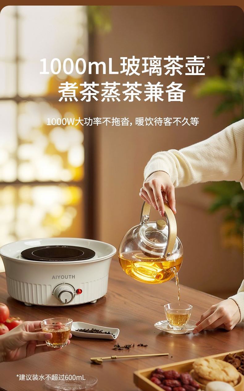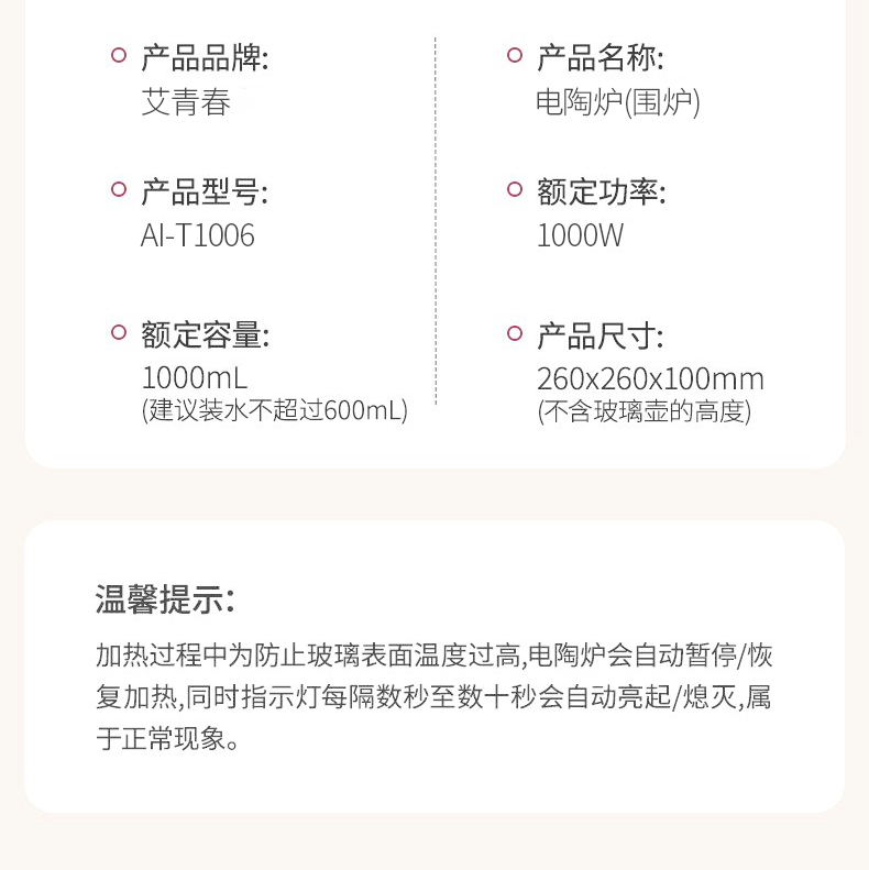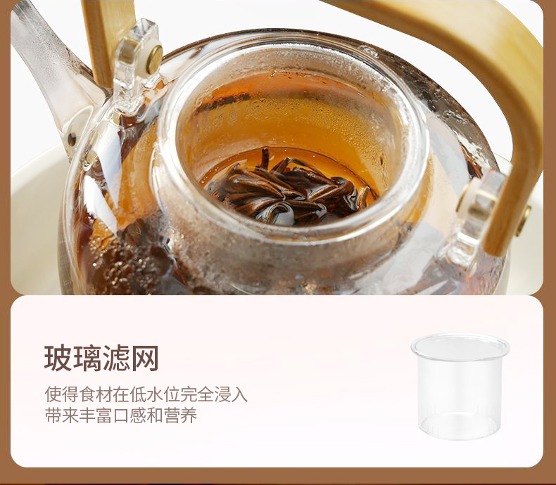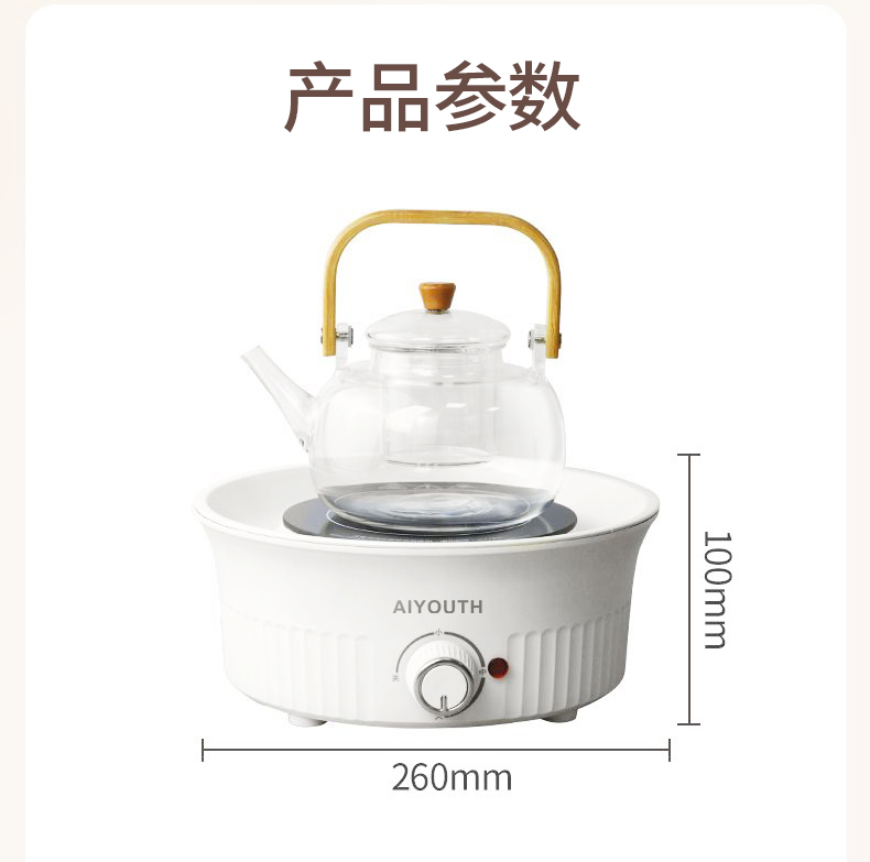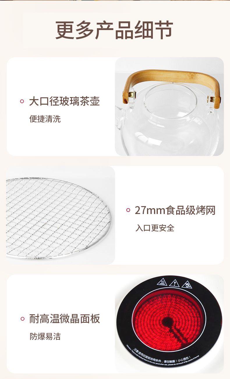 额定电压:220V~ 额定频率:50HZ 额定功率:1000W 产品毛重: 2.5kg 产品颜色:橙色 包装尺寸:315*315*171mm 包装清单:实机、玻璃壶,烤网 、说明书 主要材质:微晶板 1.红外聚能,垂直加热 2. 适配耐高温茶壶,适合多种常见壶具 3. 可蒸煮多种茶叶,不串味,茶味更醇 4. 三档火力调节,旋钮操控,控温更贴心 5. 黑晶面板,防水抗压,抗高温,易清洁