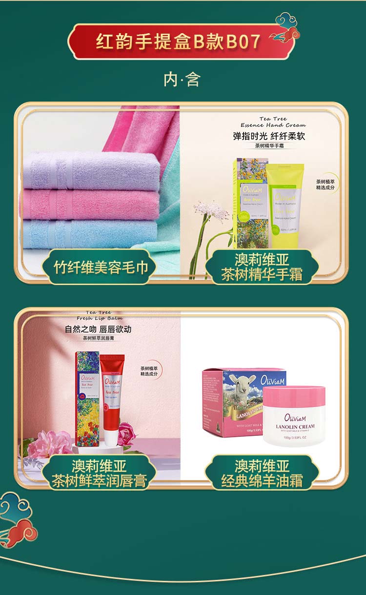 内含: OLIVIAM澳莉维亚茶树精华手霜*1 OLIVIAM澳莉维亚茶树鲜萃润唇膏*1 OLIVIAM澳莉维亚经典绵羊油霜*1 爱竹人竹纤维美容毛巾*2 澳洲原装进口:美妆新品 京东自营5W+销量 2025抖音小红书畅销产品 搭配爱竹人竹纤维毛巾 实用 美观 高颜值 开门红 节日礼品 随手礼 劳保 福利 积分兑换 一件代发