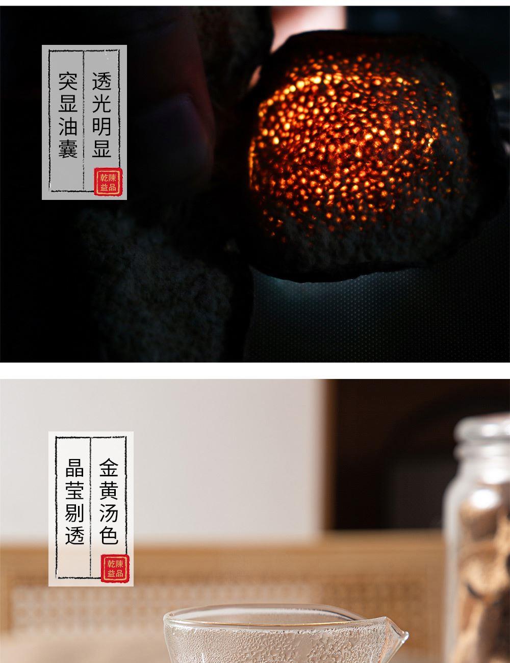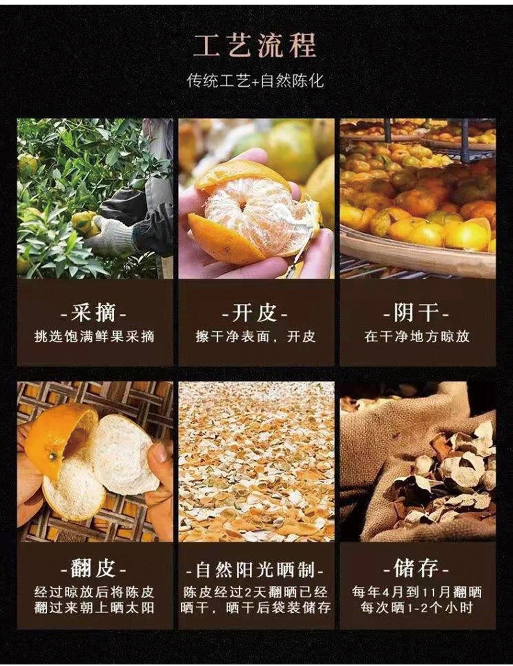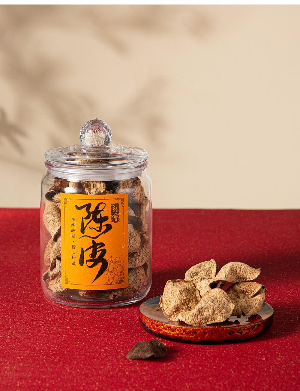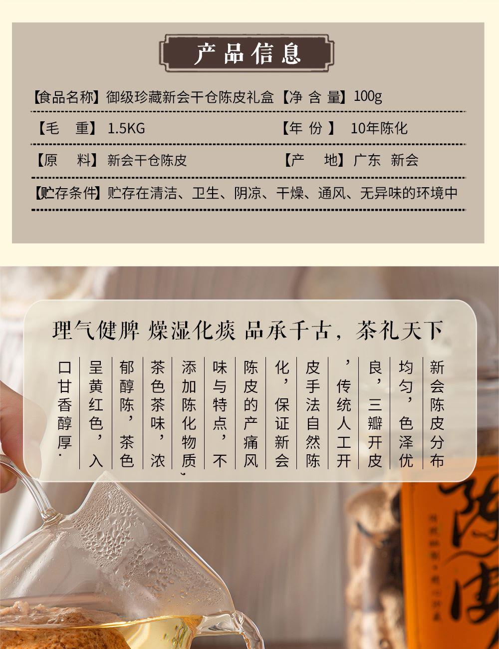 产地:广东新会 原料:新会产区二红皮 净含量:100g 毛重:1.5KG 特点:干仓陈化,药香二红皮,香气浓郁,口感清甜回甘 1.采用广东新会产区茶枝柑“二红皮”10年陈化原料 2.从采收,洗选,开皮,翻皮到晒皮贮存与陈化等每一个环节都坚持人手工制作,精心挑选。 3.礼盒+玻璃密封罐结合设计,质感满满,更易保存收藏 4.药香二红皮,香气足,回甘快,口感清凉,且非常适合后期保存陈化和应酬多的人群饮用。 5.陈皮需要存放在阴凉干燥处,避免潮湿环境。