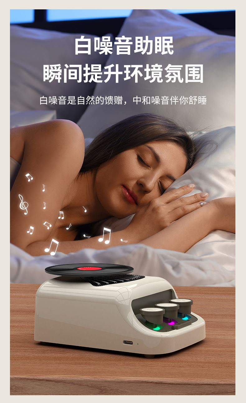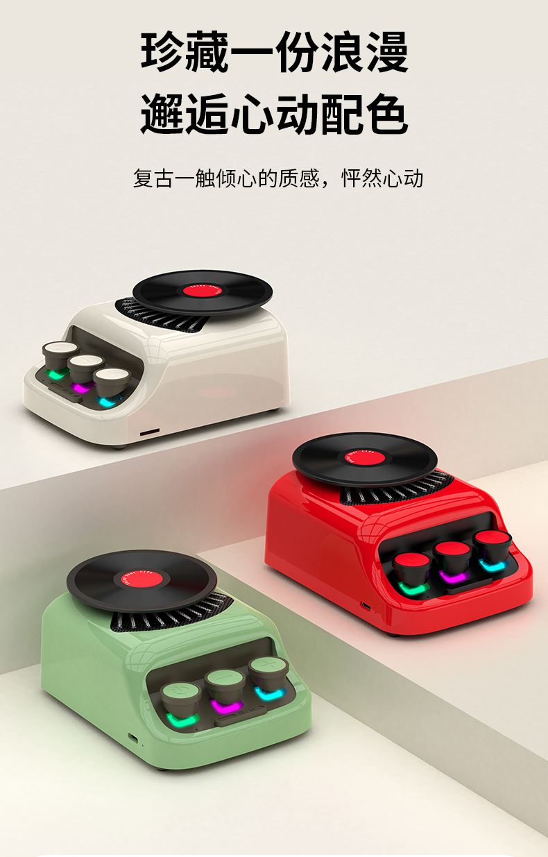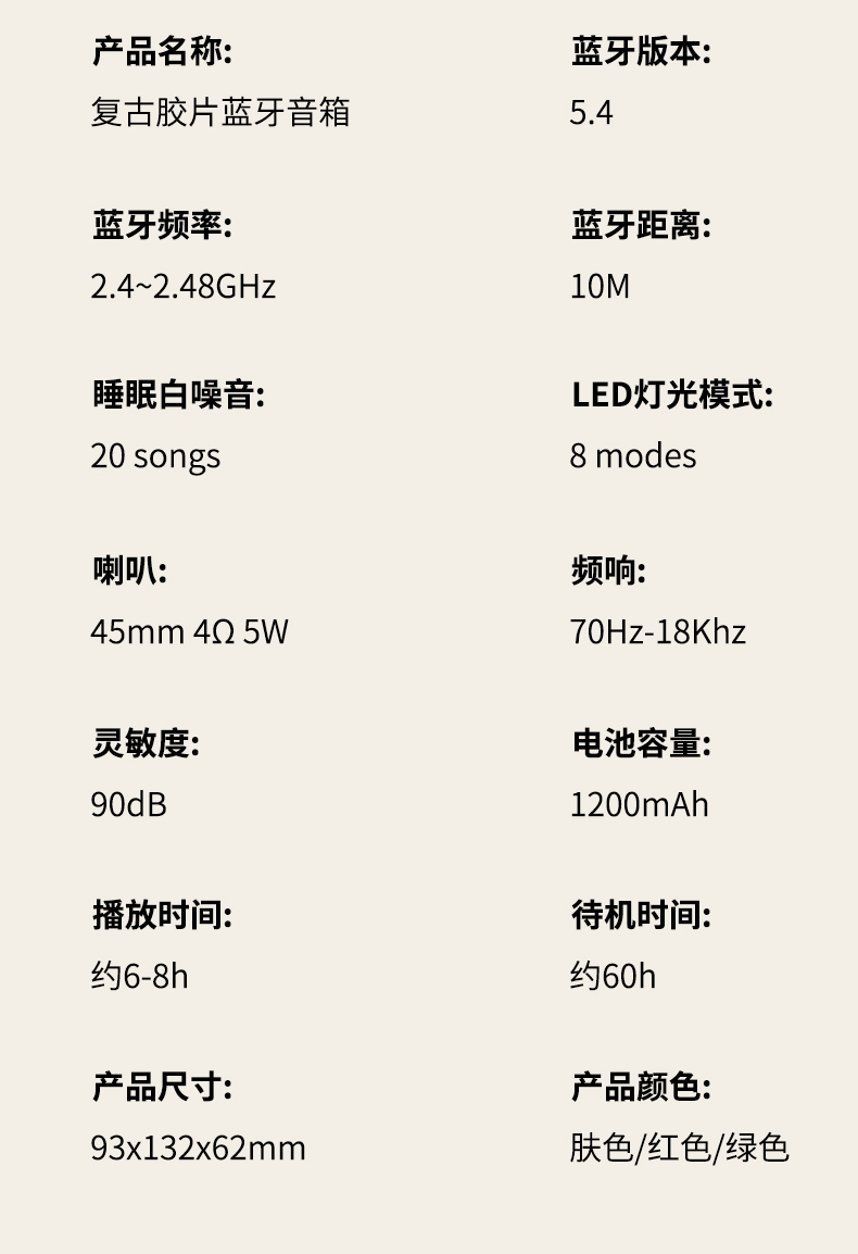 复古碟片香薰睡眠蓝音箱 Z18 颜色:米色 绿色 红色 音响功率:5W 材质:ABS+PC 电池容量:1200毫安 尺寸:93x132x62mm 包装尺寸:161x132x81mm 包装:彩盒包装 【功能特点】: * 碟片香薰* :碟片转动时香气满屋 * 助眠* :20首白噪音带您进入深睡 *按键解压*:三个机械按键, *灯光:11种炫彩灯光模式 * 定制碟片:可上可加入自己风格元素 * 主要功能:蓝牙响 tf卡 助眠 香薰
