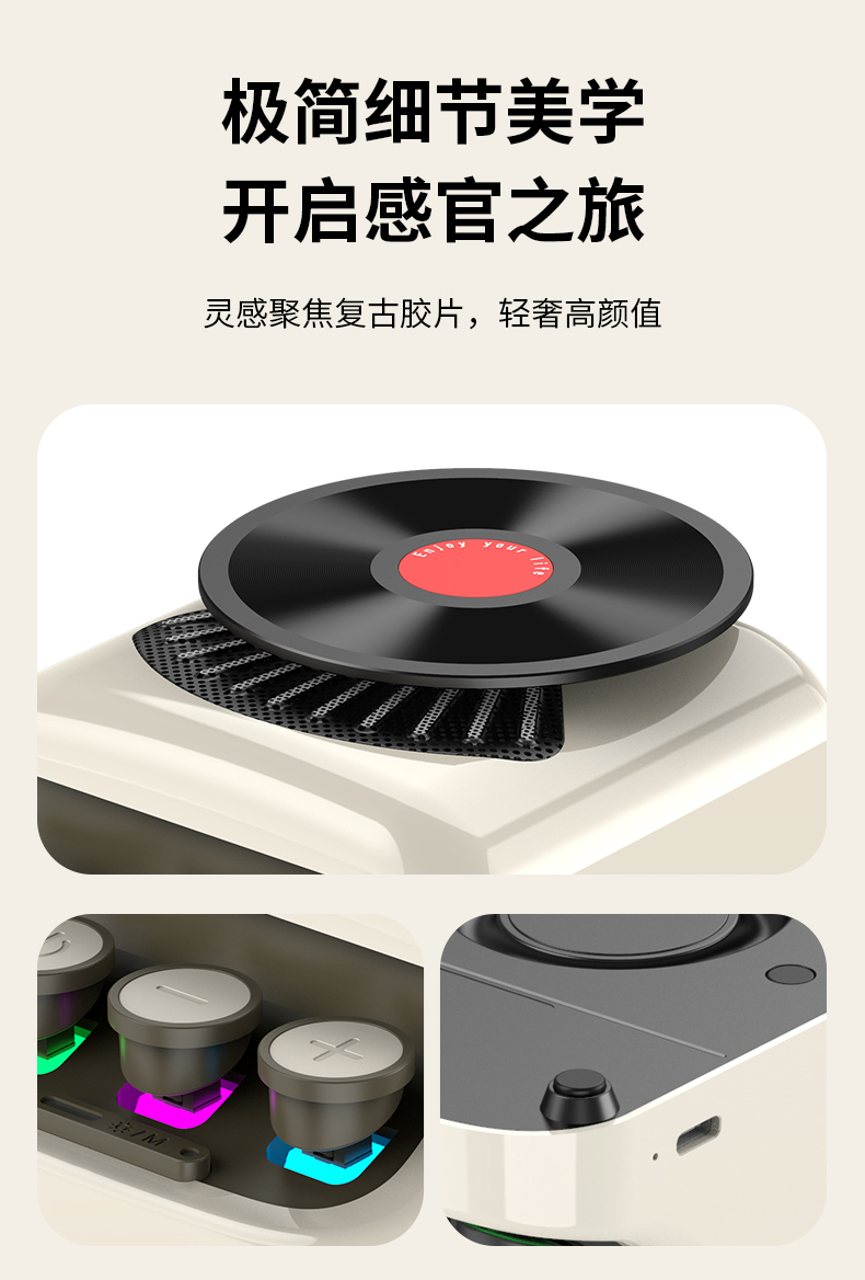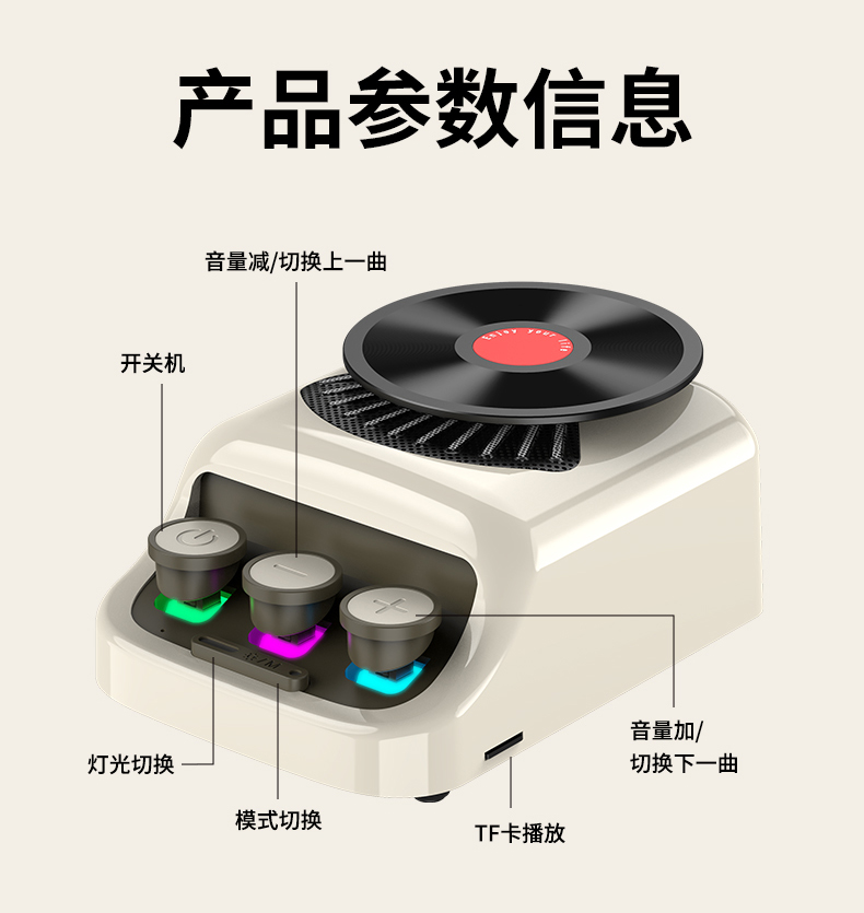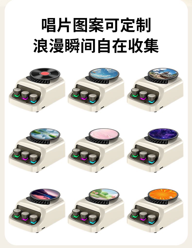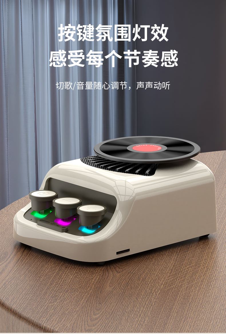 复古碟片香薰睡眠蓝音箱 Z18 颜色:米色 绿色 红色 音响功率:5W 材质:ABS+PC 电池容量:1200毫安 尺寸:93x132x62mm 包装尺寸:161x132x81mm 包装:彩盒包装 【功能特点】: * 碟片香薰* :碟片转动时香气满屋 * 助眠* :20首白噪音带您进入深睡 *按键解压*:三个机械按键, *灯光:11种炫彩灯光模式 * 定制碟片:可上可加入自己风格元素 * 主要功能:蓝牙响 tf卡 助眠 香薰