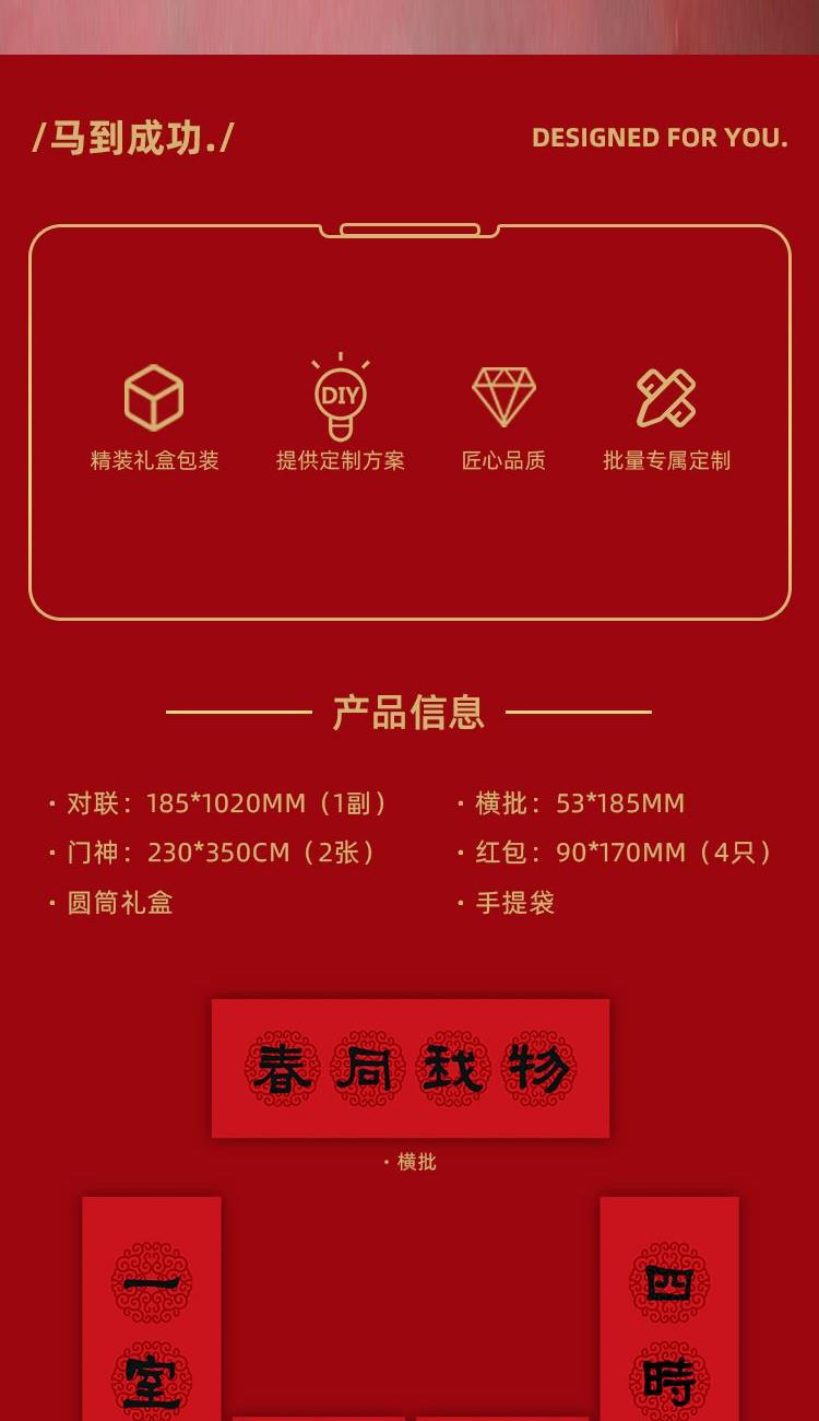 配置 春联185*1020cm*2 横批185*530cm*1 门神230*350cm*2 红包*4 圆筒礼盒手提袋*1 材质 撒金纸-触感纸 工艺:烫金 礼盒:255*80mm 撒金纸,圆筒式礼盒仪式感更强。新春物料一应俱全