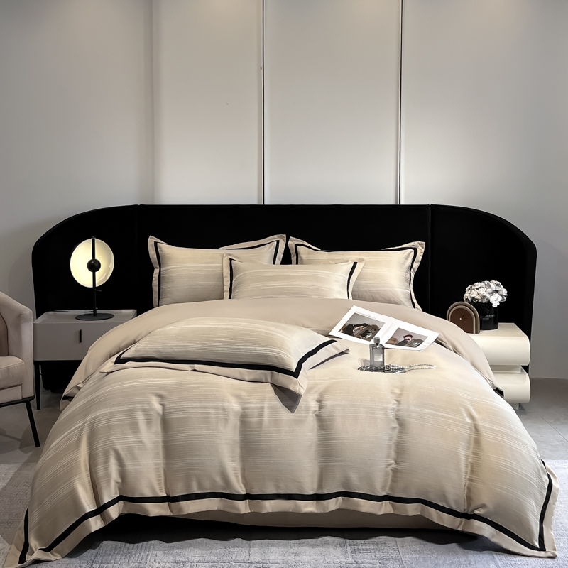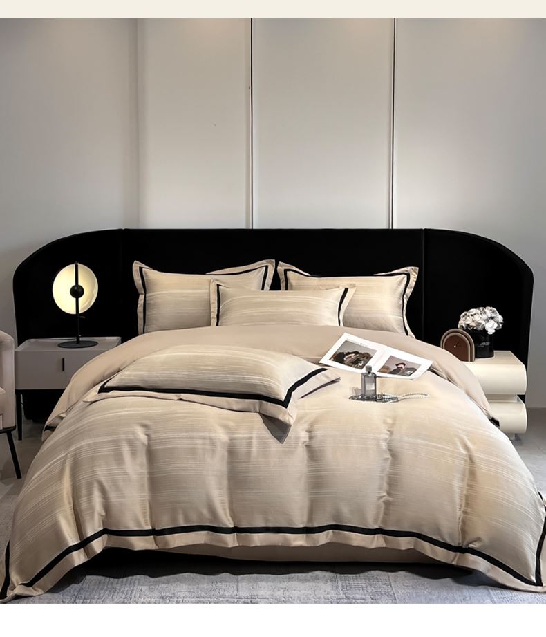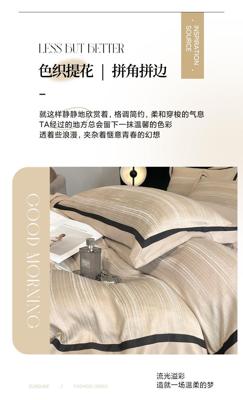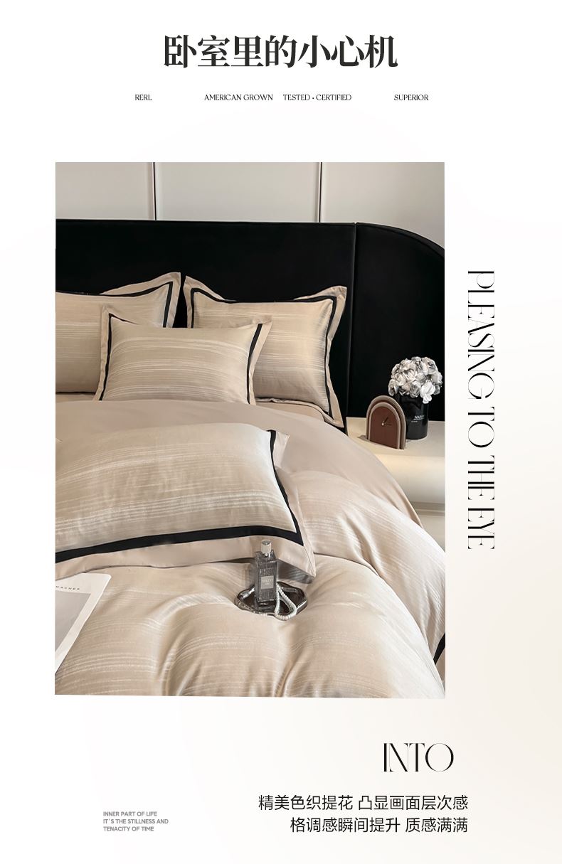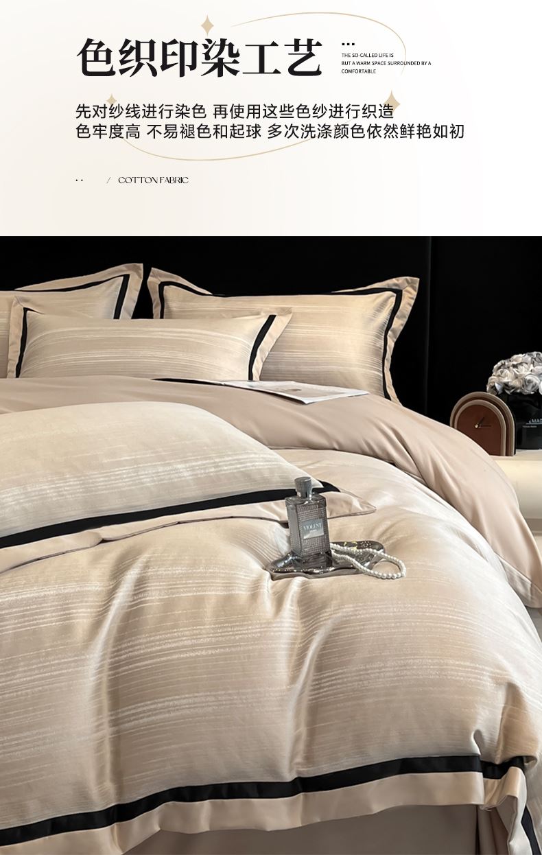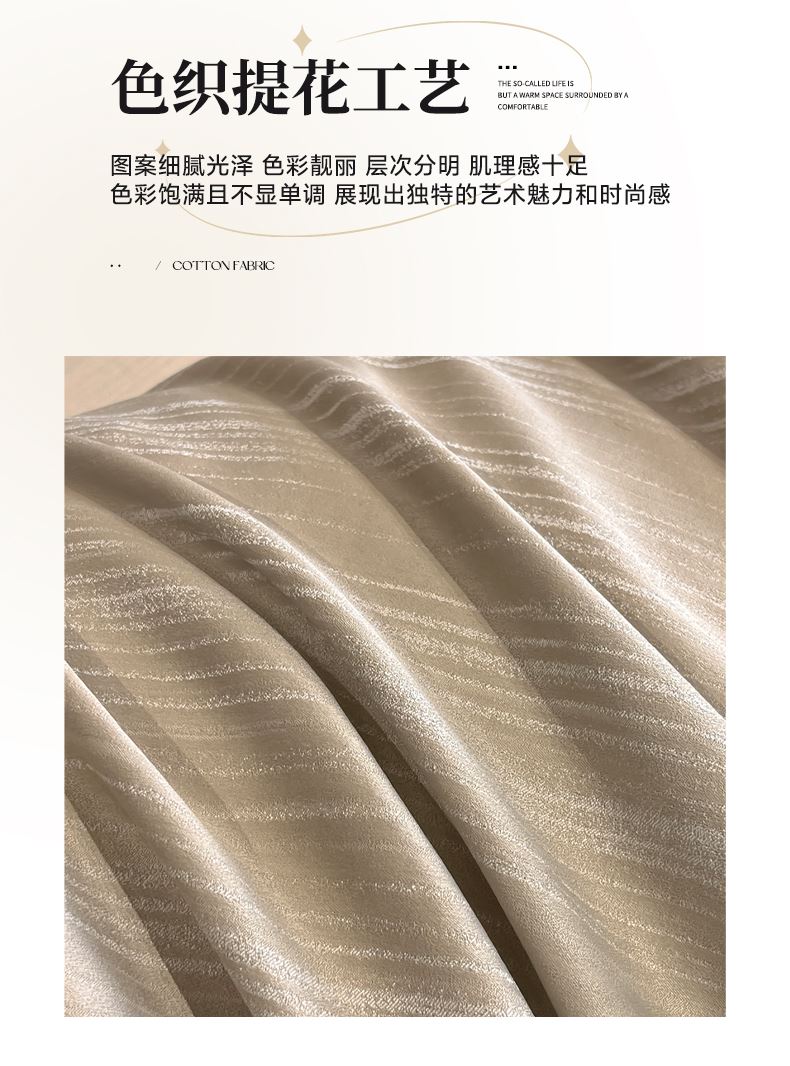 被套:200*230cm 床单:245*250cm 枕套:48*74cm*2 面料:色织提花 产品包装:精美礼盒 包装尺寸:43.5*33*10cm 1.色织提花质地柔软、细腻、爽滑,悬垂性及透气性好。 2.色织提花用于经典款式,更耐看,不易过时。