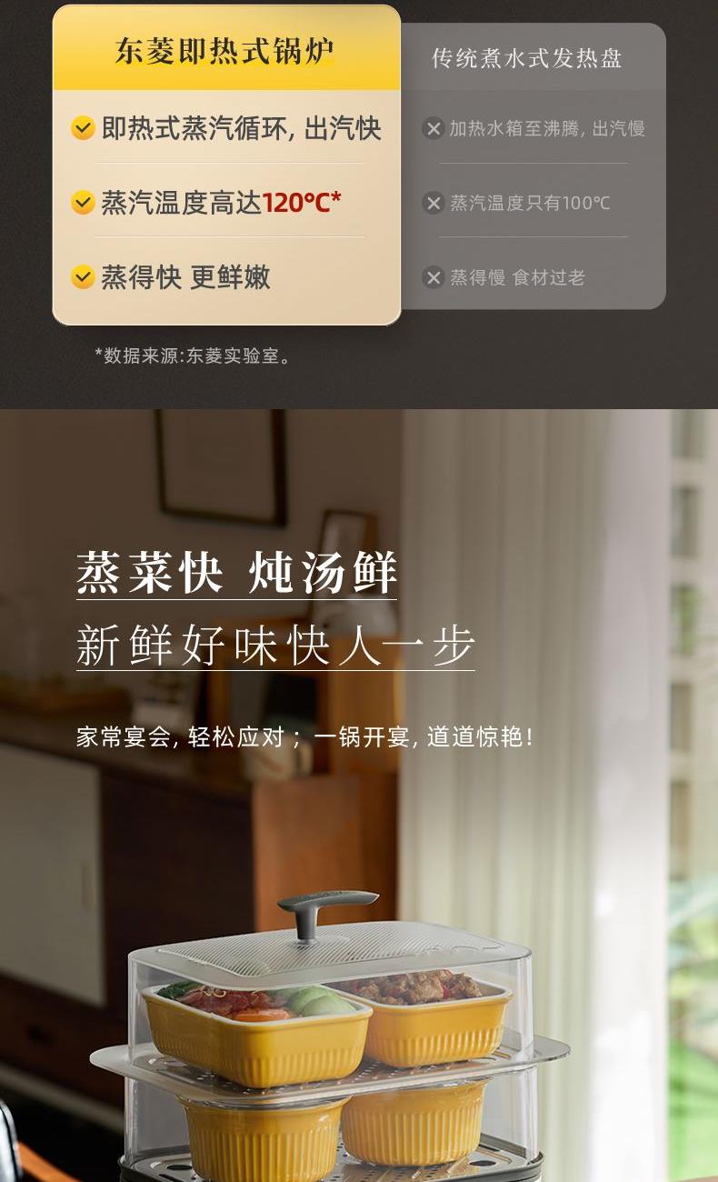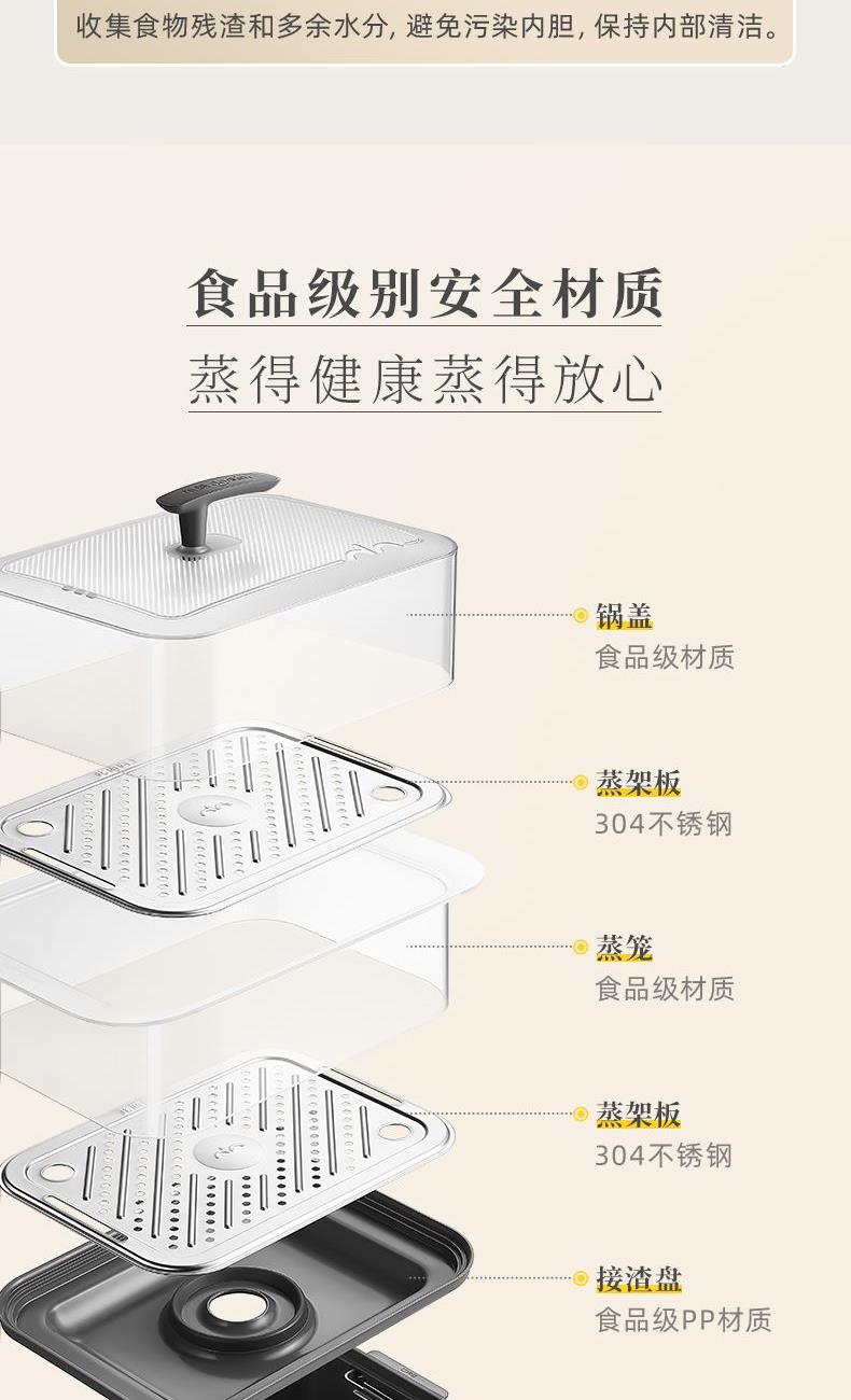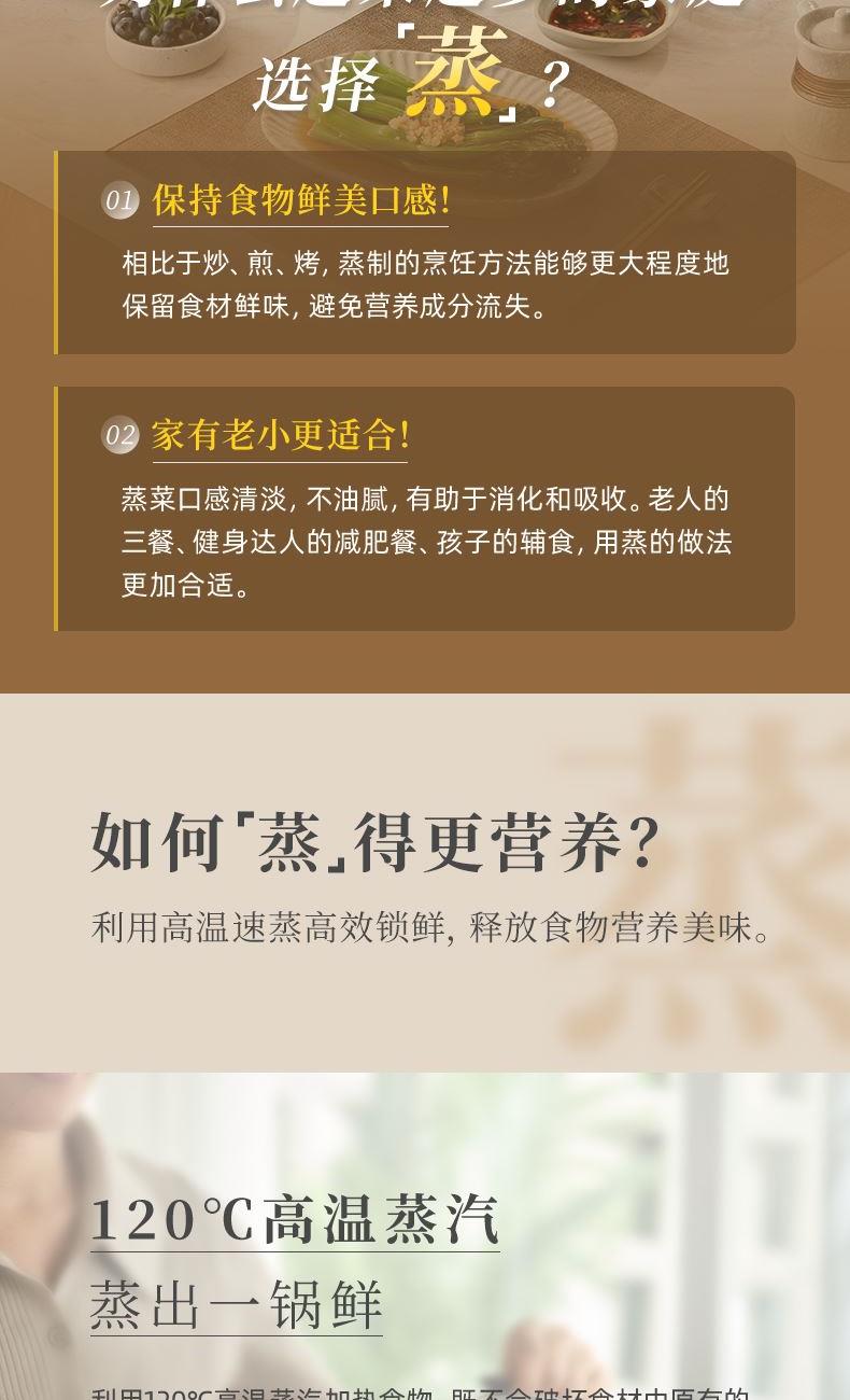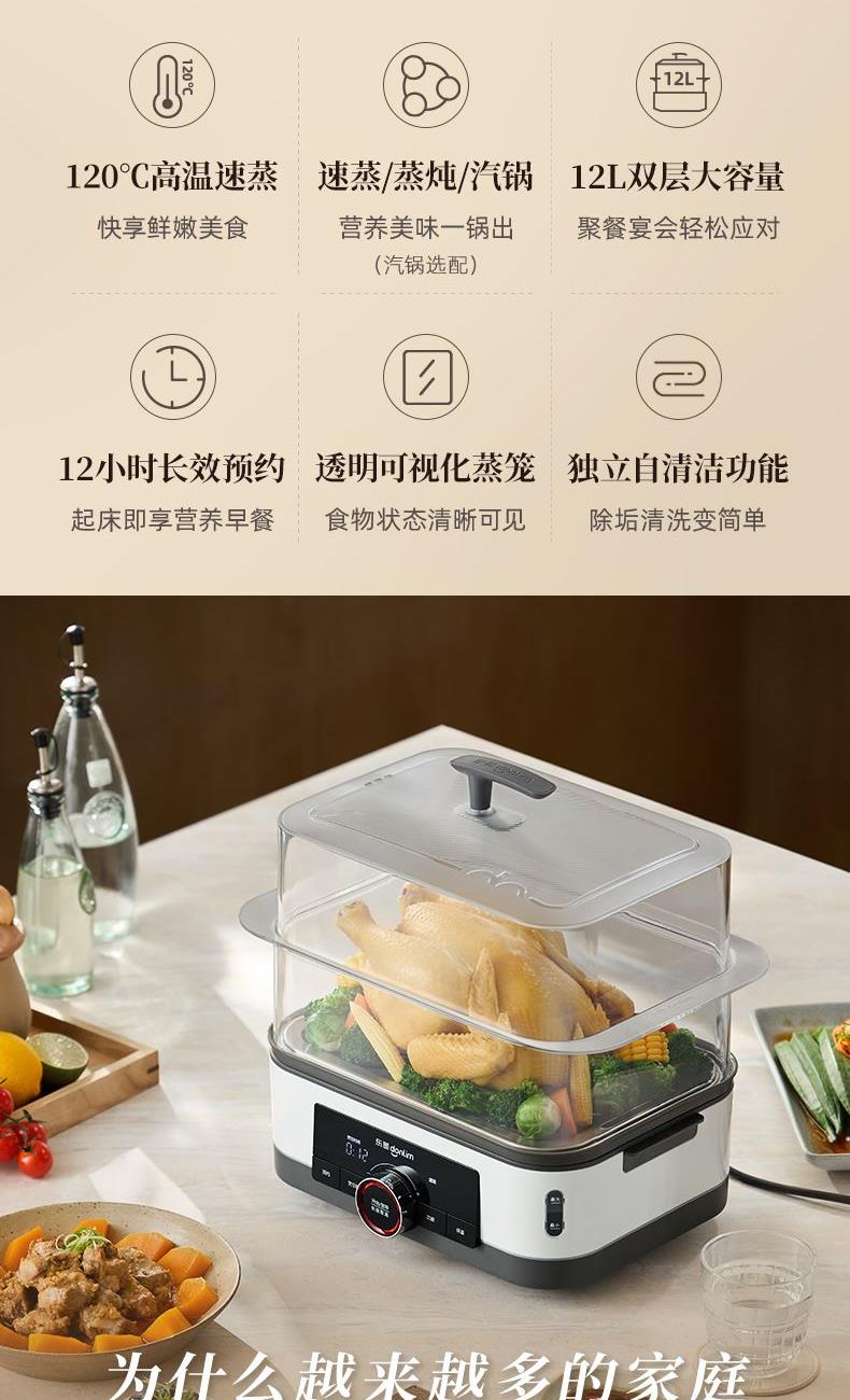 速蒸模式, 30秒快出120℃高温蒸汽,高温更锁鲜 透明上盖可观察食物加热状态 12小时智能预约,独立自清洁功能