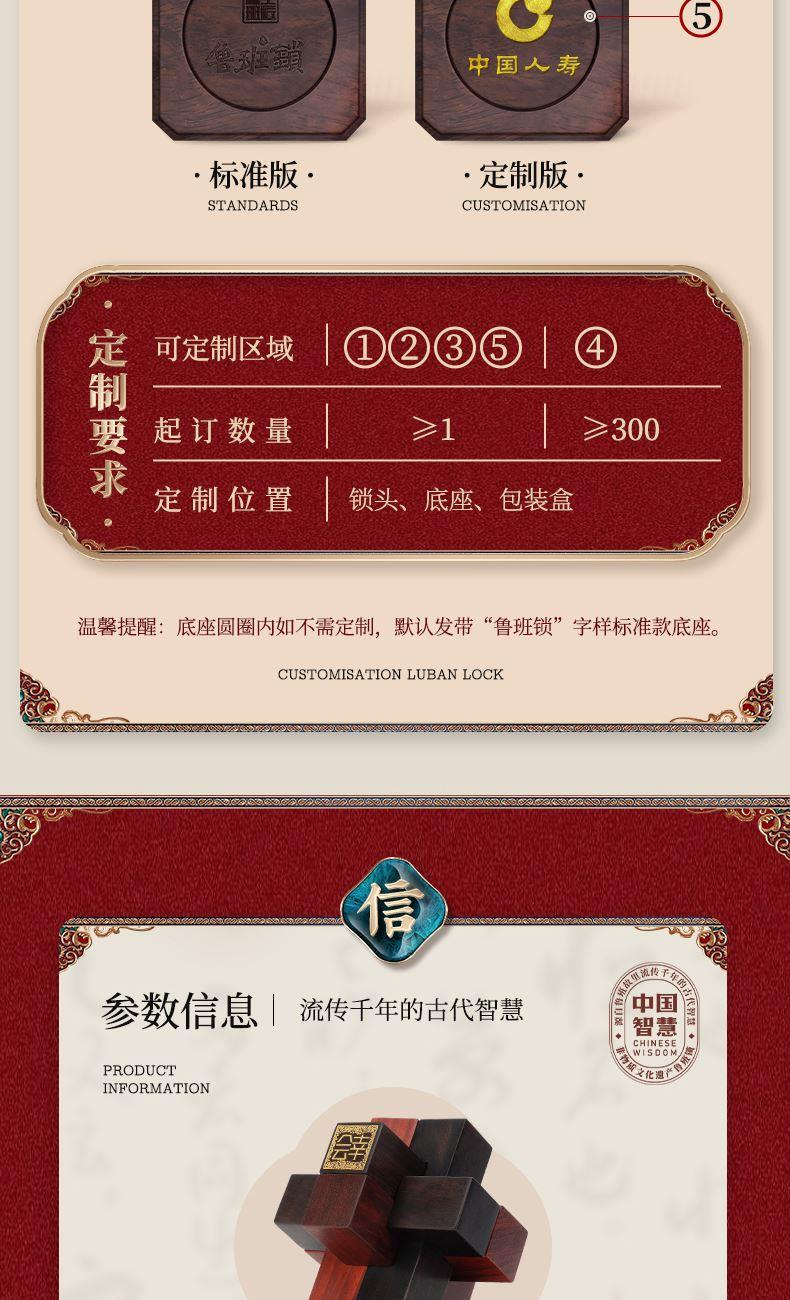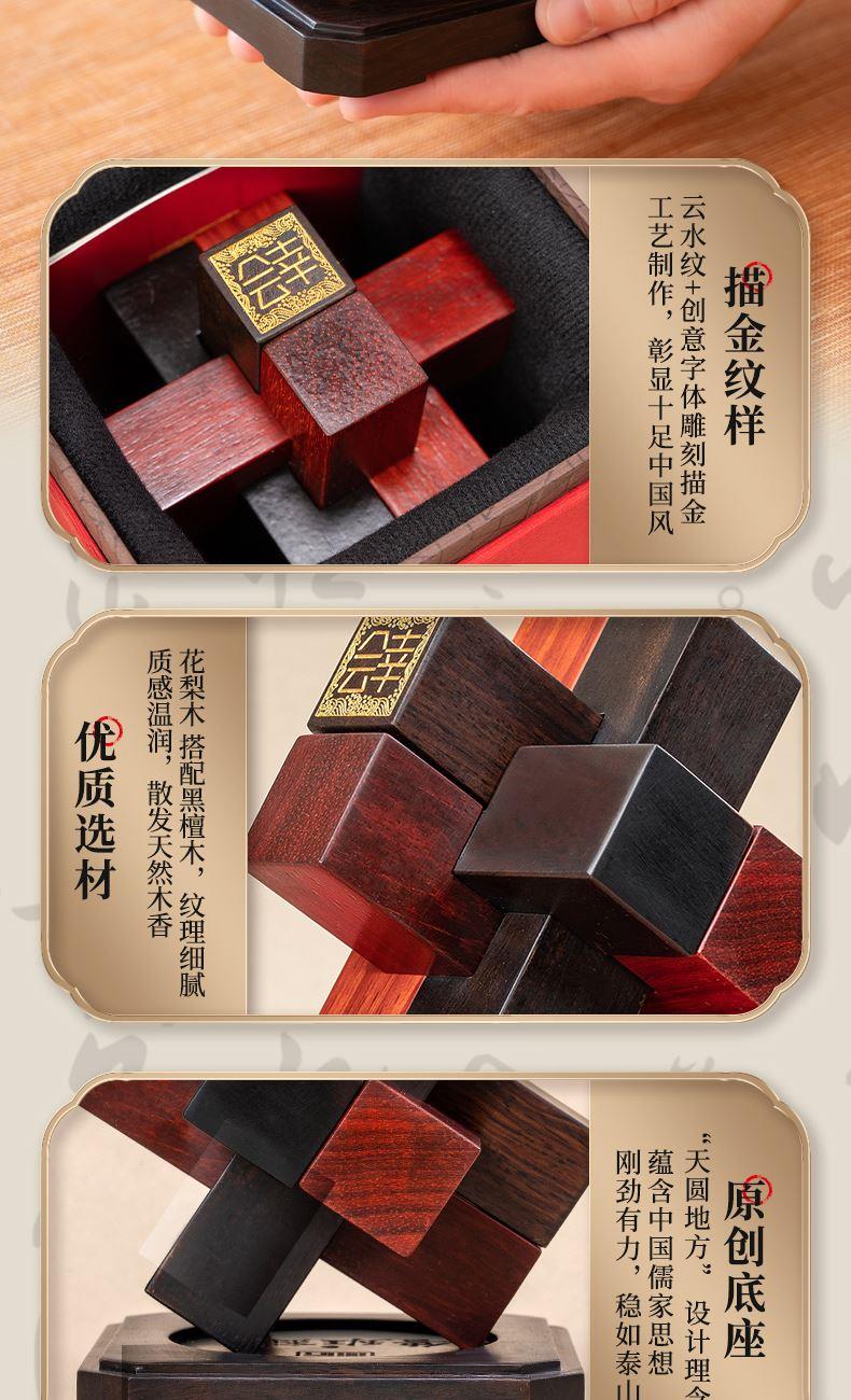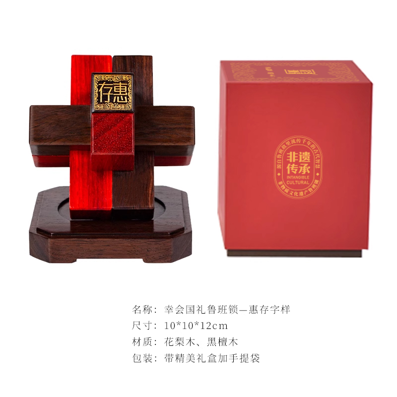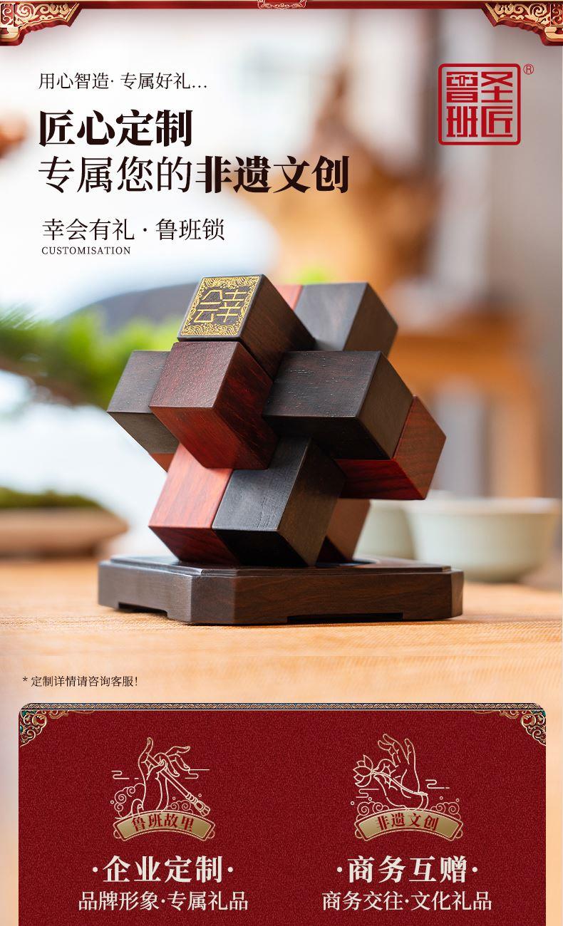 幸会有礼,情意绵长!这组幸会有礼鲁班锁,融合传统社交谦敬之辞:‘幸会’、‘有礼’、‘惠存’、‘久仰’,传递文化韵味。锁体采用描金工艺,典雅精致,底座则采用外方内圆设计,象征天圆地方。锁头和底座都可以个性化定制,无论是家族徽章、生肖图案,还是个人签名,皆可雕刻其上,彰显独特魅力。这是2020年鲁班诞辰日推出的一款纪念款鲁班锁,在中德经济技术论坛上,李克强总理将此款鲁班锁送给德国总理默克尔,意味着共同破解世界难题,这是对中国古代制造的自信和骄傲,这款就是中德友谊锁的同款锁。