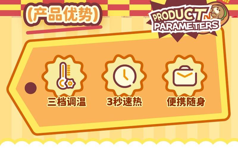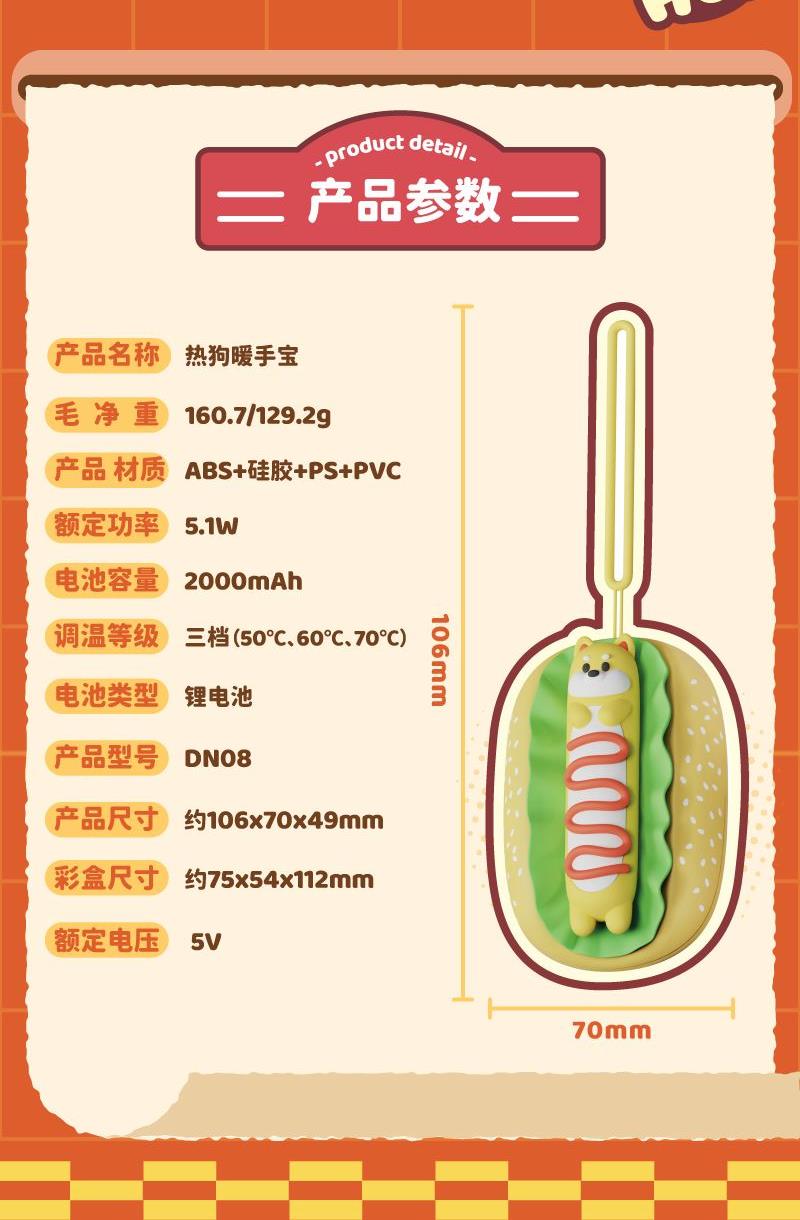 毛净重:160.7/129.2g 产品材质:ABS+硅胶+PS+PVC 额定功率:5.1W 电池容量:2000mAh 调温等级:三档(50°C、60°C、70C) 电池类型:锂电池 产品尺寸:约106x70x49mm 彩盒尺寸:约75x54x112mm 外箱尺寸:约49.5x28.5x48.5cm 额定电压:5V 整箱毛净重:13.2/12.2KGS 备注:本产品需整箱发货