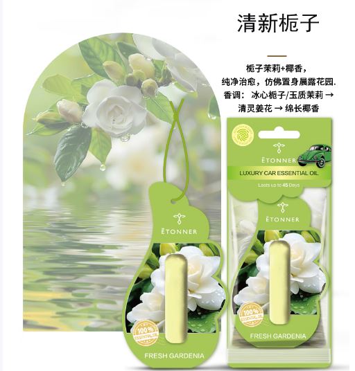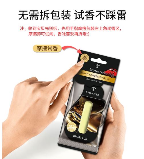 1、纯精油,可用45天; 2、可自行调控香气大小; 3、外包装带摩擦闻香装置,方便闻香,不浪费。 10种香型可选:薄荷森林M、海洋O、夏日亚麻L、黑冰I、蓝风铃B、茉莉葡萄J、新车大爱N、清新栀子G、橘香古龙C、运动男士S