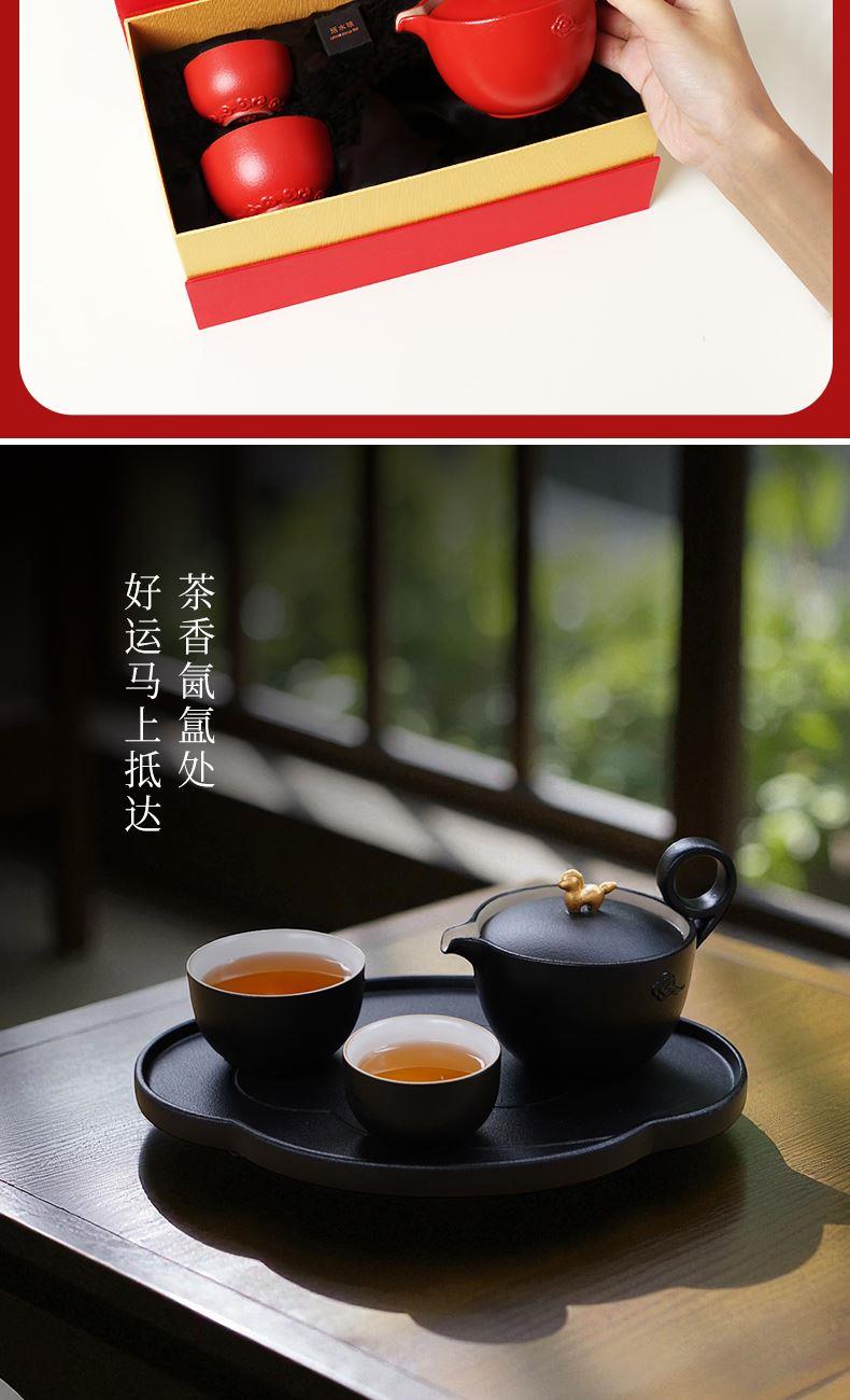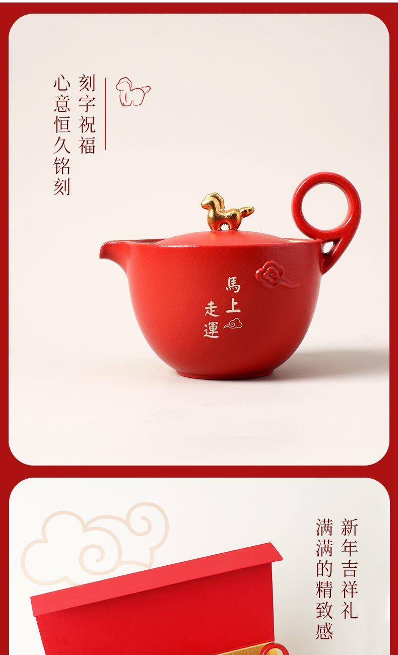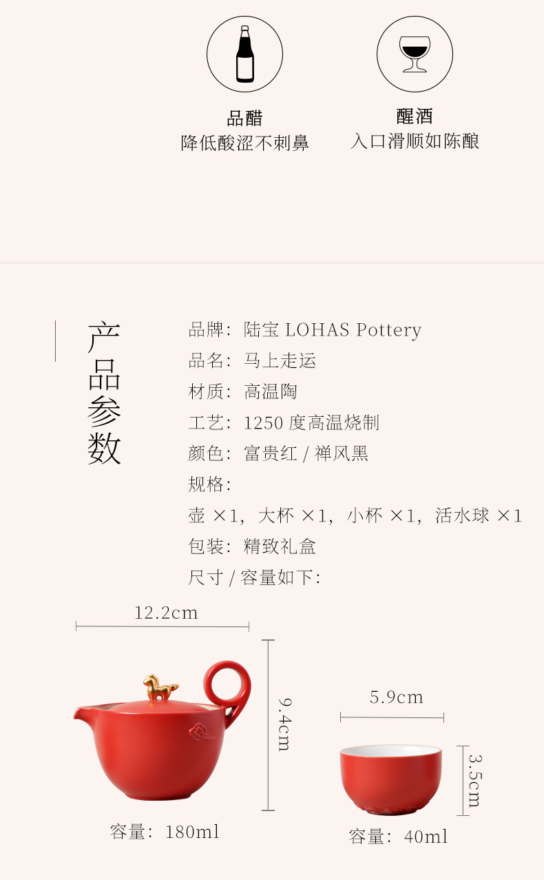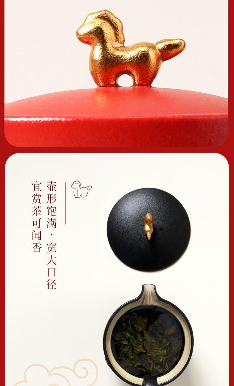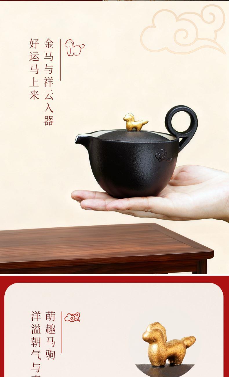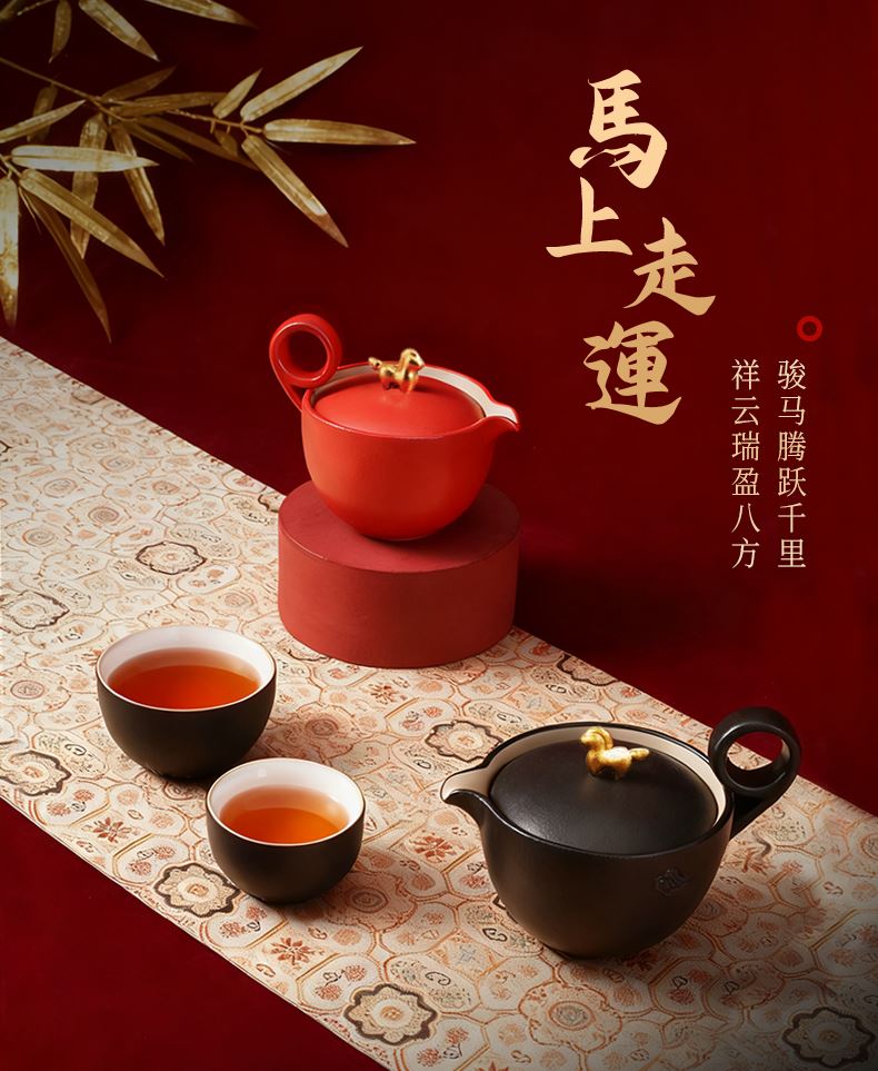 马,自古为祥瑞之象,踏云而行,送来财富、成功与安康。将美好心意凝于陶礼之中,愿您与幸福「马」上相逢,财富「马」上拥有,好运「马」上抵达。 以金马和祥云入器,创作「马上走运」茶组,为茶生活注入鸿运当头、如意年年的吉祥美意。萌趣马驹立于茶器上,彷佛自茶香中跃出,洋溢蓬勃朝气与无限喜悦。细致雕琢的祥云纹,喻示好运马上来、福气马上到。大小双杯,巧妙套叠于壶中,寓意圆满叠至、福气相随。 新的一年,携好运、启新程,满载马上走运的祝福,每一天都奔跑在灿烂的前程里。 规格:壶×1,大杯×1,小杯×1,活水球×1 颜色:富贵红/禅风黑 容量:180ml