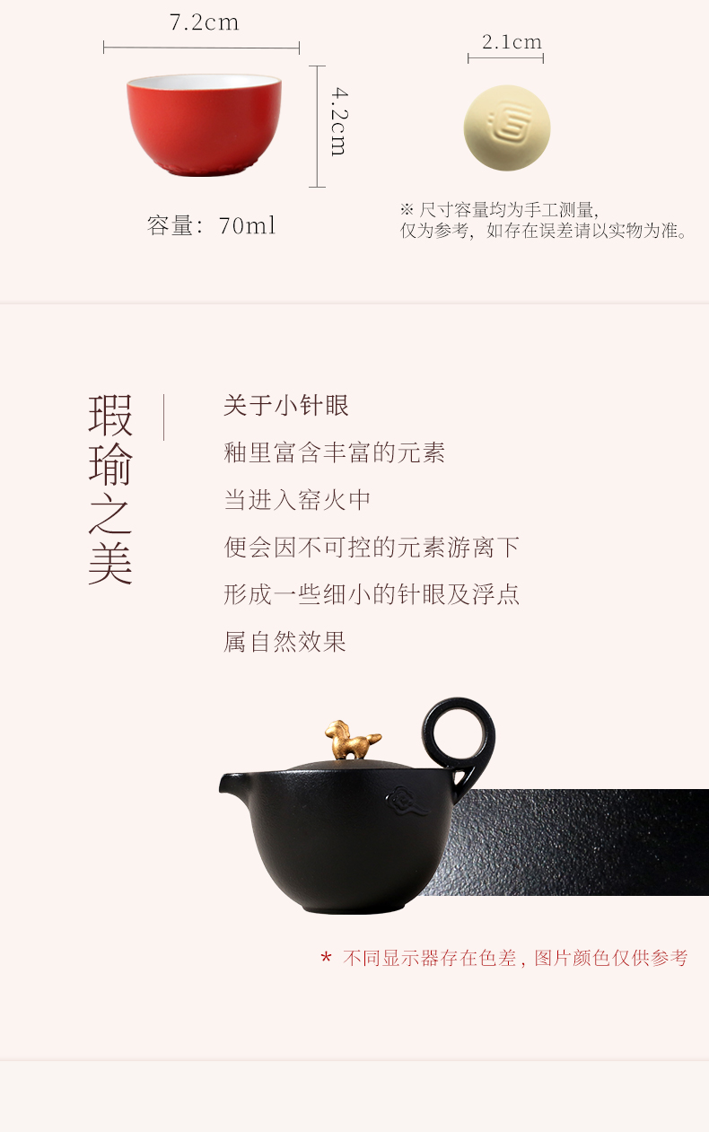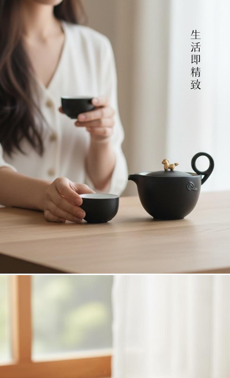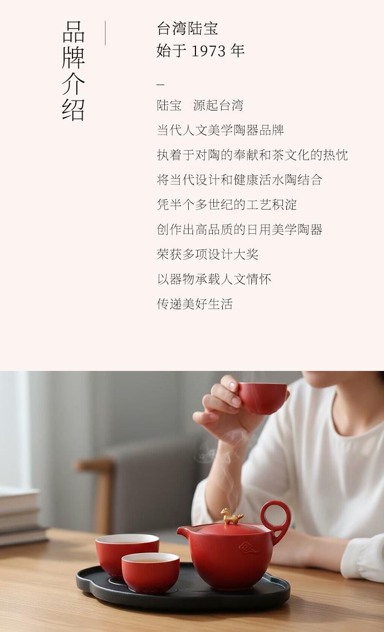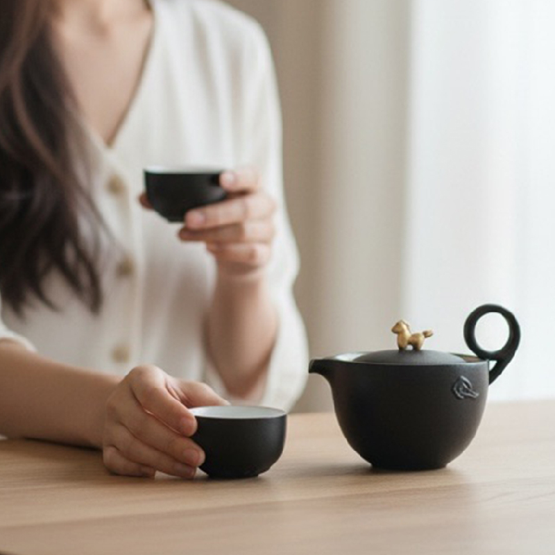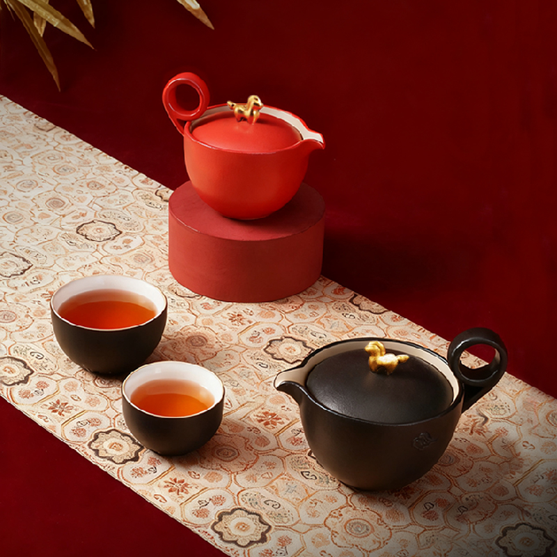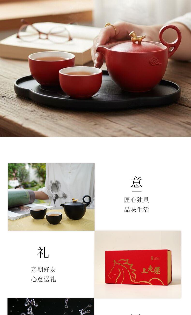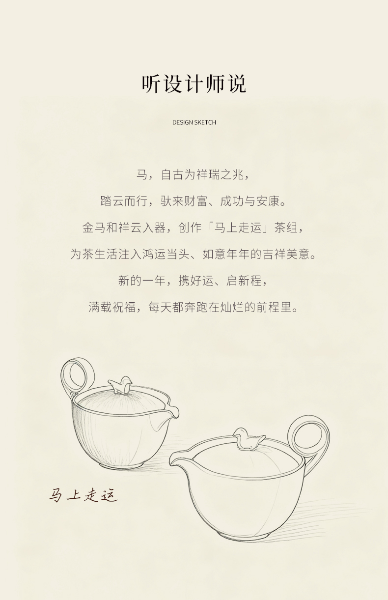 马,自古为祥瑞之象,踏云而行,送来财富、成功与安康。将美好心意凝于陶礼之中,愿您与幸福「马」上相逢,财富「马」上拥有,好运「马」上抵达。 以金马和祥云入器,创作「马上走运」茶组,为茶生活注入鸿运当头、如意年年的吉祥美意。萌趣马驹立于茶器上,彷佛自茶香中跃出,洋溢蓬勃朝气与无限喜悦。细致雕琢的祥云纹,喻示好运马上来、福气马上到。大小双杯,巧妙套叠于壶中,寓意圆满叠至、福气相随。 新的一年,携好运、启新程,满载马上走运的祝福,每一天都奔跑在灿烂的前程里。 规格:壶×1,大杯×1,小杯×1,活水球×1 颜色:富贵红/禅风黑 容量:180ml