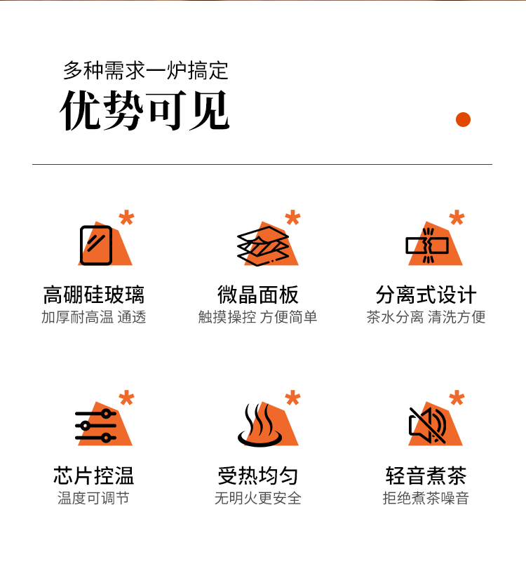 ·材质高硼硅玻璃、微晶板、镀锌板、PB 额定功率 1000W ●额定频率 50Hz ●套装清单 高硼硅玻璃提梁壶x1、高硼硅玻璃杯x4、炆火电陶炉x1
