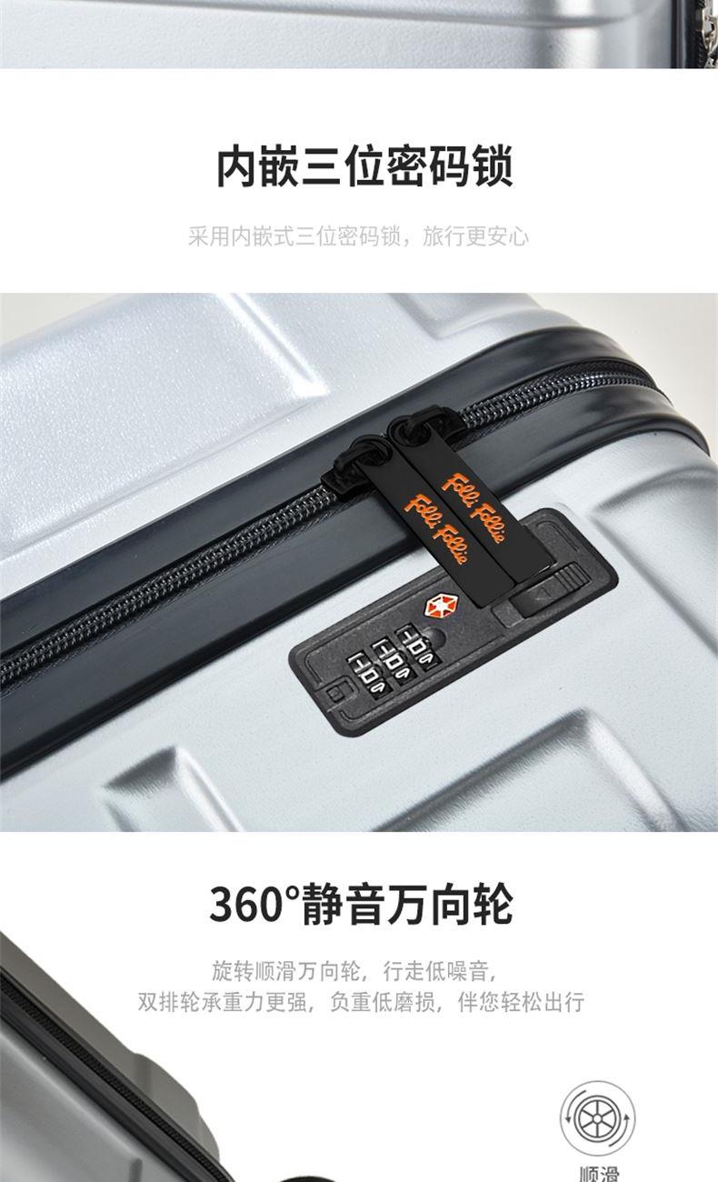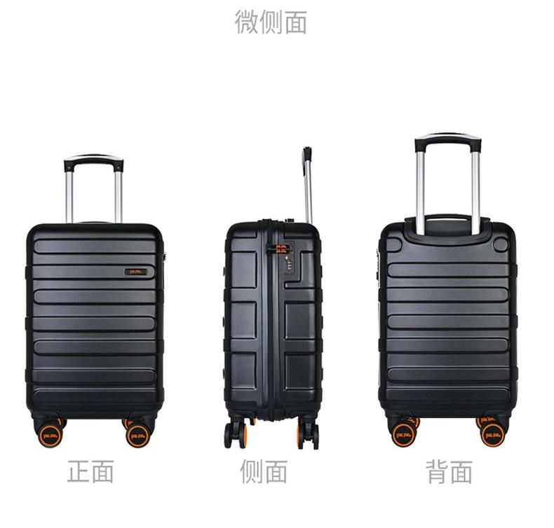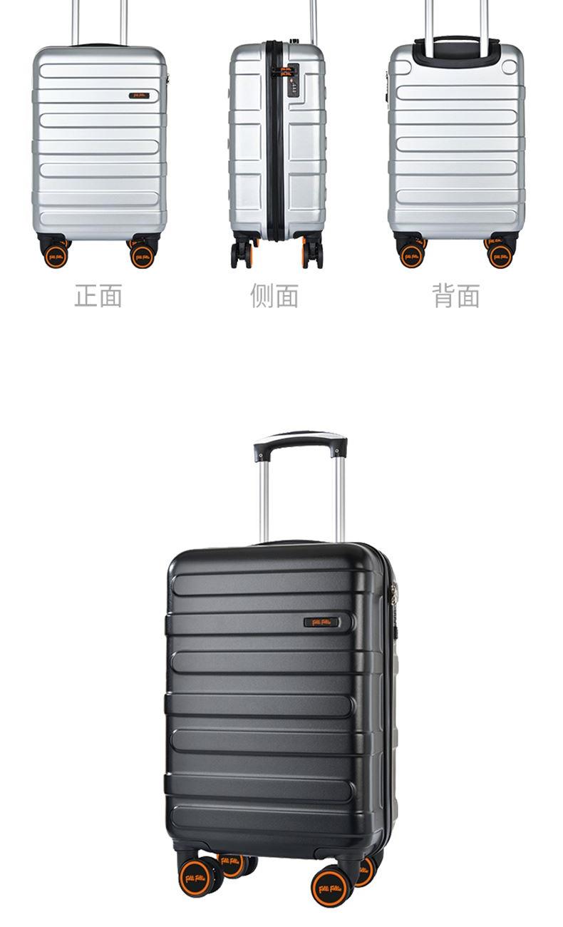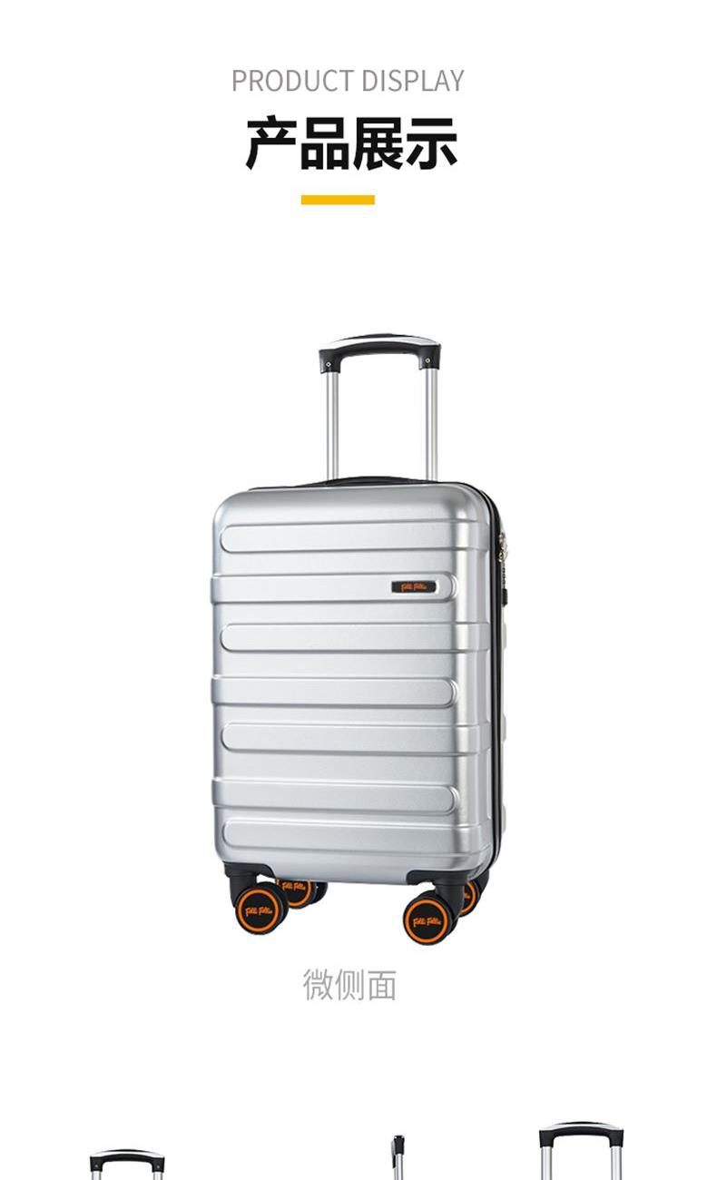 加厚ABS+PC箱体均衡分散受力,增固抗压双重; 360°万向轮顺滑静音,灵活平纹,减震降噪; 安全便捷,稳妥可靠; 材质: ABS+PC 产品配锁:内嵌三位密码锁 轮子:静音万向轮 拉杆:合金拉杆 颜色:银灰色、黑色 尺寸:20英寸