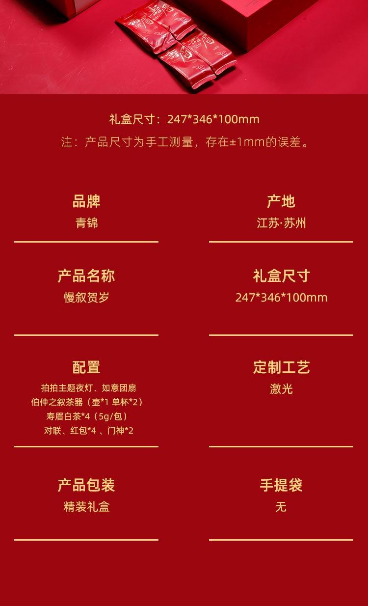 拍拍主题夜灯(可定制画面)*1伯仲之叙茶器一壶*1 单杯*2寿眉白茶*4包对联*1-红包*4 门神*2 如意团扇*1枚精装礼盒手提袋*1 伯仲之叙一壶两杯影青釉色淡雅精致 拍拍夜灯一拍变色三色光源可以定制灯面内容 一套起订免费定制快速 发货