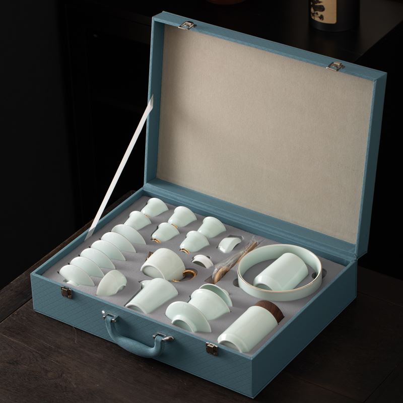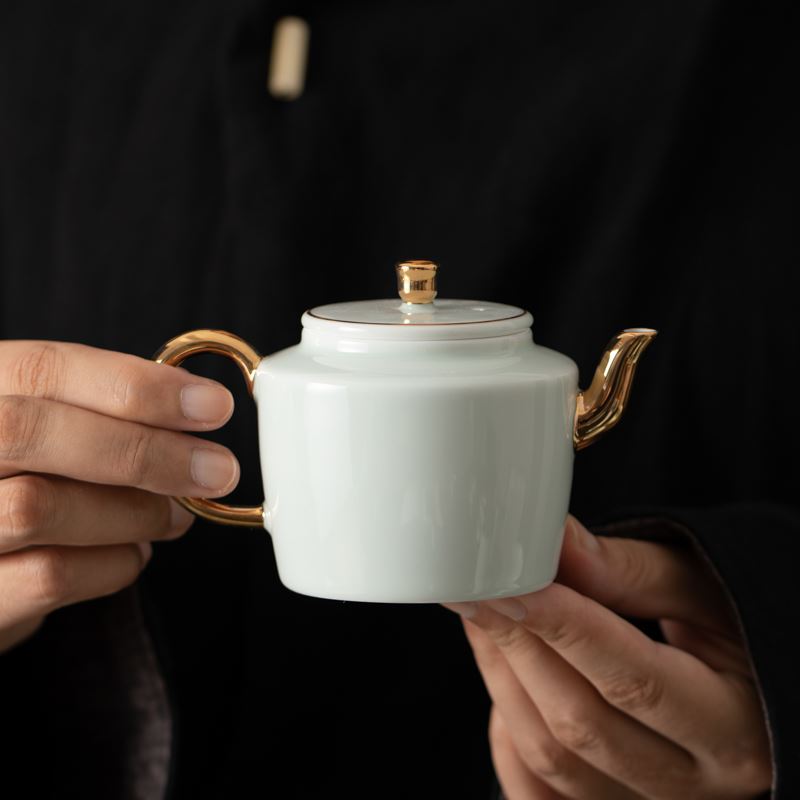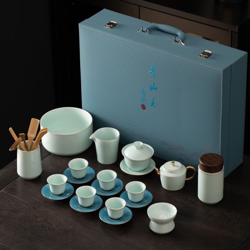 配制:1壶 1盖碗6杯 1茶洗 1茶叶罐 1茶道六君子 1公道杯1茶托1茶漏 1锦盒 规格:壶:12.6*8cm 公道杯:9.2*9.1cm 茶杯:6cm*5cm 盖碗:9.5*9.5cm 材质:青山玉 24K真金 推荐说明:青山玉是青瓷新品,以瓷质细腻,线条明快流畅,色泽纯洁而斑斓著称。青如玉,明如镜,声如磬,描24K真金奢华装饰,被称为瓷器之花。