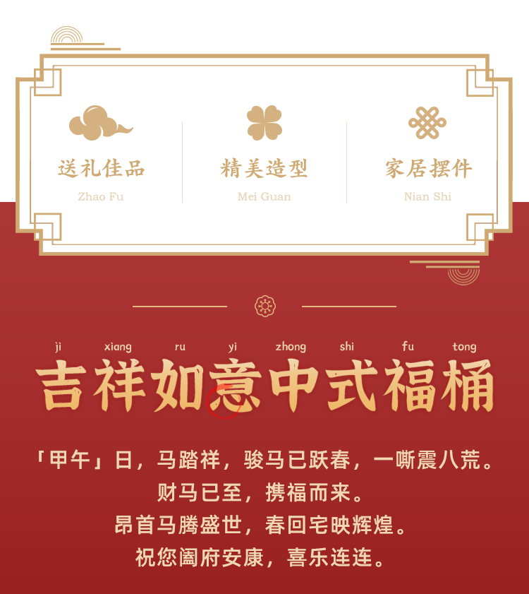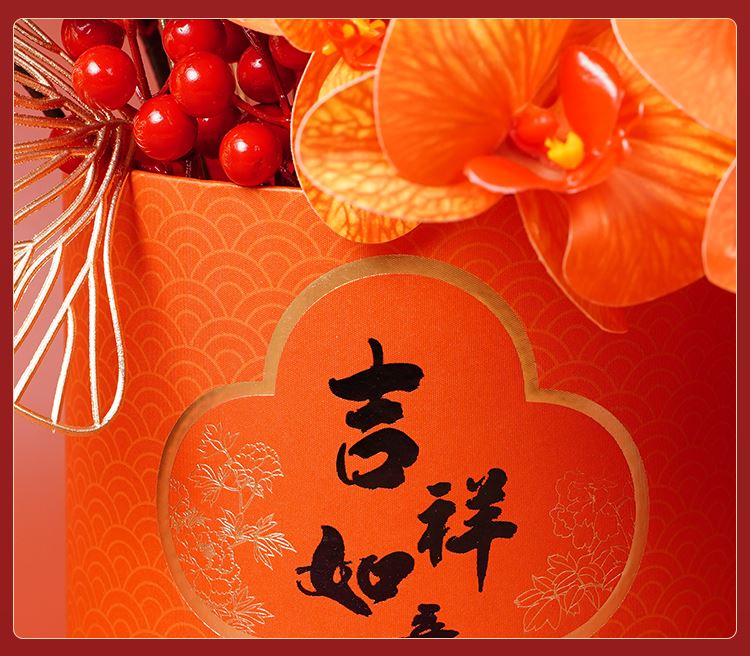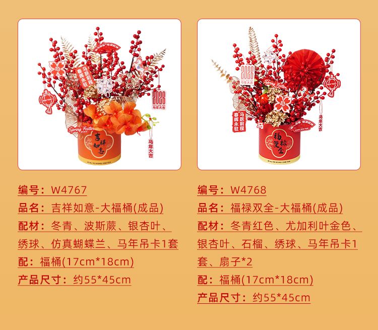 产品:吉祥如意-大福桶 规格:W4767 规格: 花束高度:55*45 桶:17*18cm 材料:冬青、波斯蕨、银杏叶、绣球、仿真蝴蝶兰、马年吊卡1套