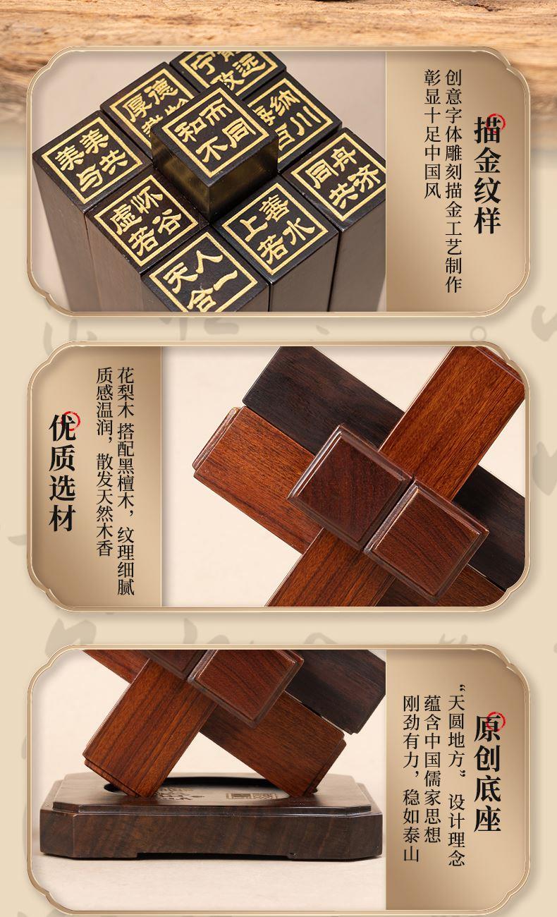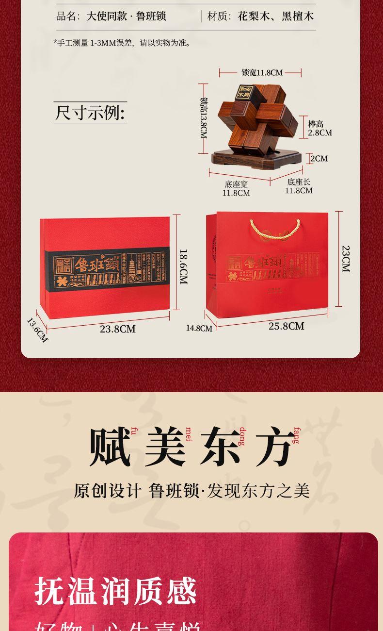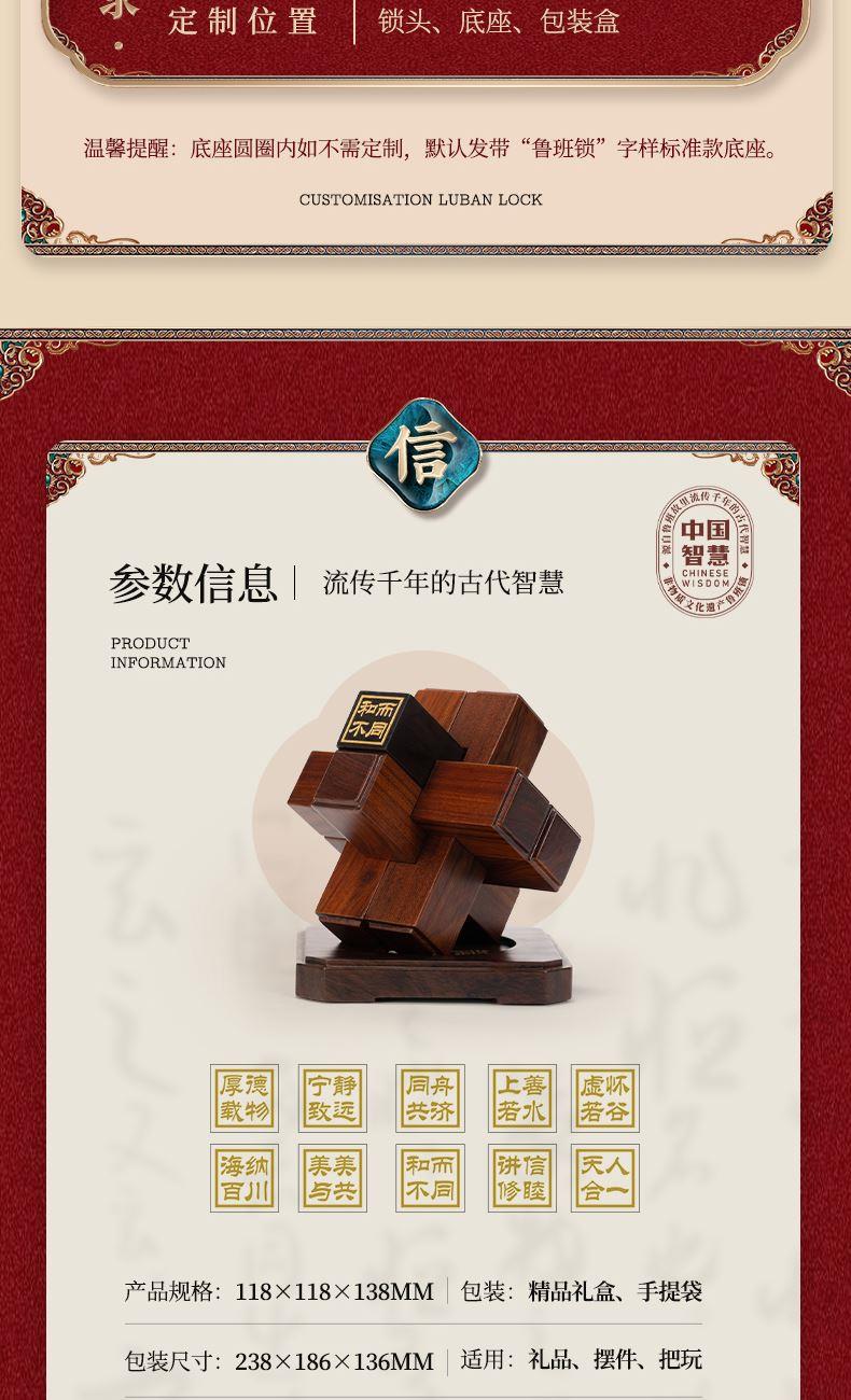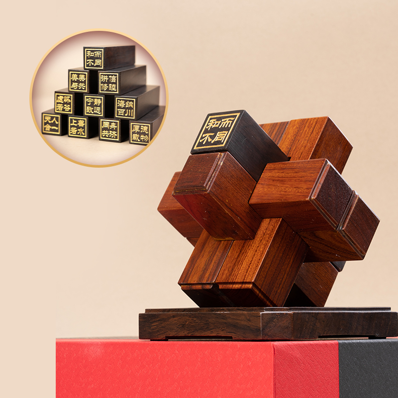 材质:花梨、黑檀 产品规格:118×118×138mm 包装规格:238×186×136mm 来至鲁班故里,非遗文创产品 礼之用,和为贵。这款大使同款鲁班锁,精选花梨木与黑檀木,巧妙融合传统榫卯结构,六根木棒紧密相连,稳固而典雅。锁体采用描金工艺,细节精致,尽显古朴韵味。它不仅是一件工艺品,更承载着中华文明贵和尚中、善解能容、厚德载物、和而不同的“和合” 理念。作为2023年我国常驻联合国大使担任安理会轮值主席时的纪念品,它象征着相互包容、合作共赢。这款鲁班锁,是送礼自用的上乘之选,更是文化的精美载体。
