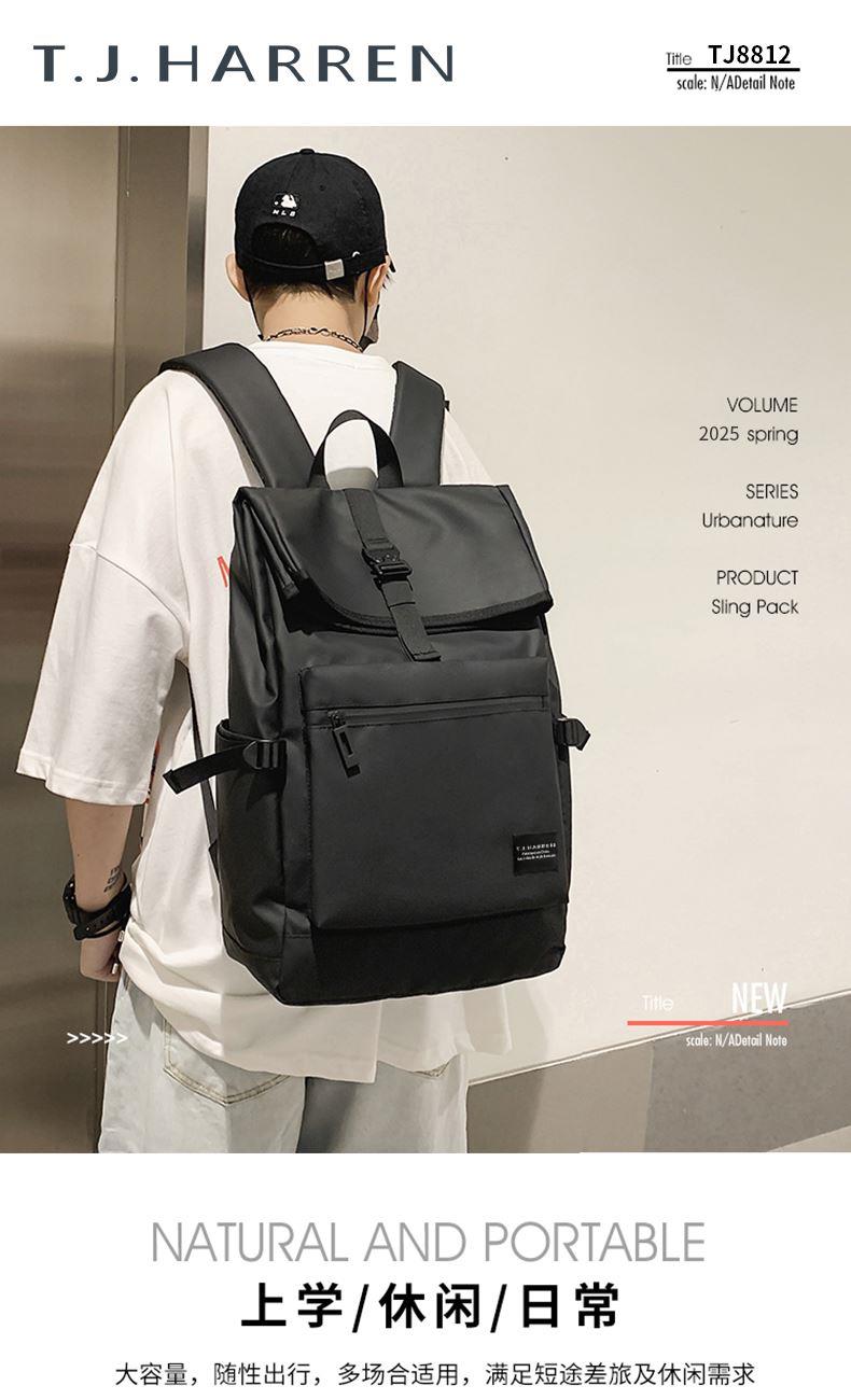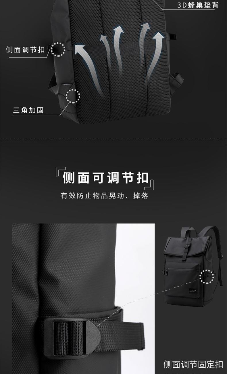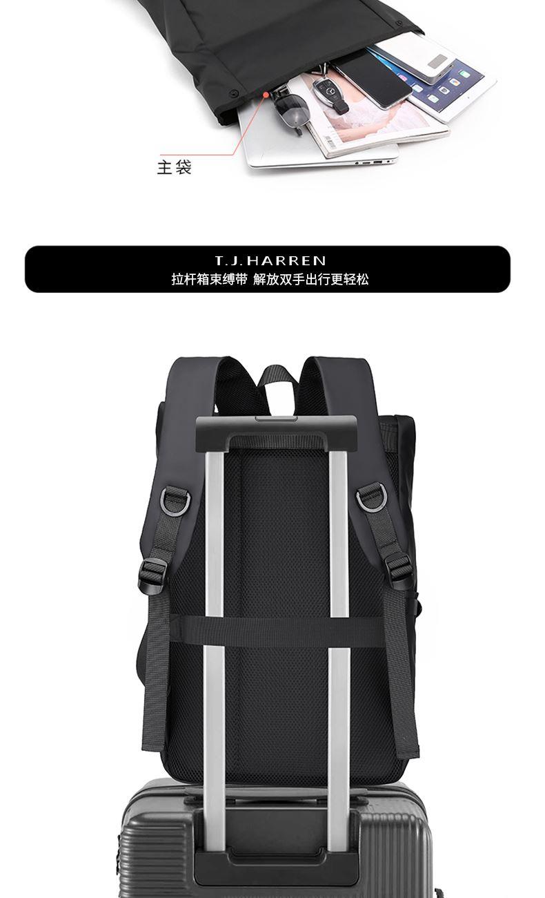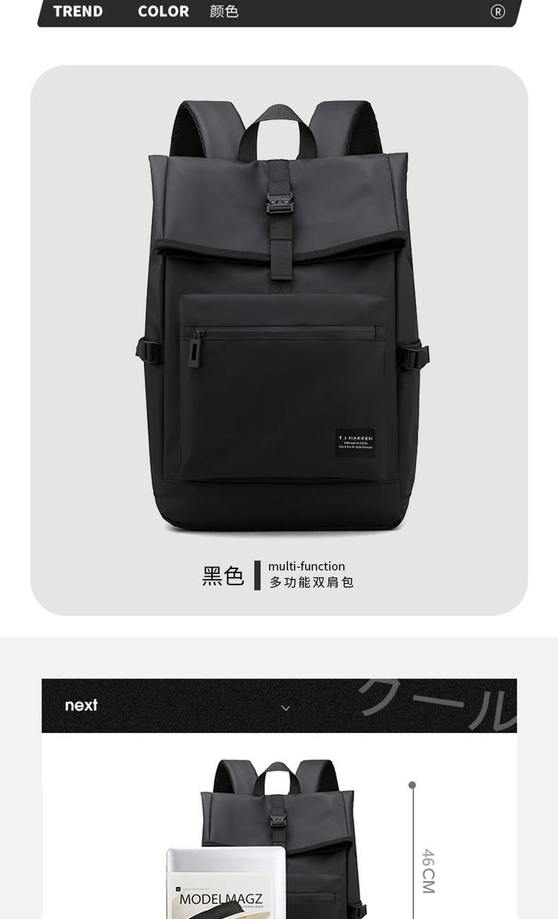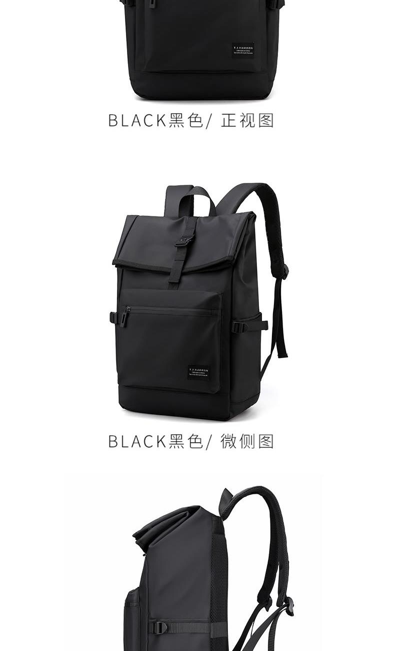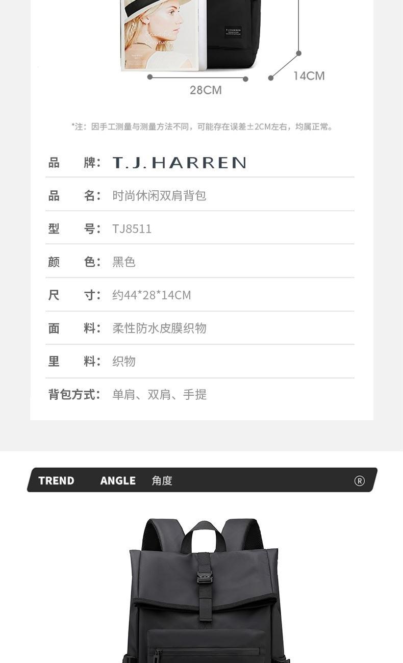 型号:TJ8511 颜色:黑色 尺寸:约44*28*14CM 容量:约17L 面料:柔性防水皮膜织物 里料:织物 重量:约0.57KG 等级:一等合格品 执行标准:QB/T 1333-2018 产品特点: 1、新款多功能设计,时尚大方,旅行休闲商务三用;2、柔性防水皮膜面料,一擦即干,轻松打理;3、多隔层结构,分区合理,轻松收纳;4、主袋约17L大容量,同时收口处可灵活扩展容量,装的更多;5、独立加棉加厚电脑隔层袋,可放置15.6寸电脑;6、前置拉链袋、侧袋及内置袋,放置贴身物品;7、拉杆固定束带设计,解放双手;8、透气背负系统,配合加大加厚提手与肩带,可背可提、透气干爽,舒适减压出行;9、支持客户定制