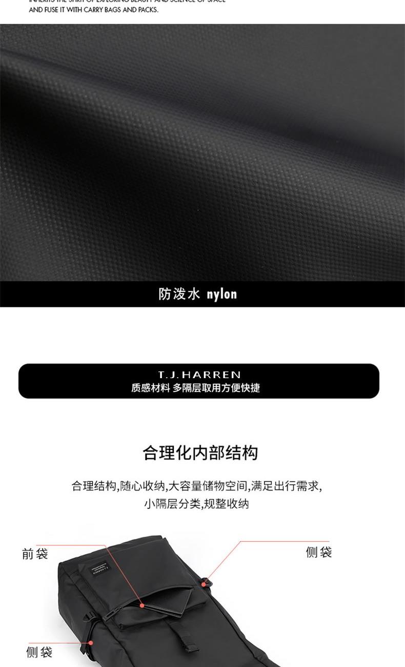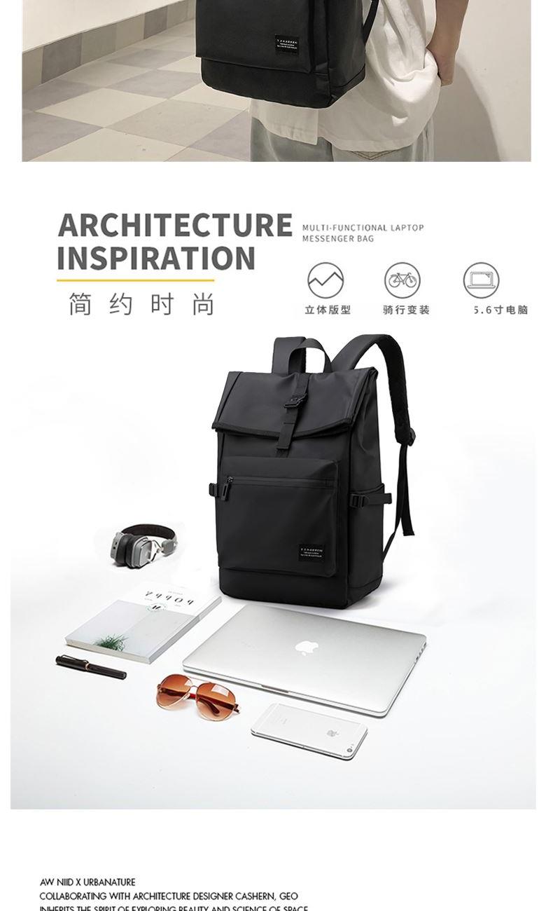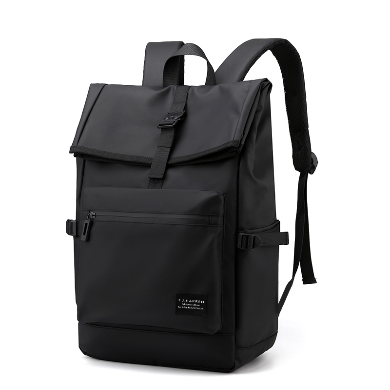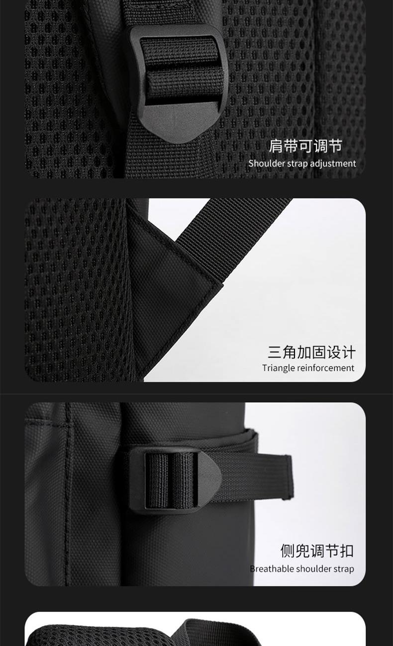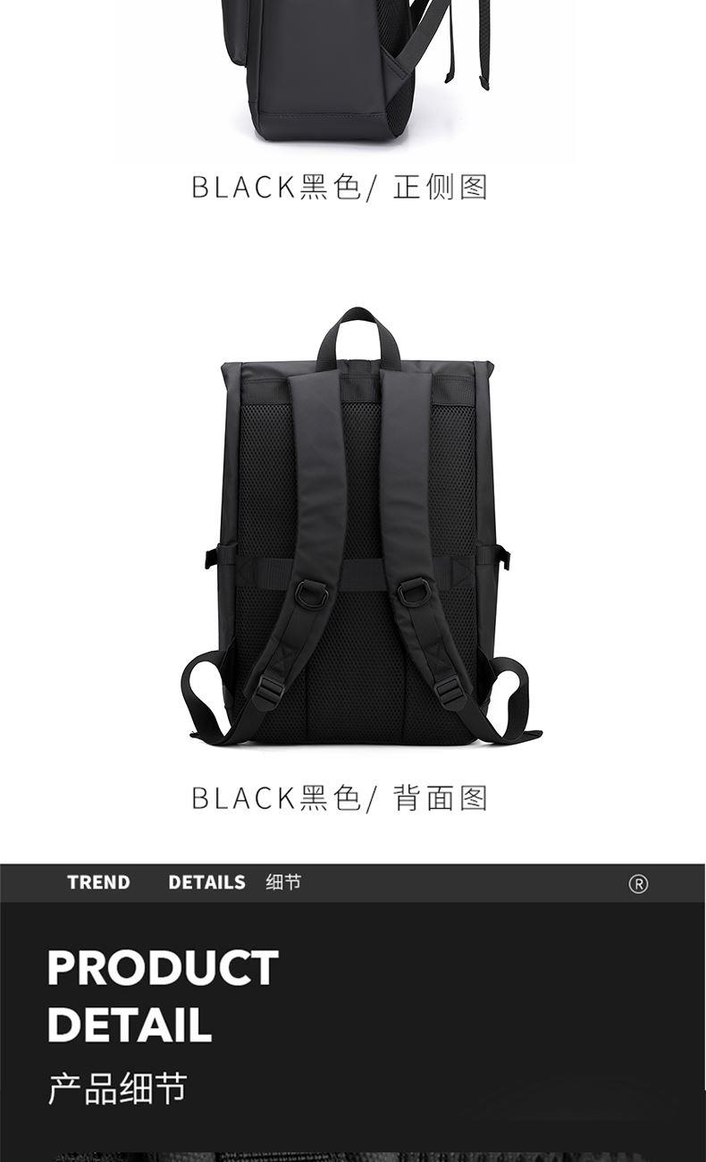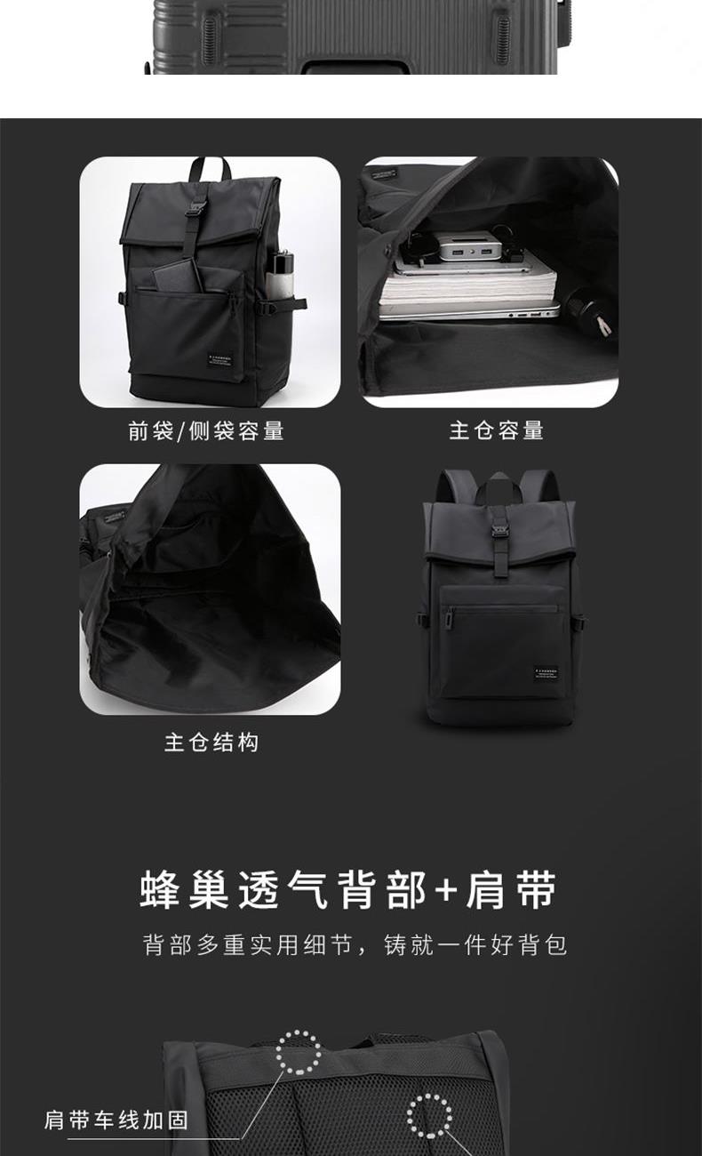 型号:TJ8511 颜色:黑色 尺寸:约44*28*14CM 容量:约17L 面料:柔性防水皮膜织物 里料:织物 重量:约0.57KG 等级:一等合格品 执行标准:QB/T 1333-2018 产品特点: 1、新款多功能设计,时尚大方,旅行休闲商务三用;2、柔性防水皮膜面料,一擦即干,轻松打理;3、多隔层结构,分区合理,轻松收纳;4、主袋约17L大容量,同时收口处可灵活扩展容量,装的更多;5、独立加棉加厚电脑隔层袋,可放置15.6寸电脑;6、前置拉链袋、侧袋及内置袋,放置贴身物品;7、拉杆固定束带设计,解放双手;8、透气背负系统,配合加大加厚提手与肩带,可背可提、透气干爽,舒适减压出行;9、支持客户定制