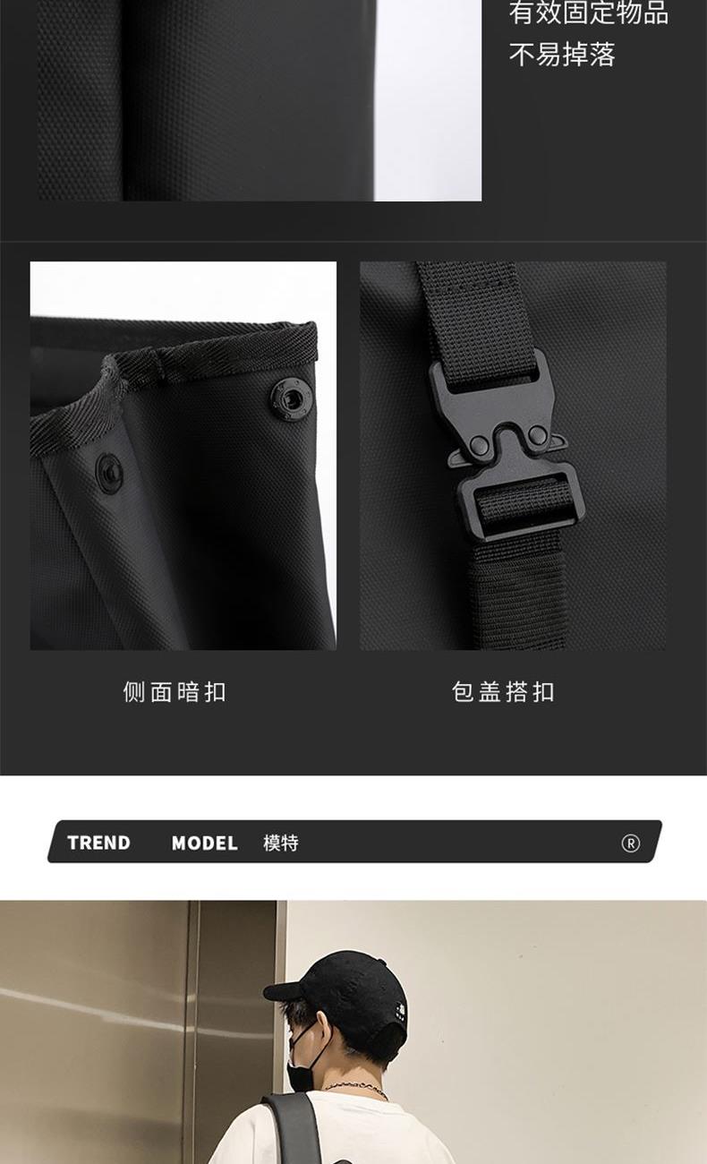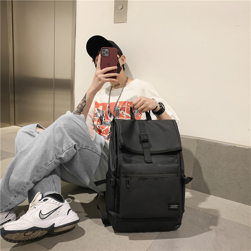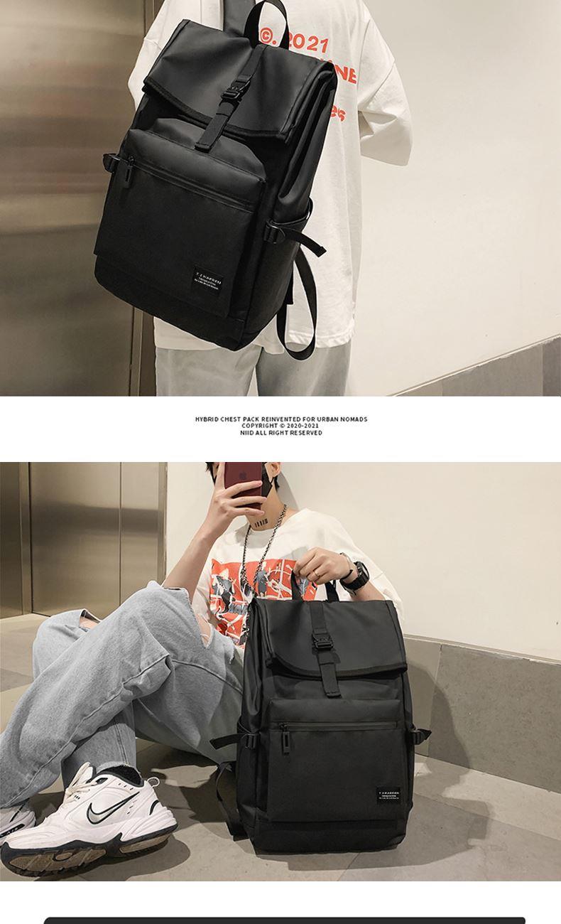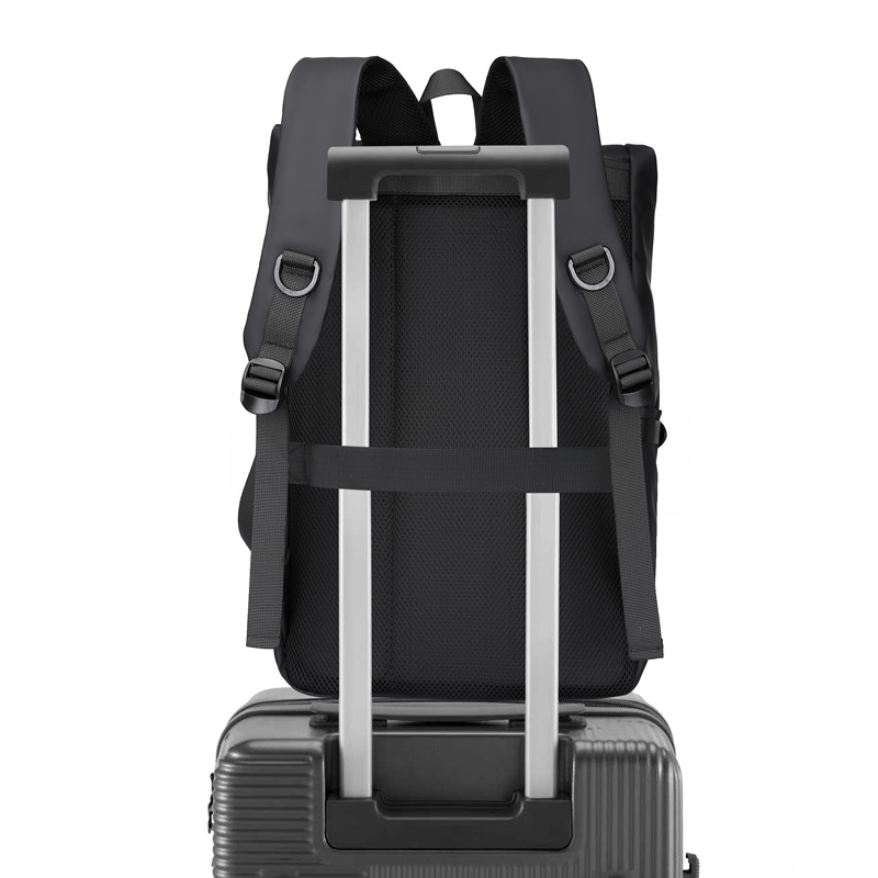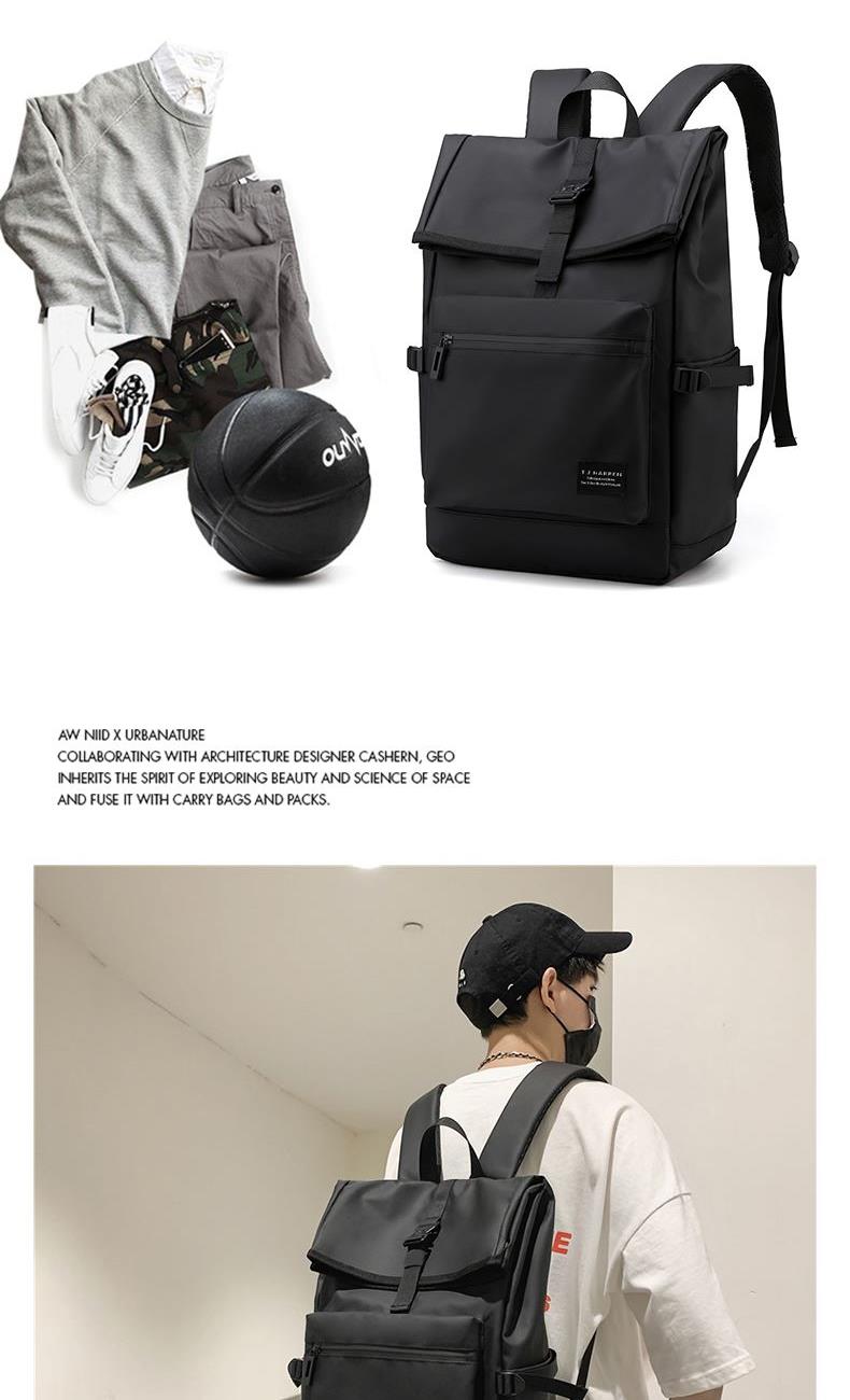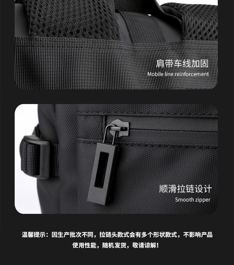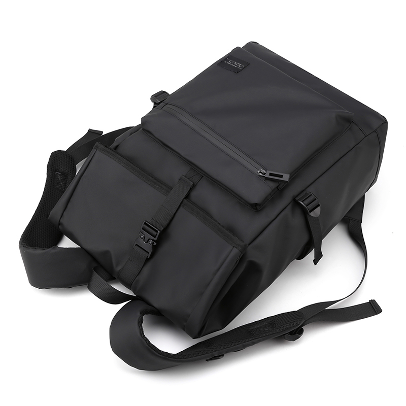 型号:TJ8511 颜色:黑色 尺寸:约44*28*14CM 容量:约17L 面料:柔性防水皮膜织物 里料:织物 重量:约0.57KG 等级:一等合格品 执行标准:QB/T 1333-2018 产品特点: 1、新款多功能设计,时尚大方,旅行休闲商务三用;2、柔性防水皮膜面料,一擦即干,轻松打理;3、多隔层结构,分区合理,轻松收纳;4、主袋约17L大容量,同时收口处可灵活扩展容量,装的更多;5、独立加棉加厚电脑隔层袋,可放置15.6寸电脑;6、前置拉链袋、侧袋及内置袋,放置贴身物品;7、拉杆固定束带设计,解放双手;8、透气背负系统,配合加大加厚提手与肩带,可背可提、透气干爽,舒适减压出行;9、支持客户定制