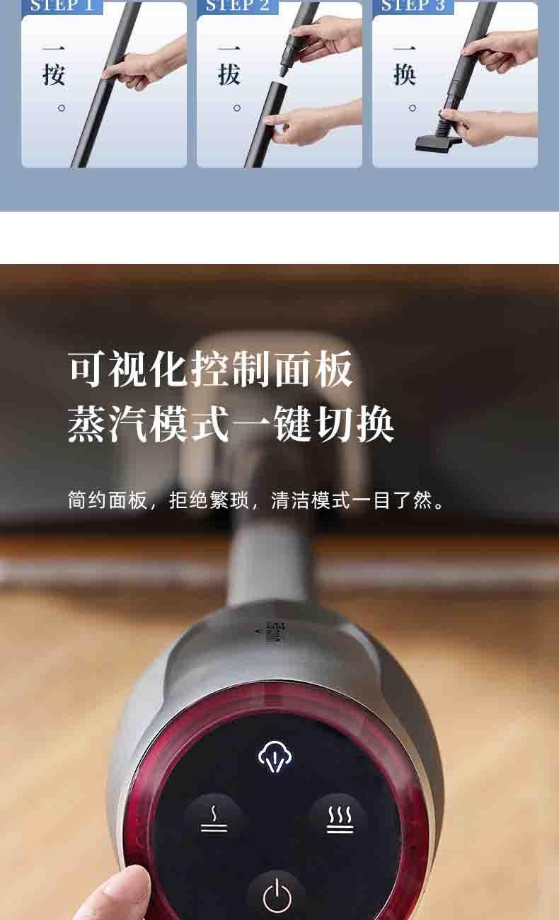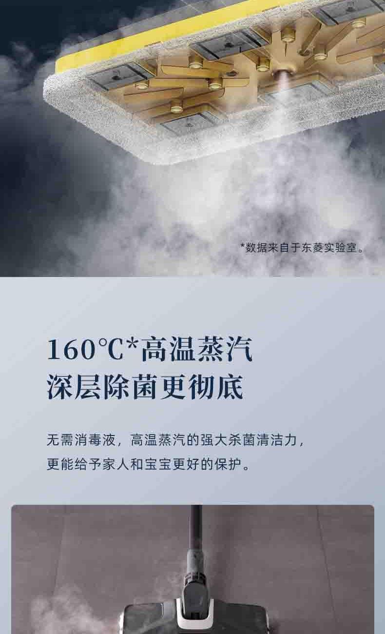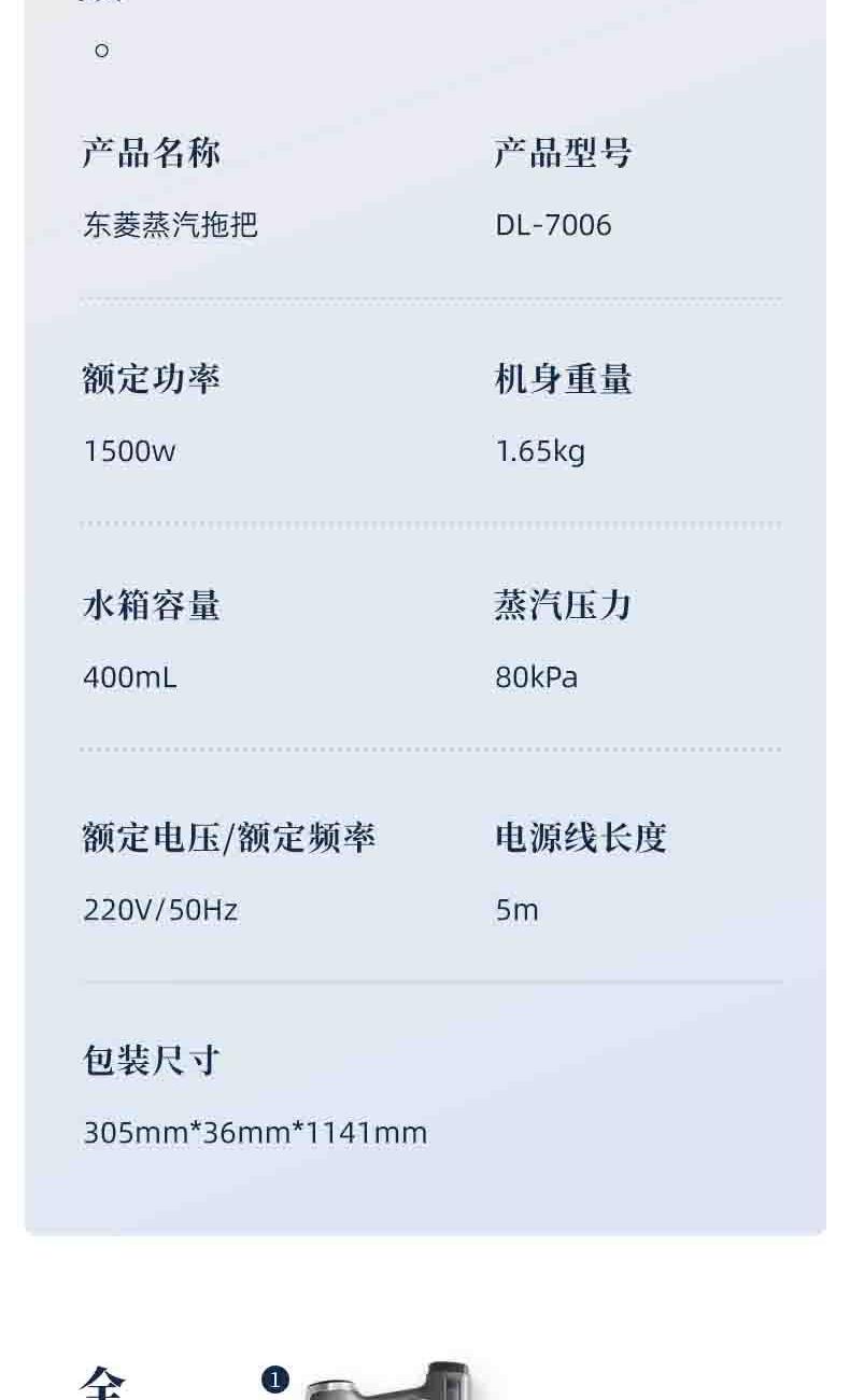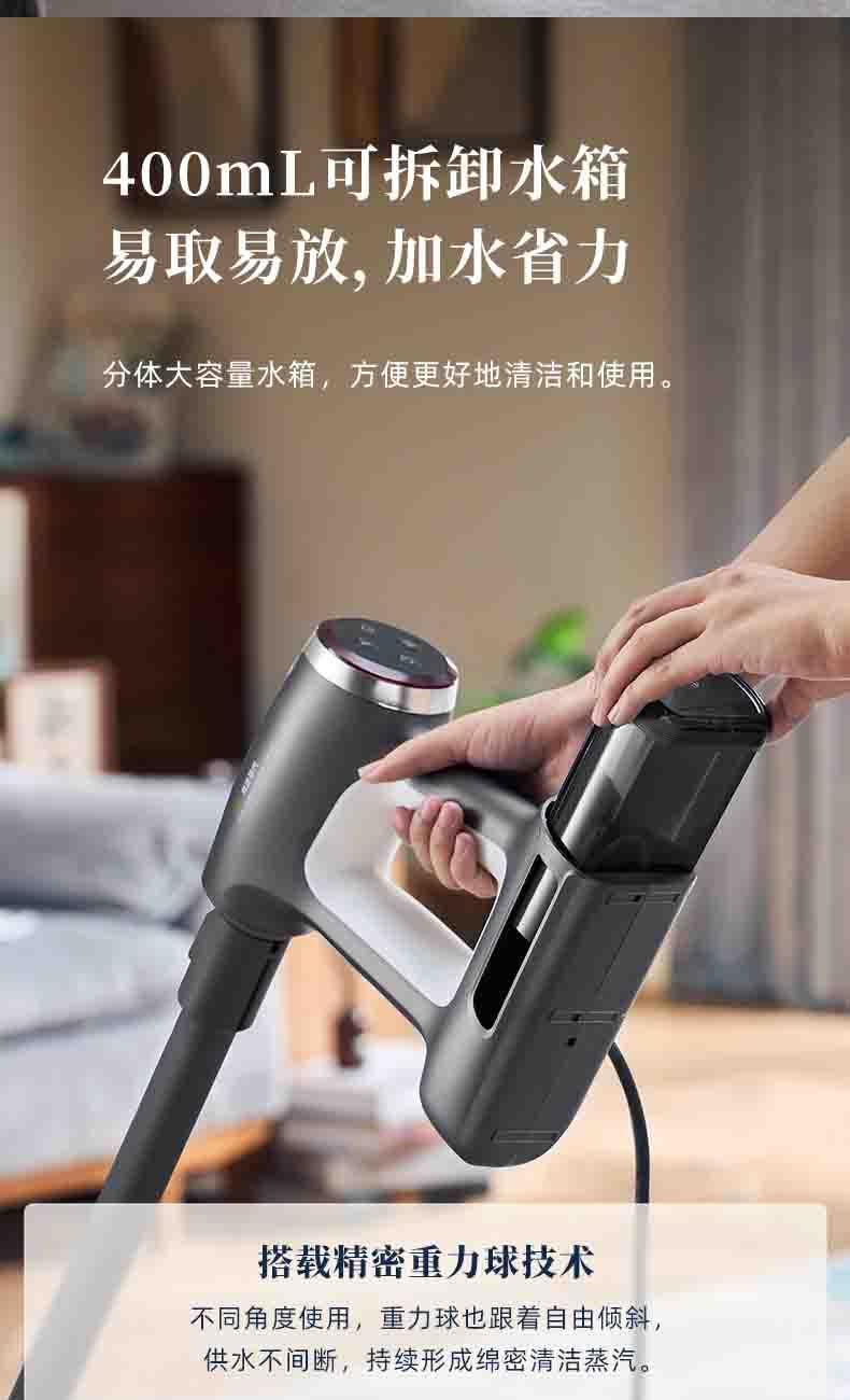 容量:400mL 蒸汽压力:80KPa 功率:1500W 毛重:3.5kg 产品尺寸:305*336*1138mm 包装尺寸:341*138*660mm 1拖地,一机搞定,可180°躺平 2.20秒速热,160°c蒸汽喷射 3.标配地板刷、蒸汽刷、熨烫刷、刮水刷