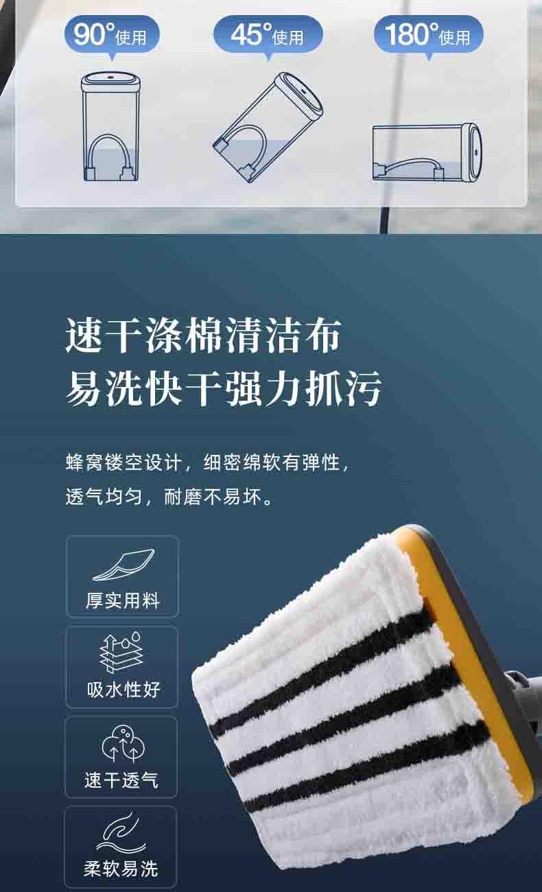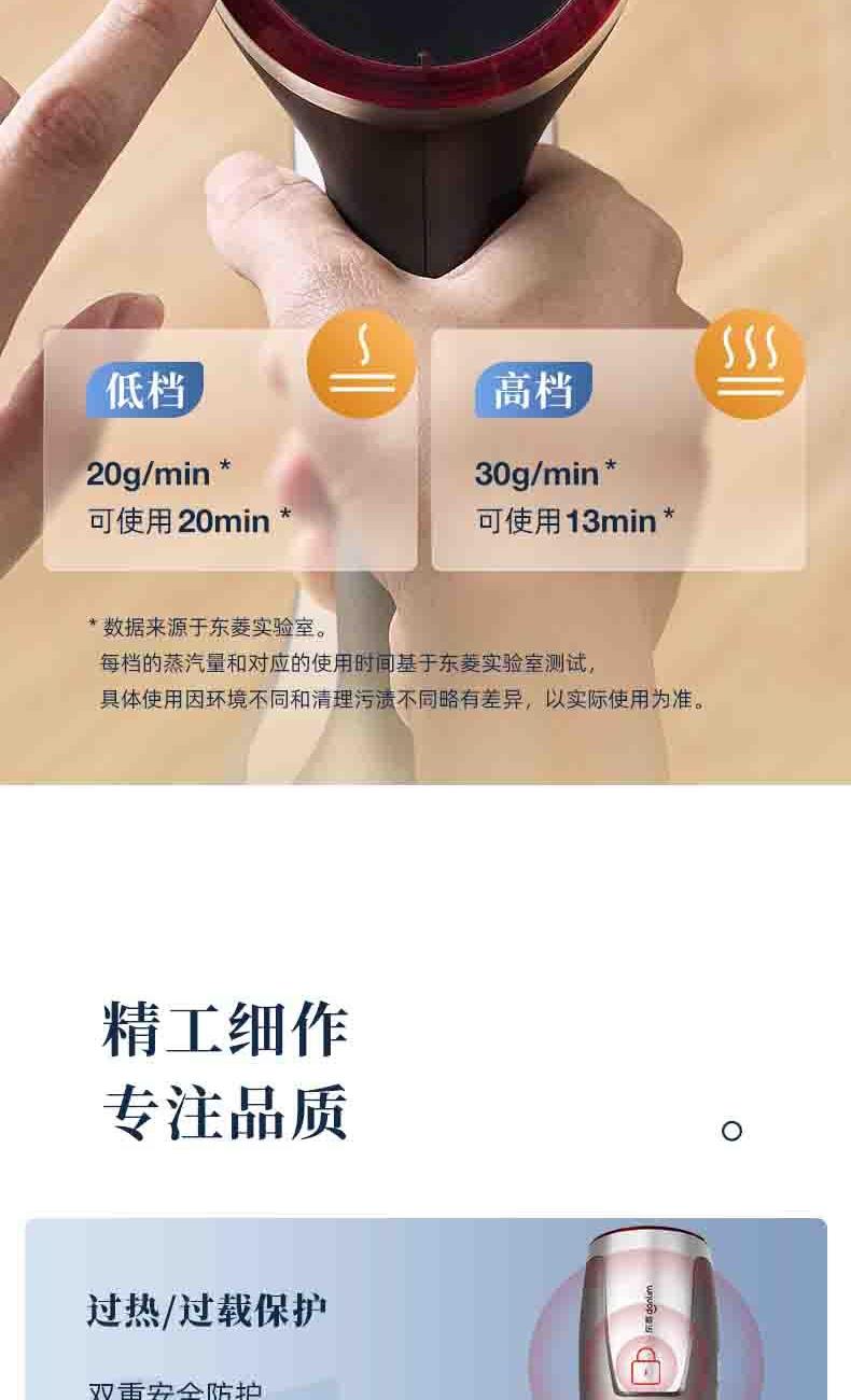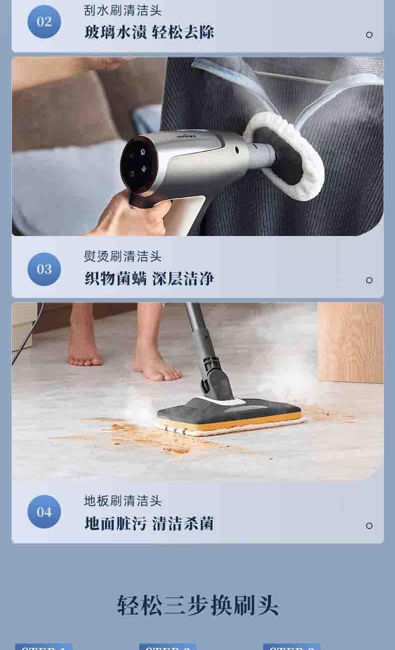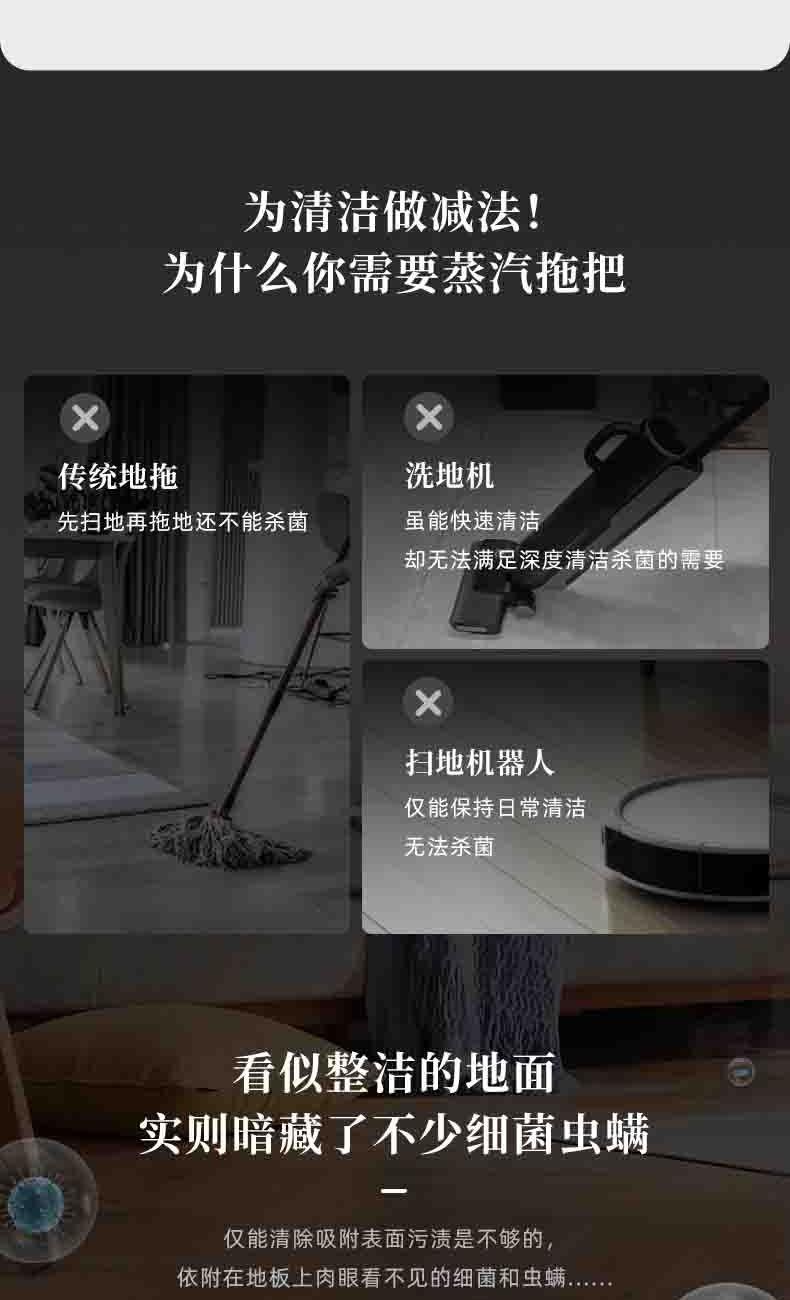 容量:400mL 蒸汽压力:80KPa 功率:1500W 毛重:3.5kg 产品尺寸:305*336*1138mm 包装尺寸:341*138*660mm 1拖地,一机搞定,可180°躺平 2.20秒速热,160°c蒸汽喷射 3.标配地板刷、蒸汽刷、熨烫刷、刮水刷