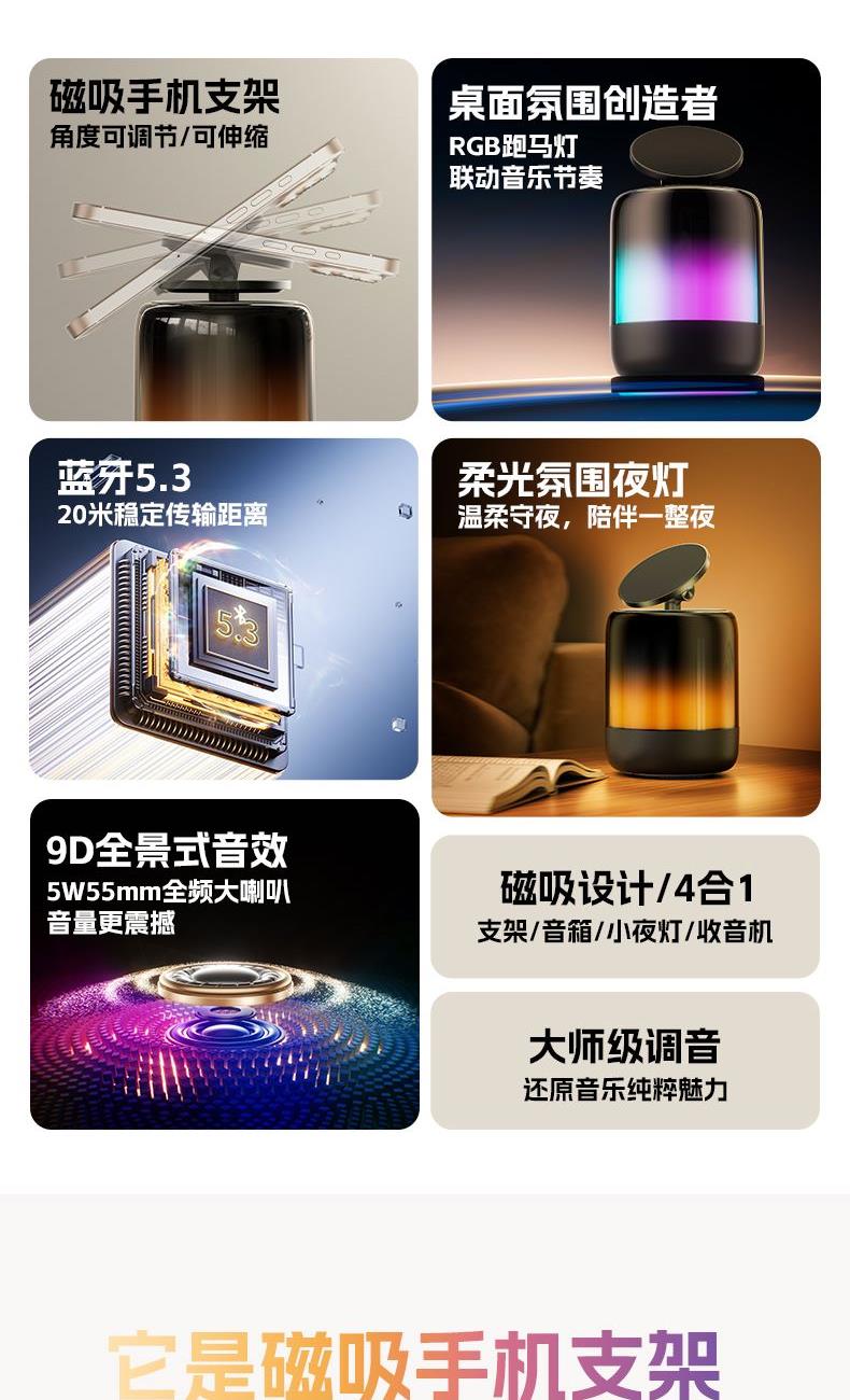 奥苏米四合一磁吸支架炫彩蓝牙音响小夜灯