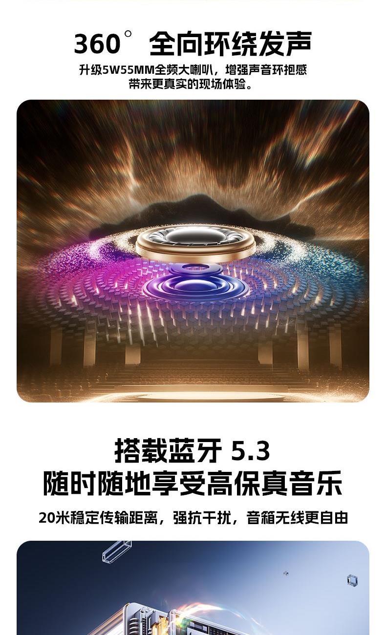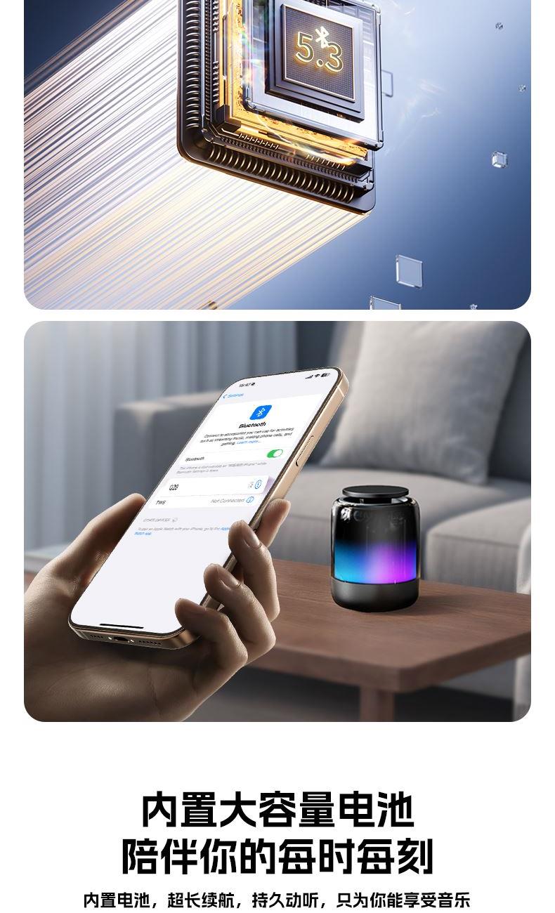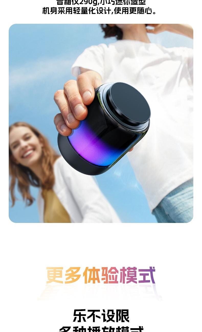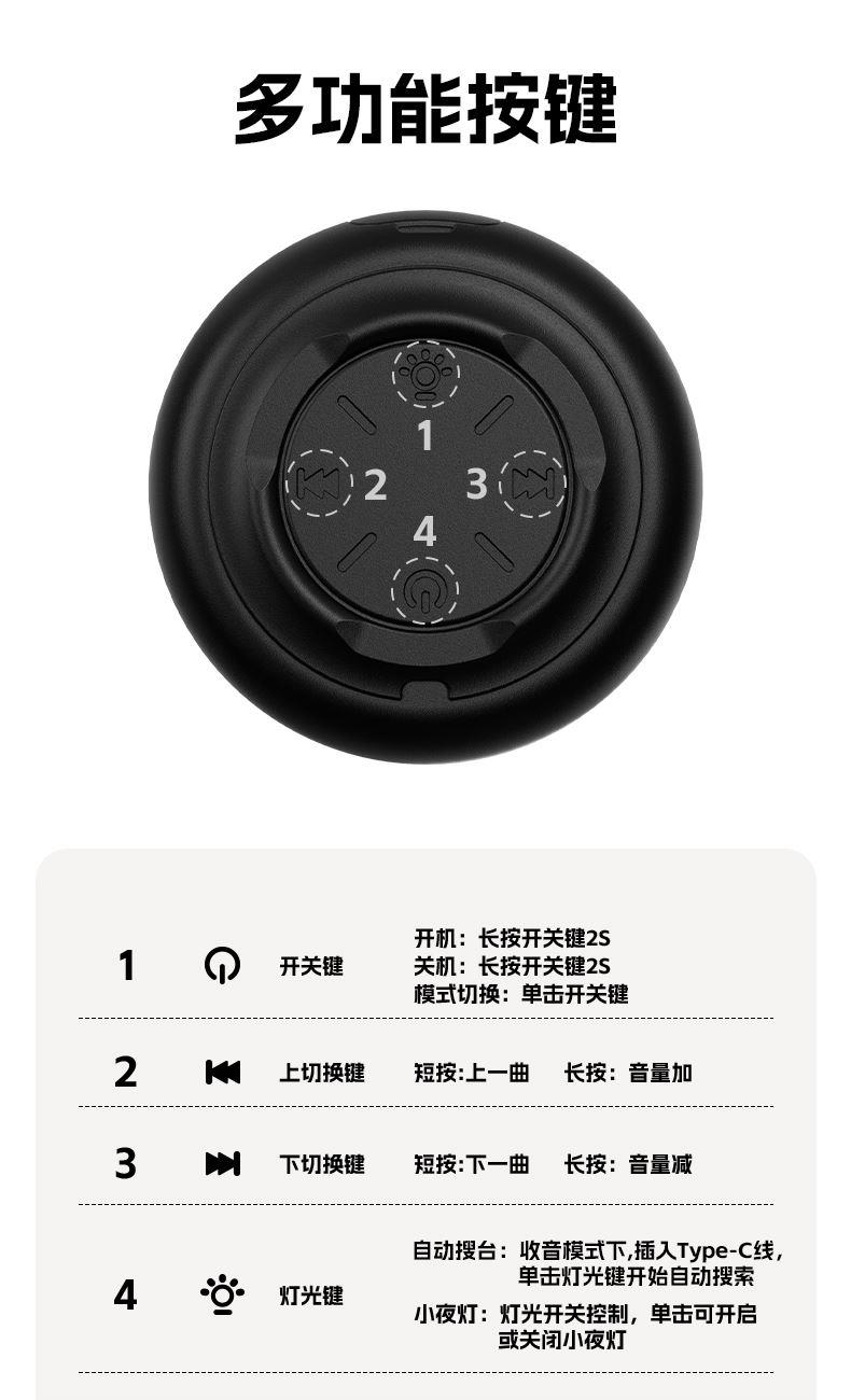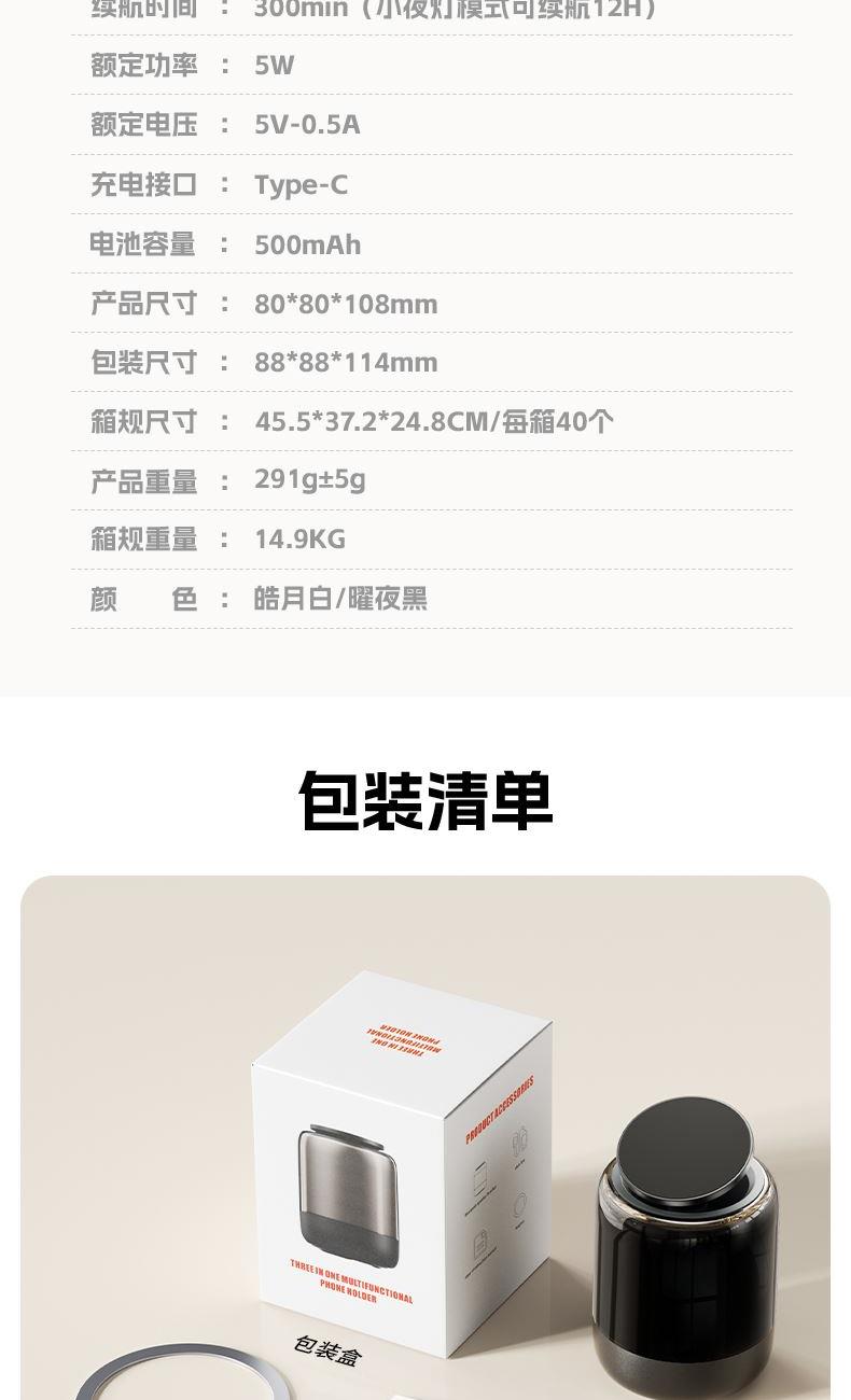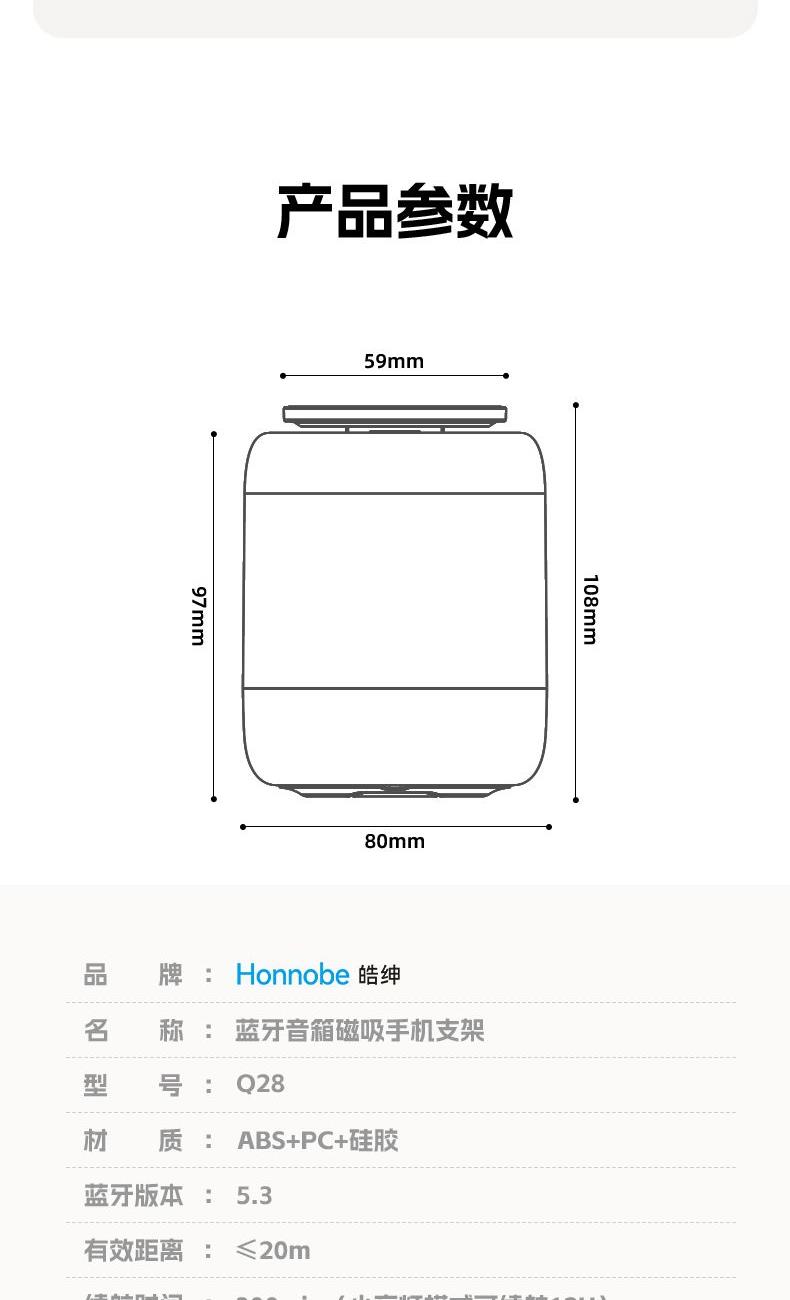 四合一磁吸支架炫彩蓝牙音响小夜灯 型 号: Q28 产品尺寸 :80*80*108mm 包装尺寸:88*88*114mm 产品净重 :291g 材质 :ABS+硅胶 颜色 :白色,黑色, 电池容量:500mAh 续航:小夜灯续航12H 功能特点】: RGB炫彩跑马灯多设备都兼容 360°无死角自由旋转 伸缩磁吸支架 手机支架结合蓝牙音响功能更加强大 暖光小夜灯 续航一整夜 FM收音机模式 支持TF卡播放音乐