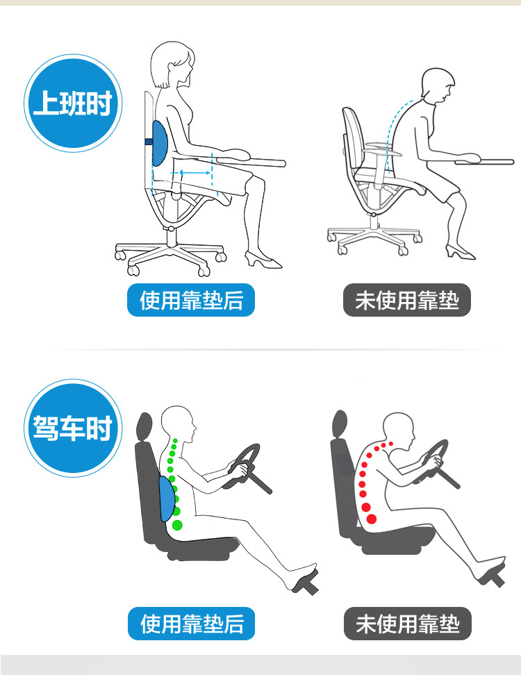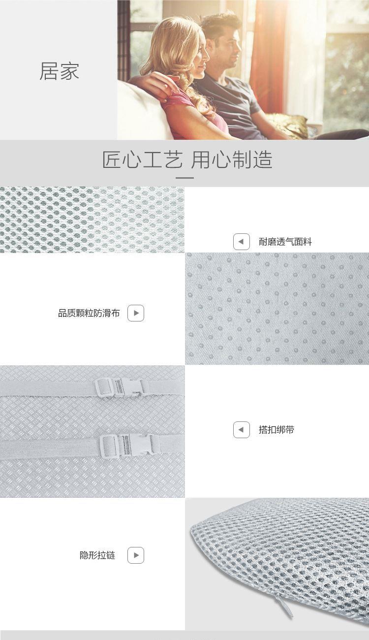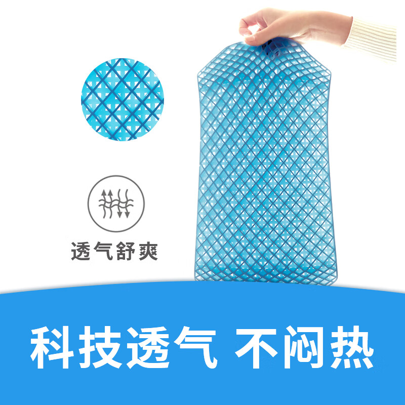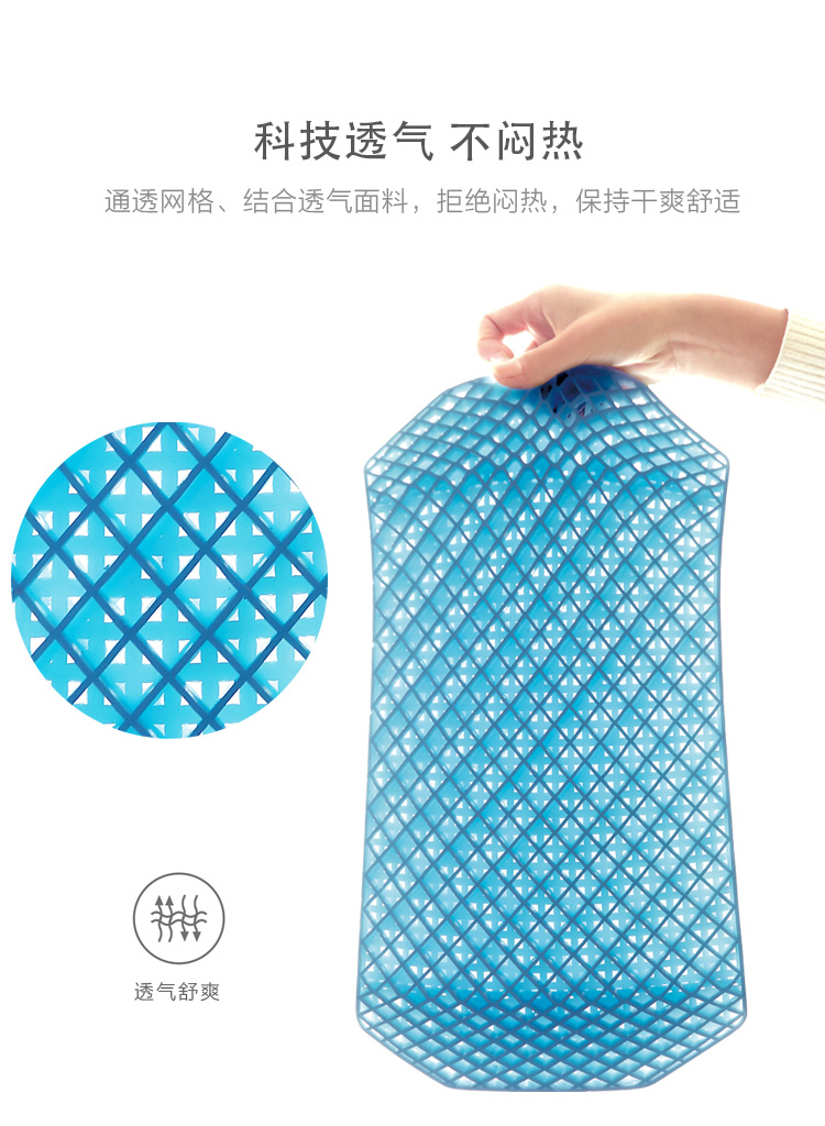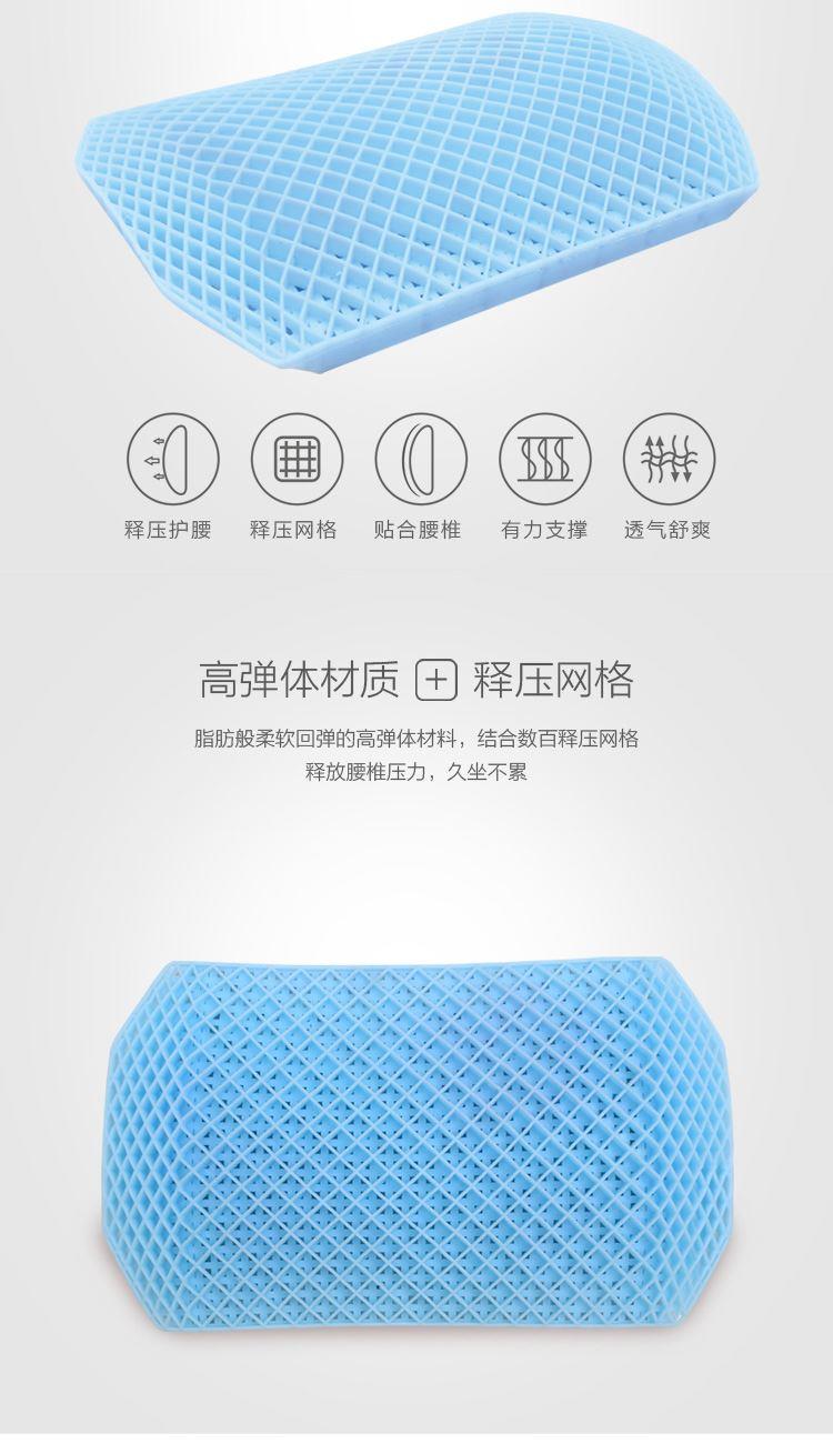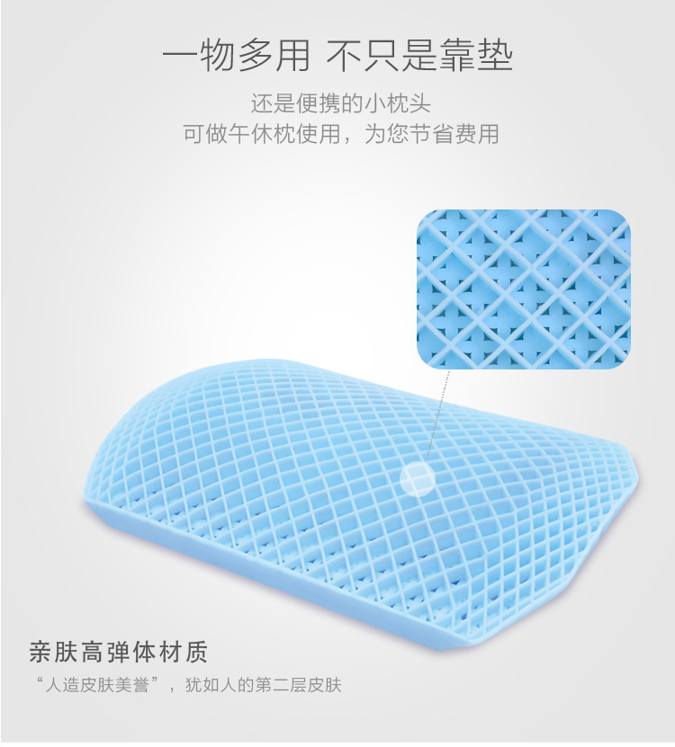 产品尺寸:39*24*5.6cm 重量:约0.88kg 颜色:淡蓝色,灰色外套 靠垫软硬度可调,尺寸大小可设计定制, 高弹复合材料TPE,亲肤, 造型符合人体工学, 可水洗,持久使用,透气,不变形, 安全环保无毒