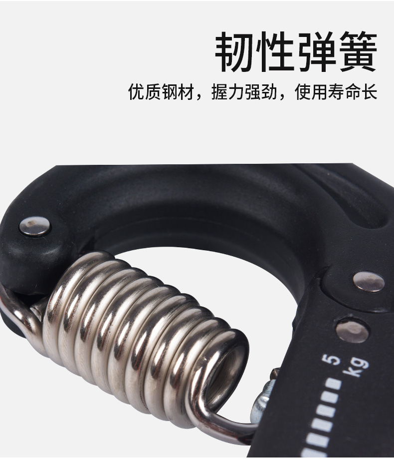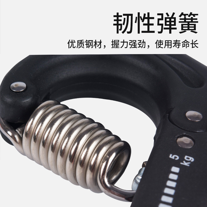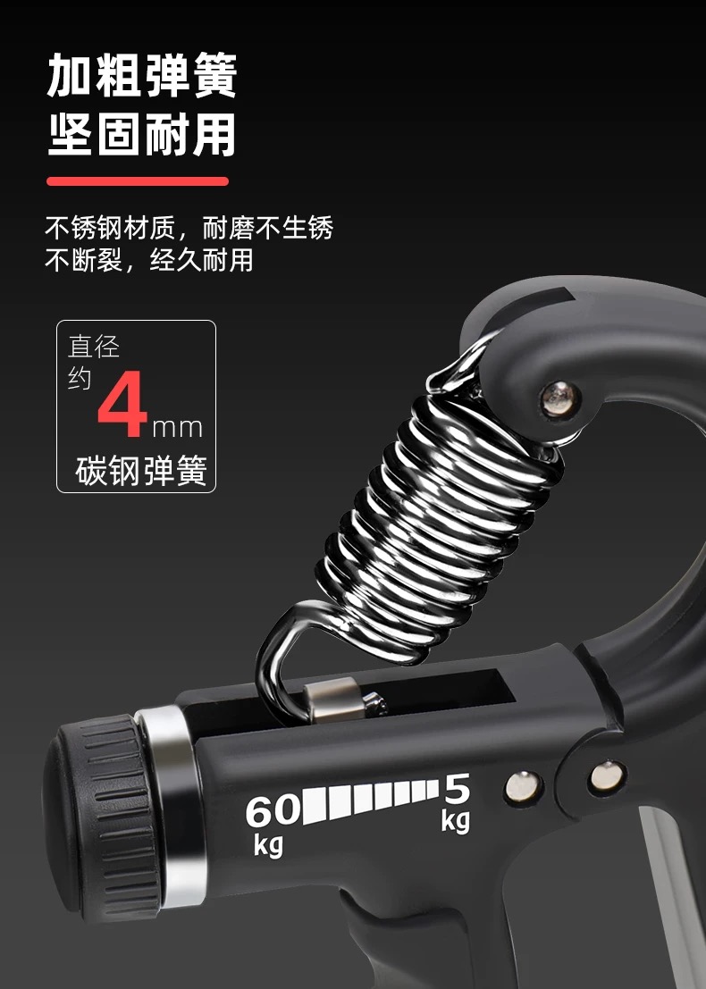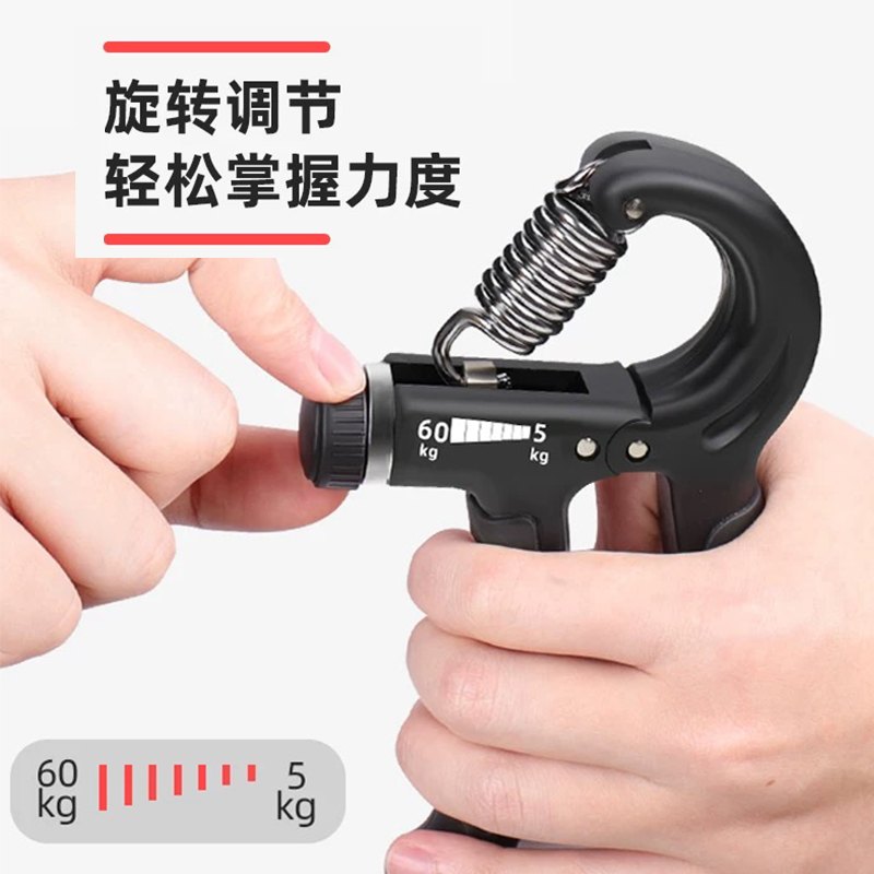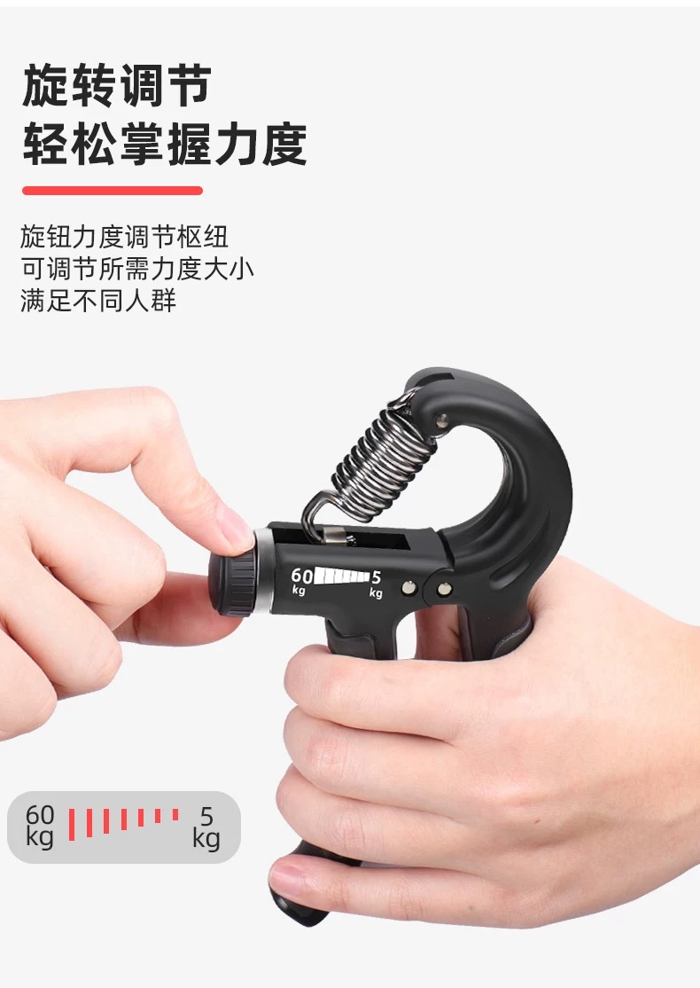 材质 PP+TPE+弹簧钢 颜色 全黑 尺寸 10.5*16.5*2.5cm 重量 175g 握力 5-60kg 科学计数,经久耐用,长期使用不变形 身材小巧,随身携带,可轻松放入口袋 加粗弹簧,坚固耐用,不锈钢材质,耐磨不生锈,不断裂 旋转调节,可调节所需力度大小,满足不同人群 握感舒适,防止打滑,采用凹凸防滑设计