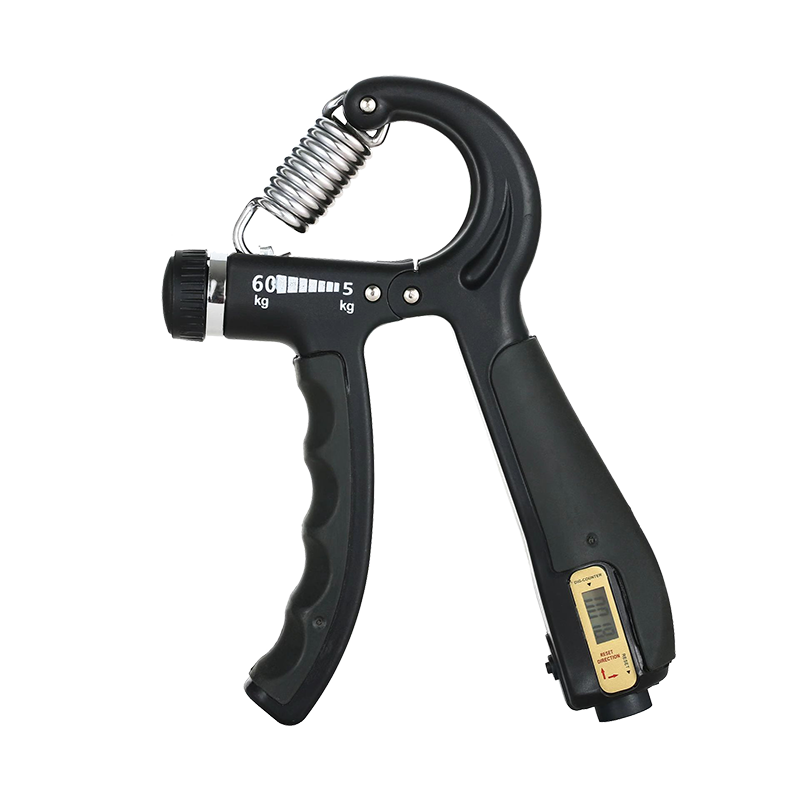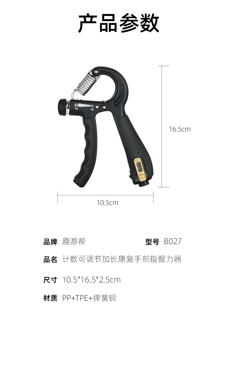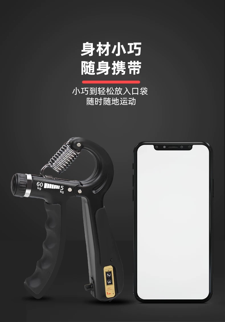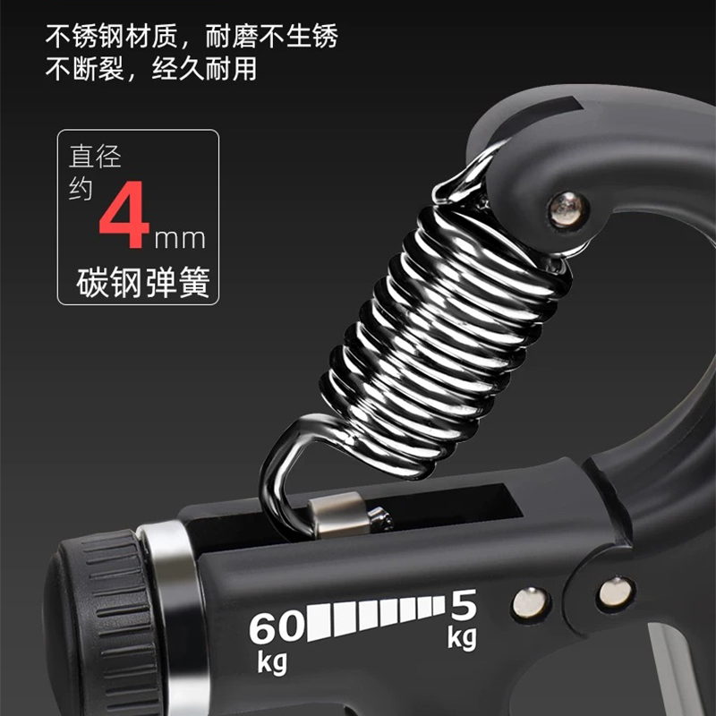 材质 PP+TPE+弹簧钢 颜色 全黑 尺寸 10.5*16.5*2.5cm 重量 175g 握力 5-60kg 科学计数,经久耐用,长期使用不变形 身材小巧,随身携带,可轻松放入口袋 加粗弹簧,坚固耐用,不锈钢材质,耐磨不生锈,不断裂 旋转调节,可调节所需力度大小,满足不同人群 握感舒适,防止打滑,采用凹凸防滑设计