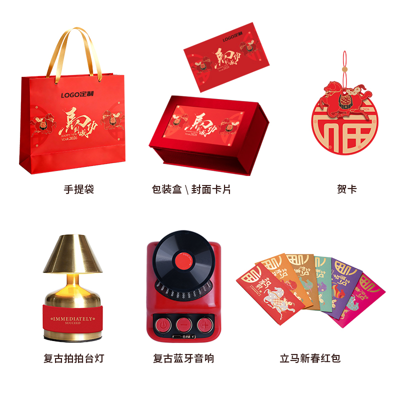 1、复古拍拍小台灯:三色变光 触感变色 无极调光 2、好运复古蓝牙音箱:蓝牙、氛围灯、趣味按键 3、新年红包*6:开启新年好运程 4、绒面礼盒:日历功能、收纳功能 用完不闲置 注:礼盒可专版定制画面