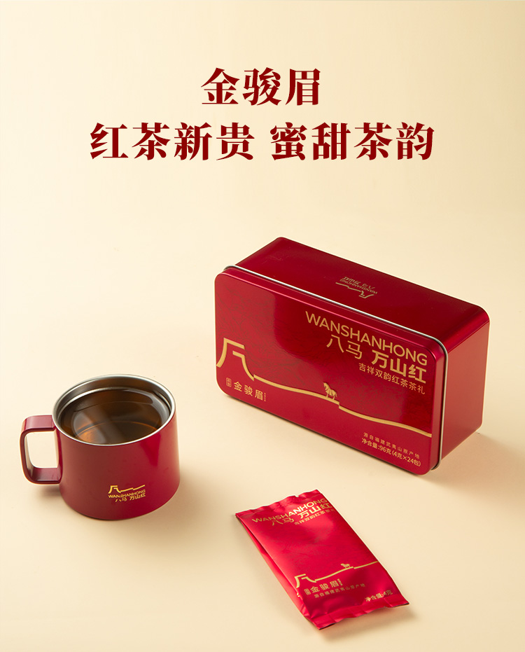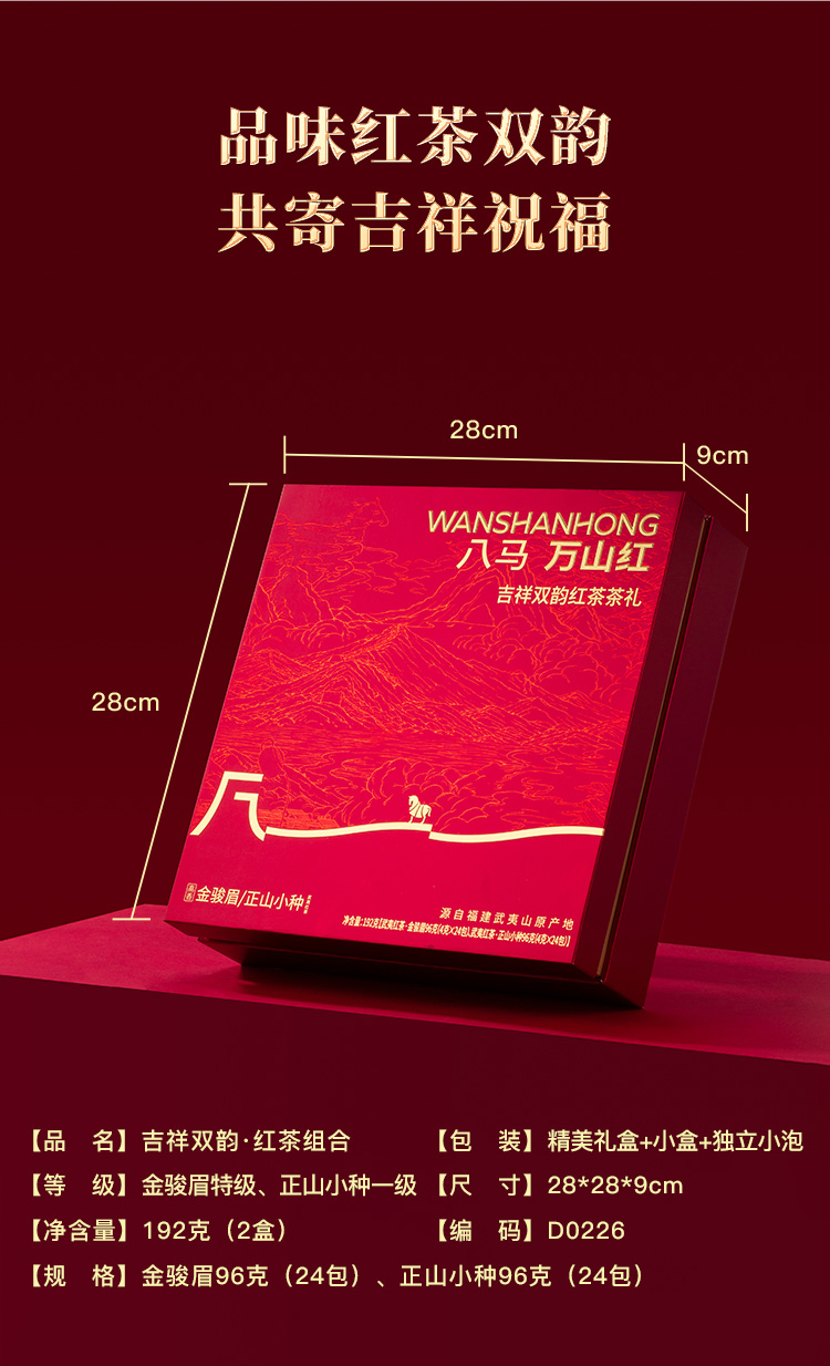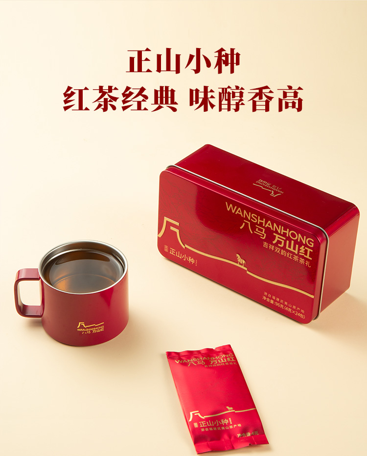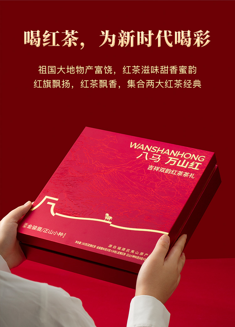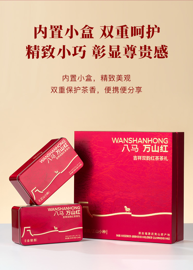 礼盒内配: 特级金骏眉96克(24包) 一级正山小种96克(24包) 净含量:192克 单罐内配: 大红袍80克 净含量:80g 推荐理由: 自饮一罐,送礼一盒 大红袍(罐装) - 产地工艺:源自福建武夷山原产地,采用传统焙火工艺,打造地道武夷岩茶。 - 品质口感:武夷原产确保正宗品质,茶叶滋味醇浓,茶香馥郁且耐泡度高。 - 包装用途:大罐包装实在大气,净含量充足,既适合自饮品鉴,也可作为礼品赠送。 吉祥双韵红茶茶礼(礼盒装) - 产地品类:同样产自福建武夷山核心产区,包含多种红茶品类(如正山小种等),可体验红茶双韵风味。 - 包装设计:大气礼盒搭配独立小铁盒,内置小泡装,精致小巧,便于储存、携带,送礼彰显尊贵感。 - 品质保障:源于武夷核心产区,工艺加持,品质稳定可靠,是红茶礼赠的优质之选。