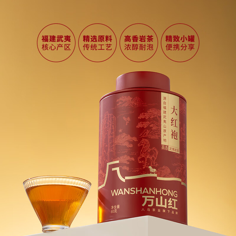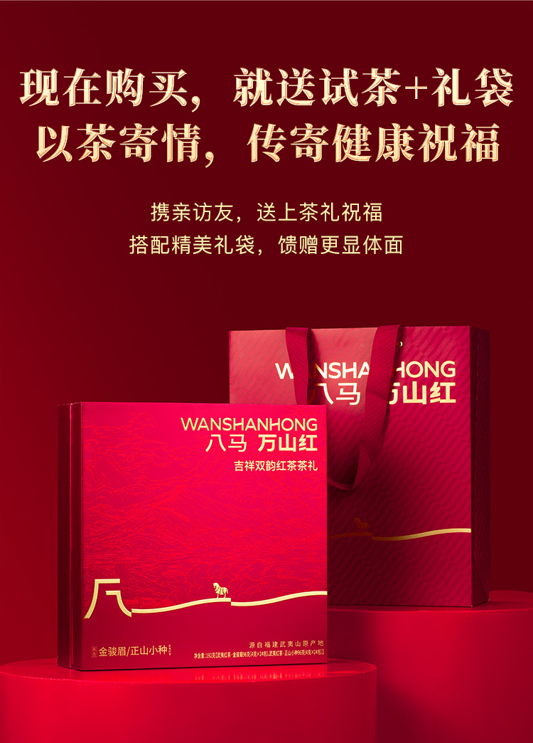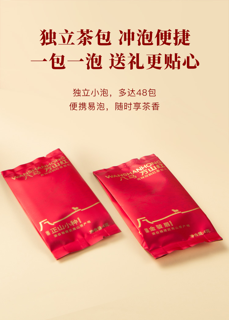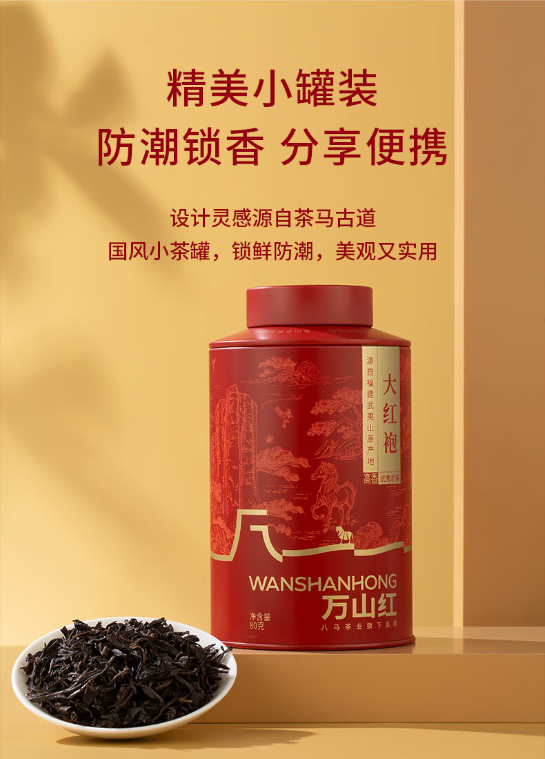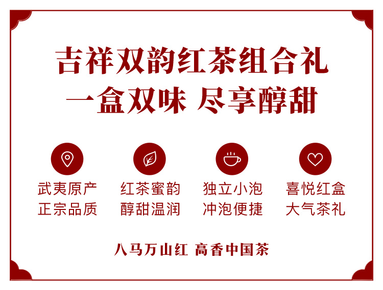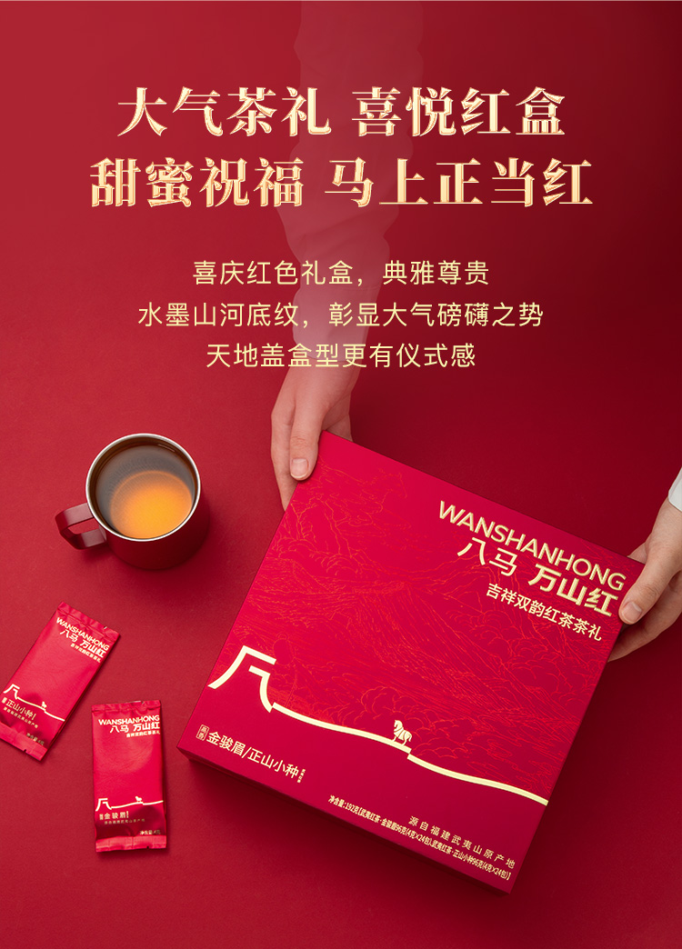 礼盒内配: 特级金骏眉96克(24包) 一级正山小种96克(24包) 净含量:192克 单罐内配: 大红袍80克 净含量:80g 推荐理由: 自饮一罐,送礼一盒 大红袍(罐装) - 产地工艺:源自福建武夷山原产地,采用传统焙火工艺,打造地道武夷岩茶。 - 品质口感:武夷原产确保正宗品质,茶叶滋味醇浓,茶香馥郁且耐泡度高。 - 包装用途:大罐包装实在大气,净含量充足,既适合自饮品鉴,也可作为礼品赠送。 吉祥双韵红茶茶礼(礼盒装) - 产地品类:同样产自福建武夷山核心产区,包含多种红茶品类(如正山小种等),可体验红茶双韵风味。 - 包装设计:大气礼盒搭配独立小铁盒,内置小泡装,精致小巧,便于储存、携带,送礼彰显尊贵感。 - 品质保障:源于武夷核心产区,工艺加持,品质稳定可靠,是红茶礼赠的优质之选。