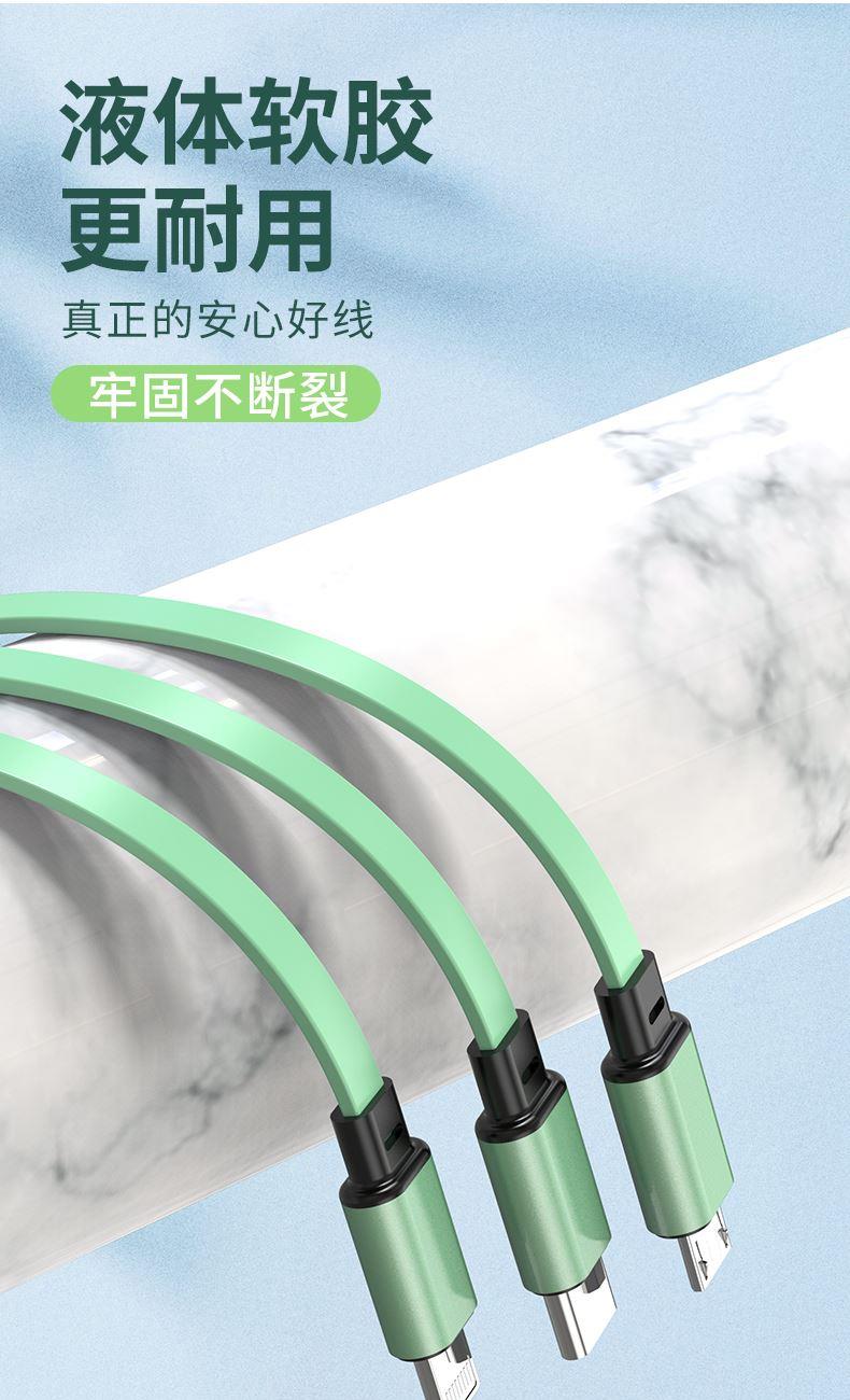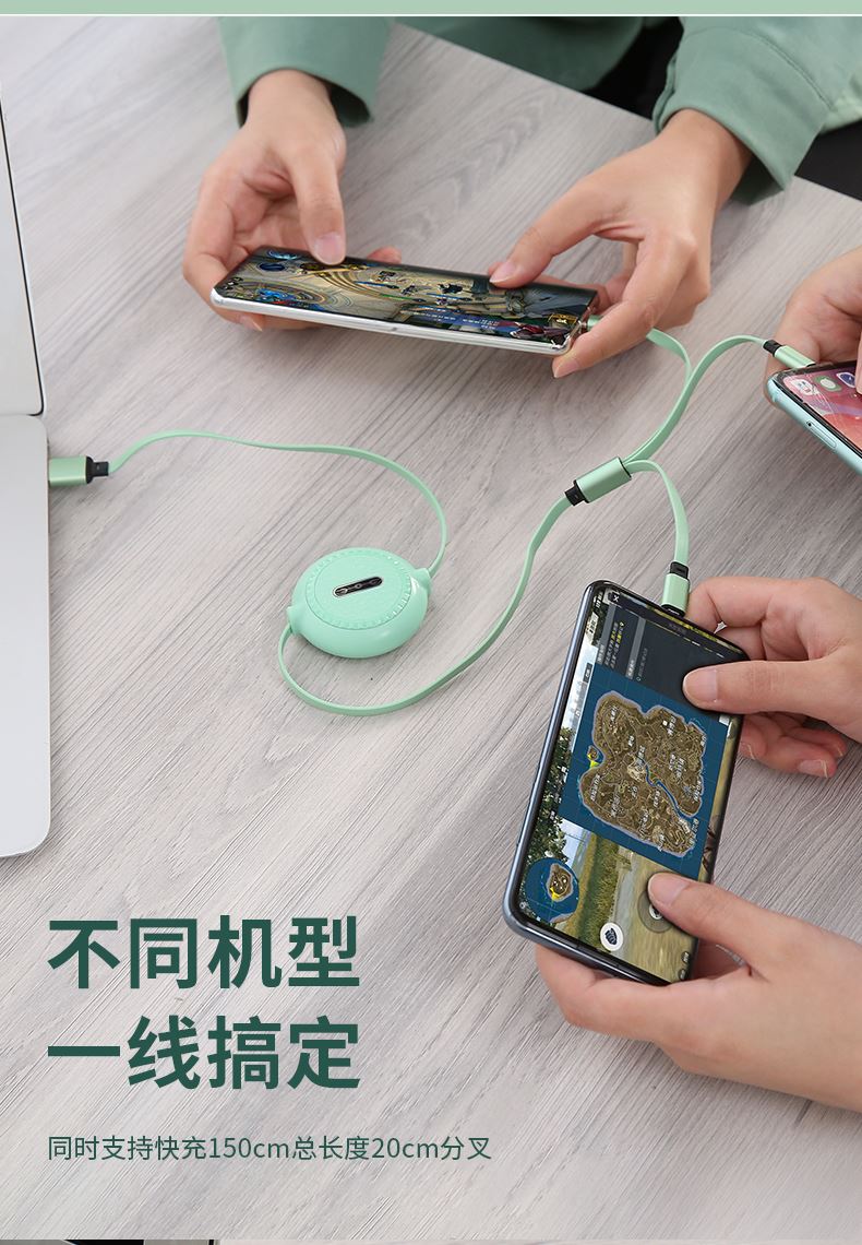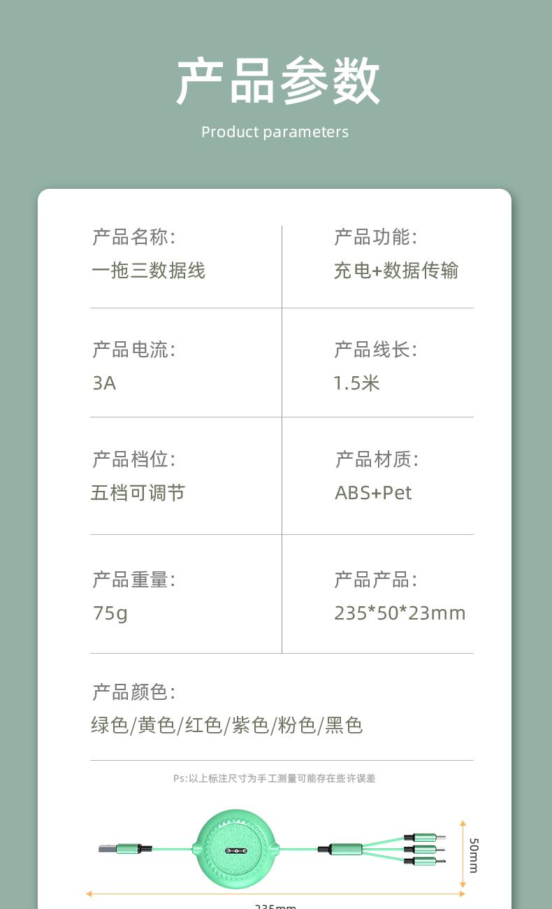 12W快充数据线,充电更快 三种接口满足各种手机 1.1米长度设计,使用方便 TPE材质耐用,不易折断 马卡龙配色多种选泽 五档伸缩调节