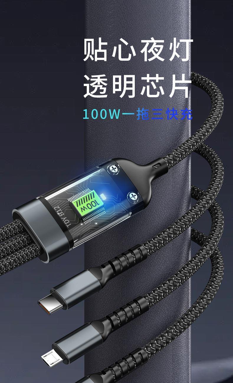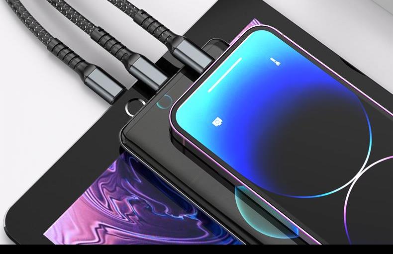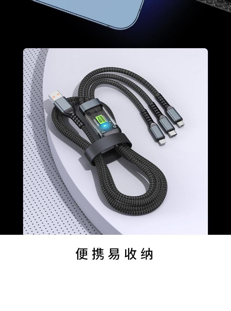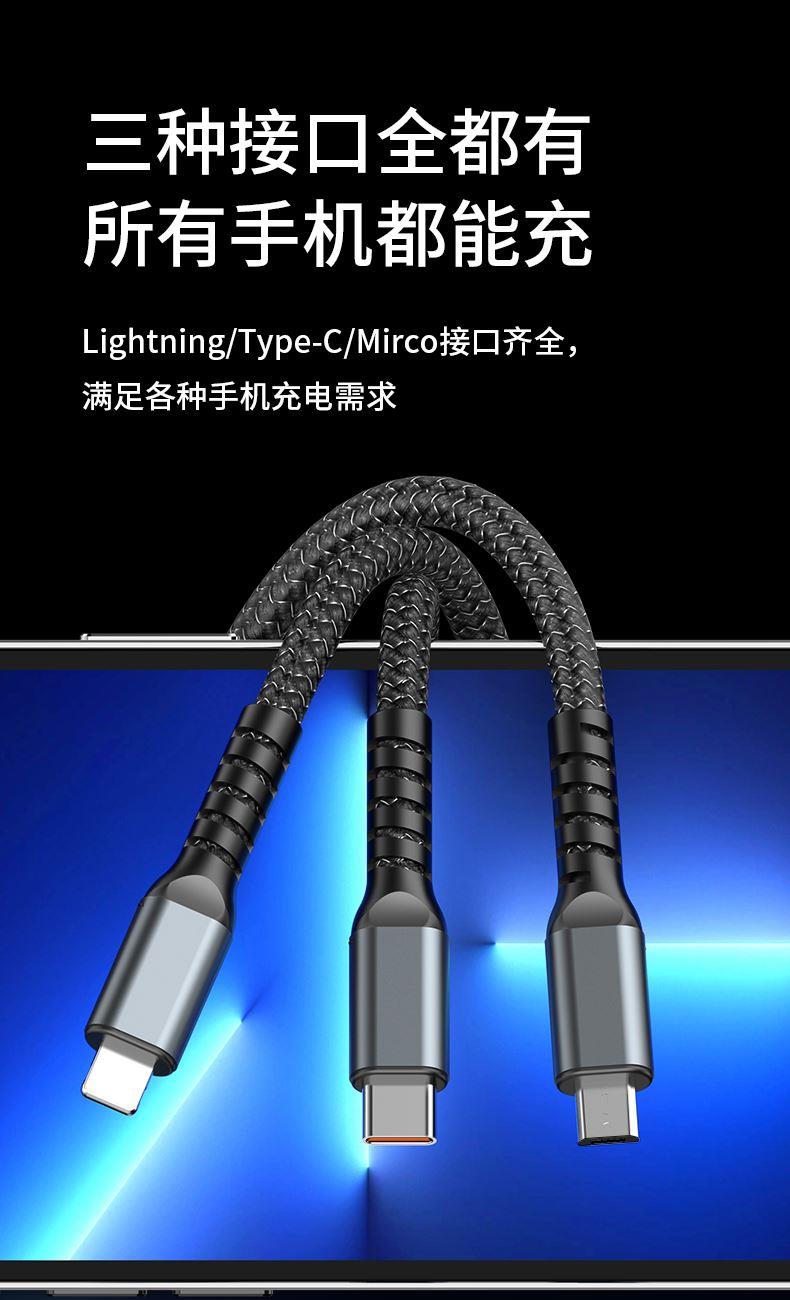 颜色: 灰色 材质:超粗硬体编织线 尺寸:1.2M 包装:彩盒包装 功能特点】: 3A超级快充,充电更快 超粗硬体编织线,一体成型充电头 三种接口满足各种手机 1.2米长度设计,使用方便 编织线耐磨耐用,不易折断