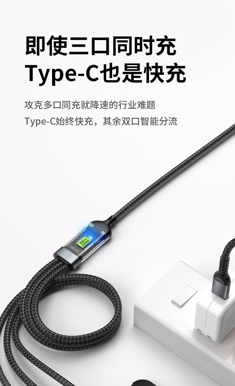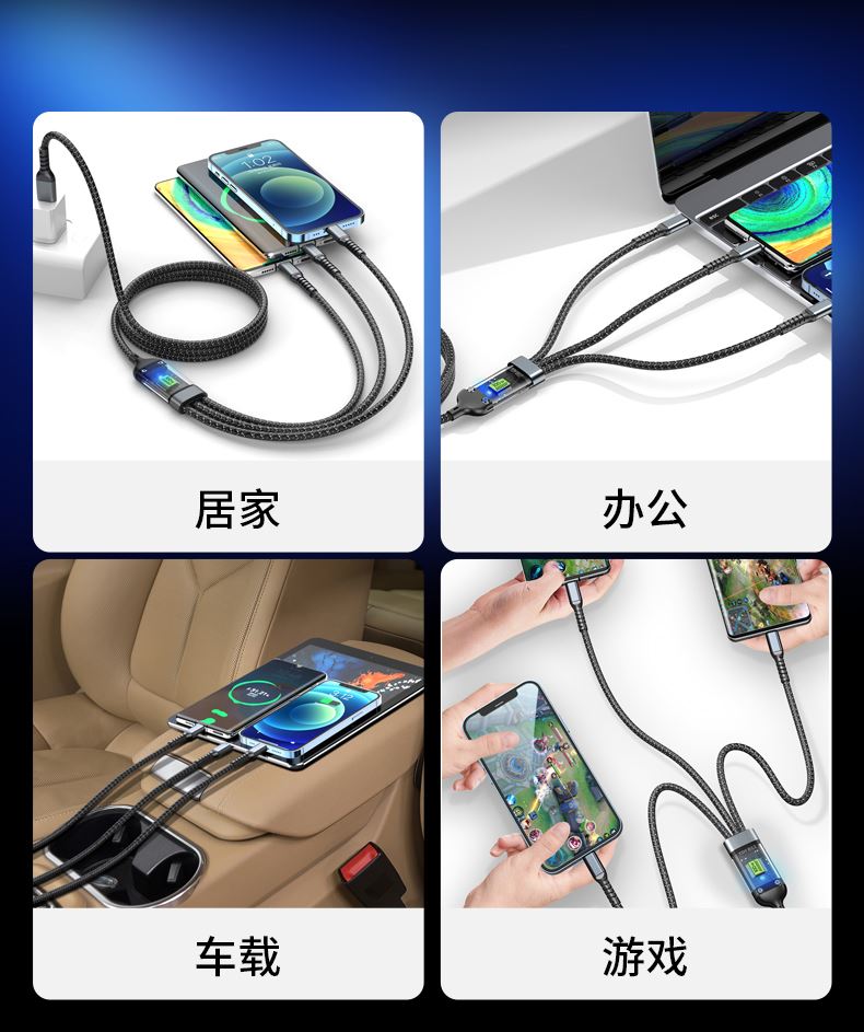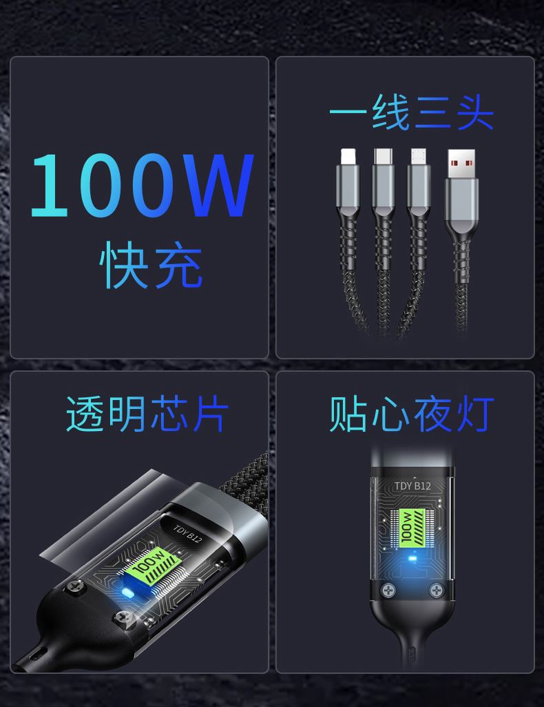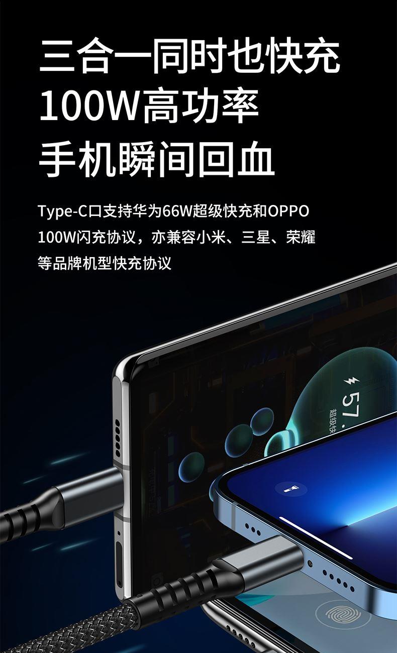 颜色: 灰色 材质:超粗硬体编织线 尺寸:1.2M 包装:彩盒包装 功能特点】: 3A超级快充,充电更快 超粗硬体编织线,一体成型充电头 三种接口满足各种手机 1.2米长度设计,使用方便 编织线耐磨耐用,不易折断