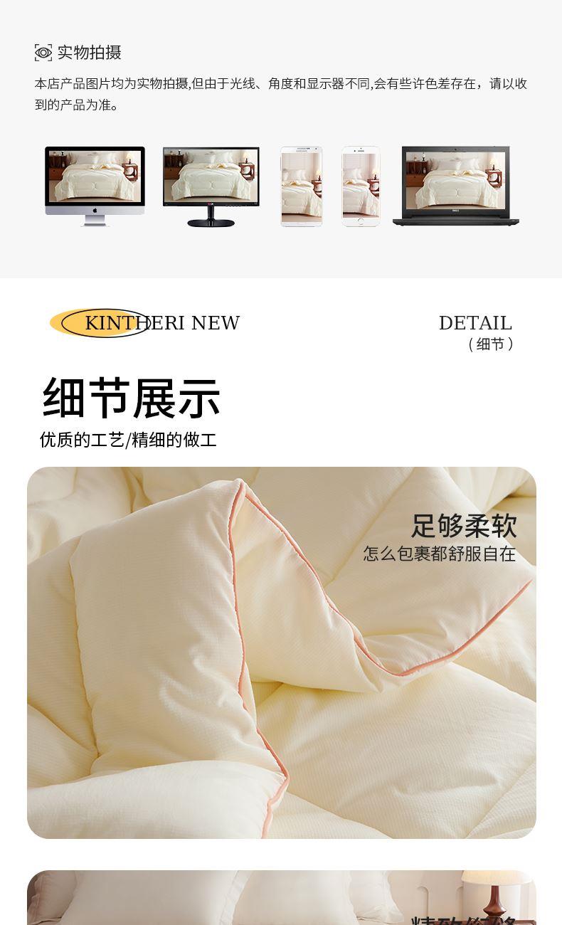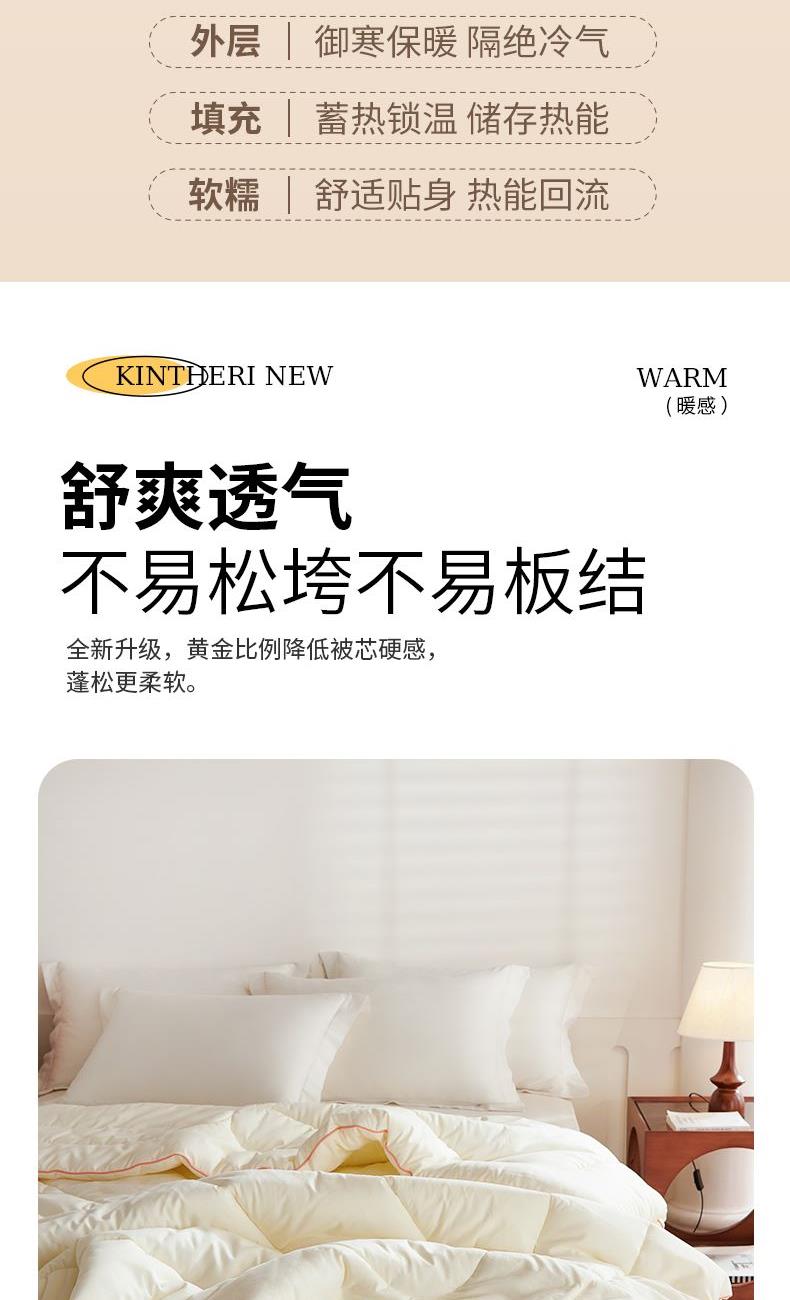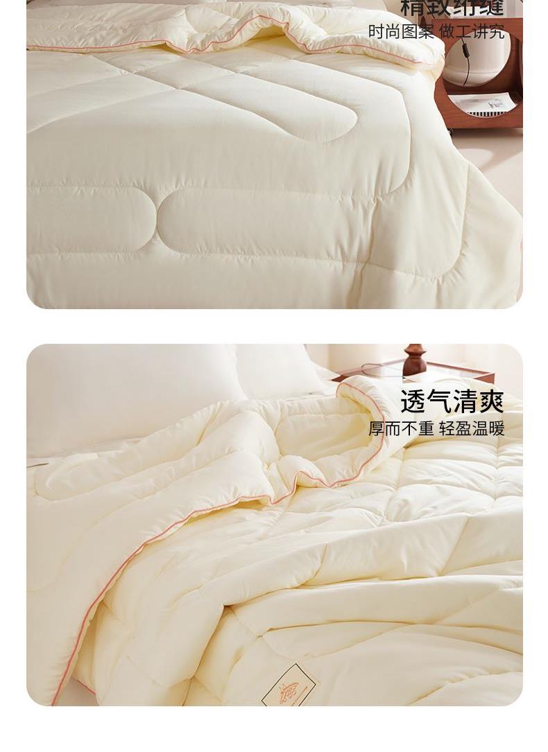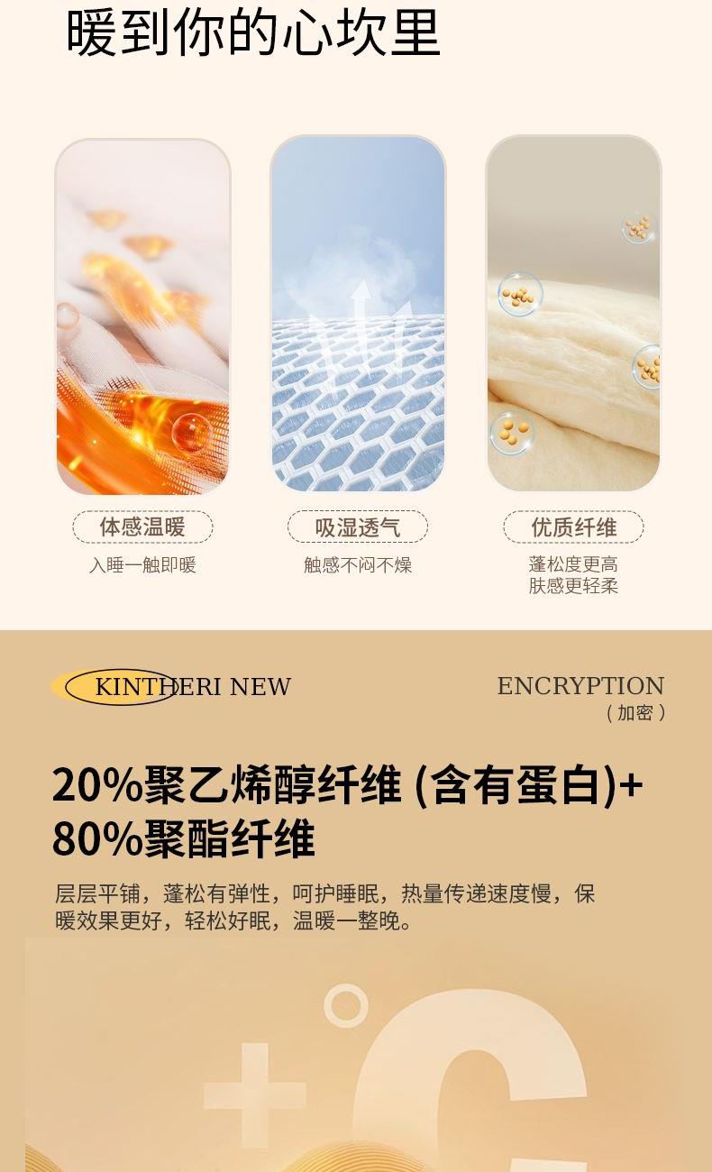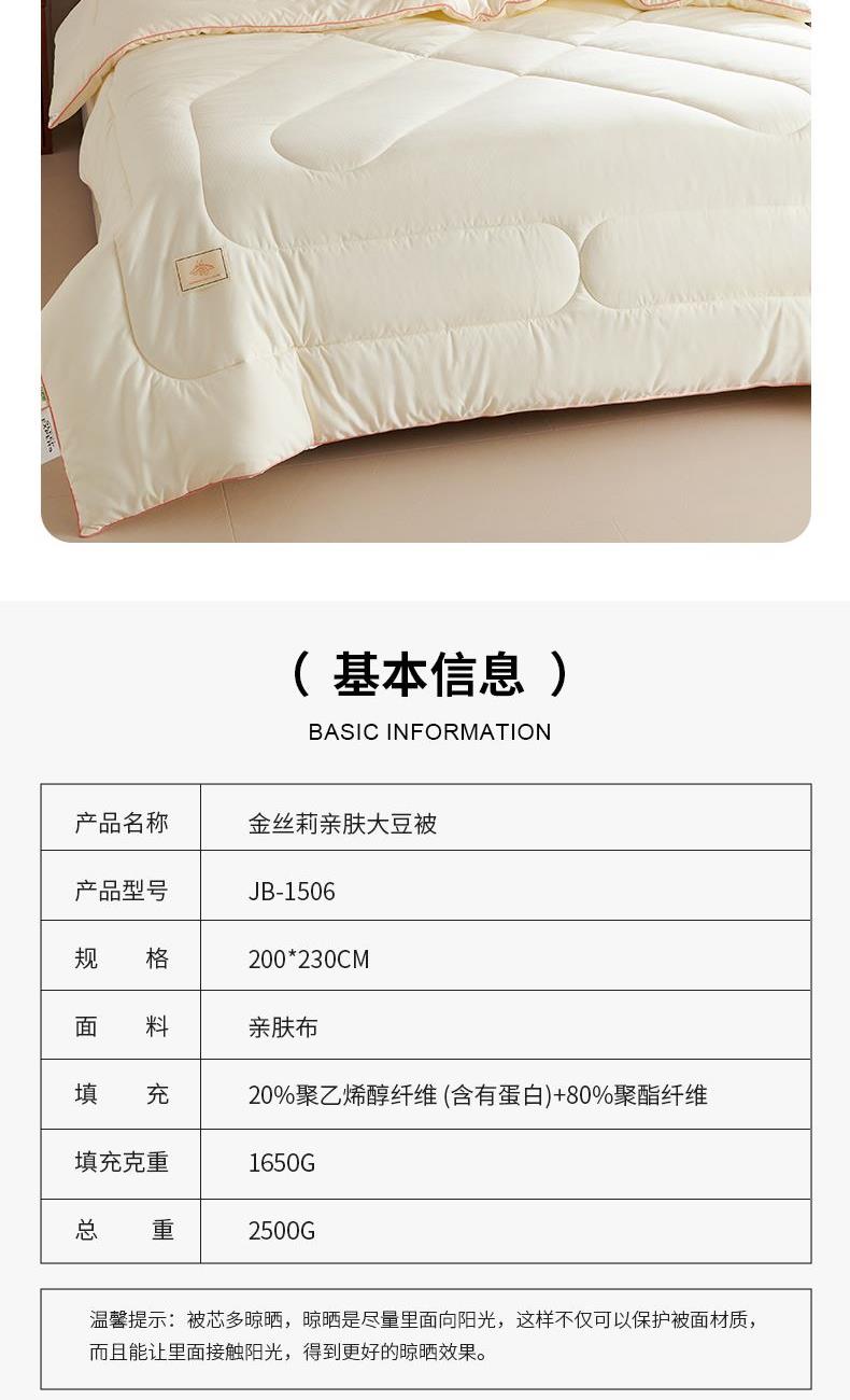 货 号:JB-1506 规 格:200×230cm 面 料:亲肤布 填 充:20%聚乙烯纤维 (含有蛋白)+80%聚酯纤维 克 重:2500G 面料柔滑质感,一触难忘,透气性能强,造型舒适饱满,亲肤有机健康,如绸缎细腻柔滑,给每一寸肌肤丝滑触感,含蛋白聚乙烯纤维,热量传递速度保暖效果更好,轻松好眠,温暖一整晚。