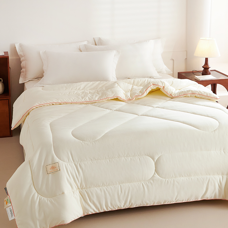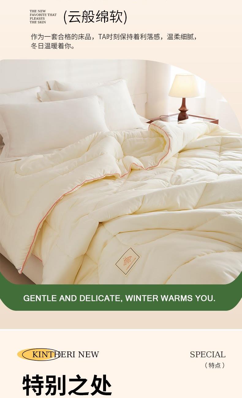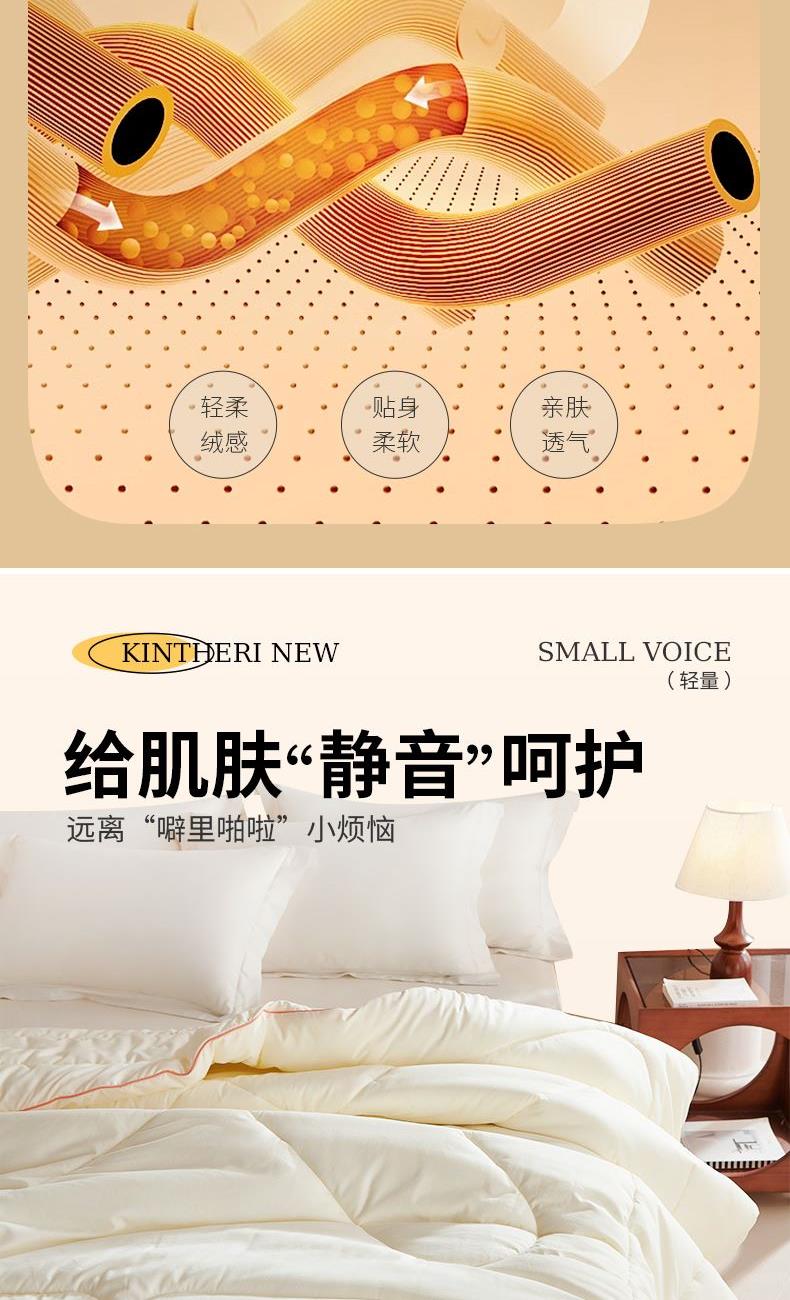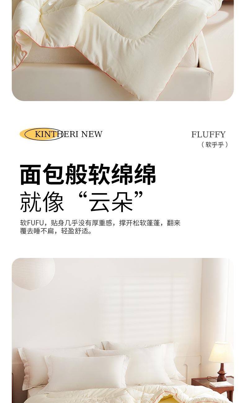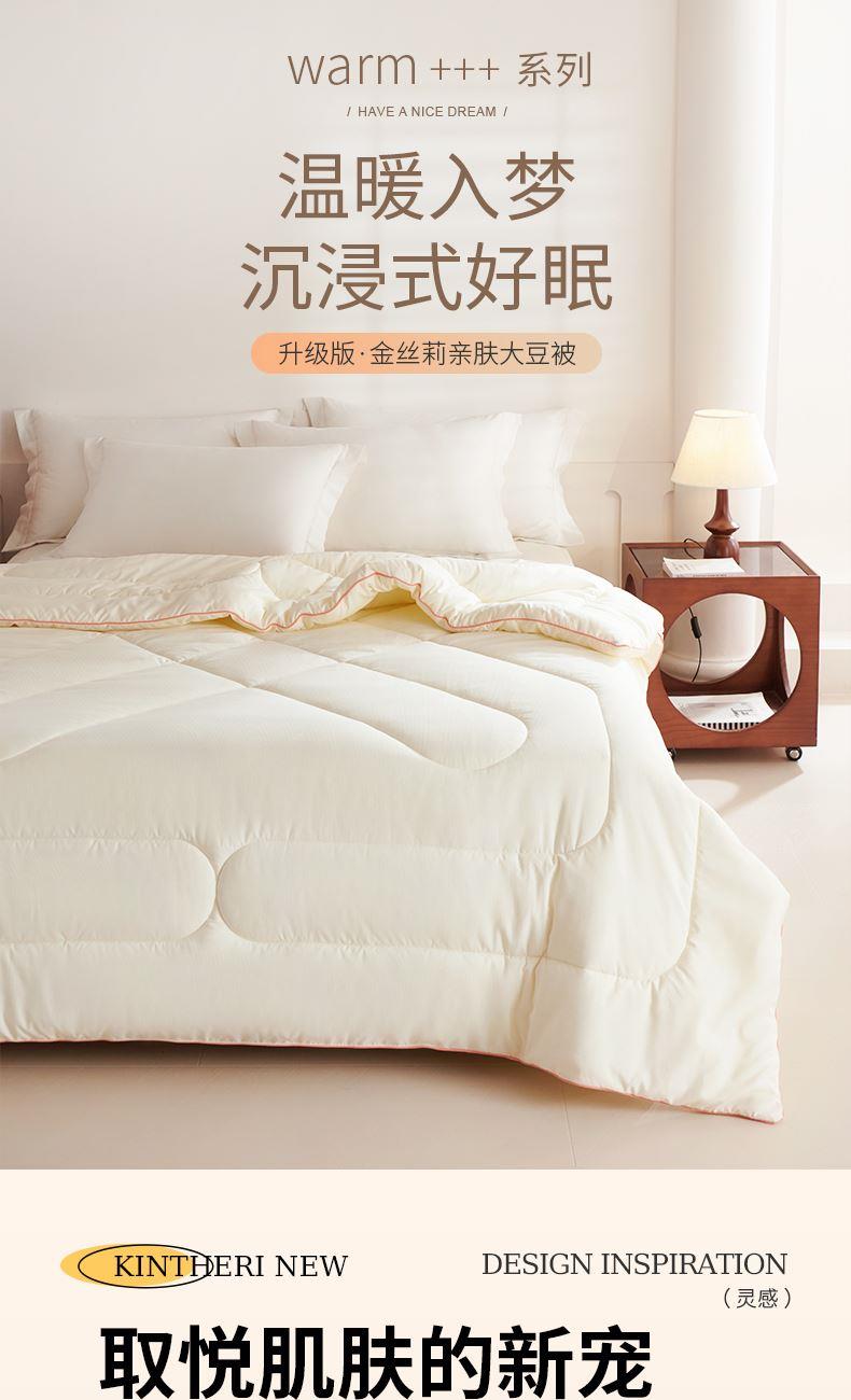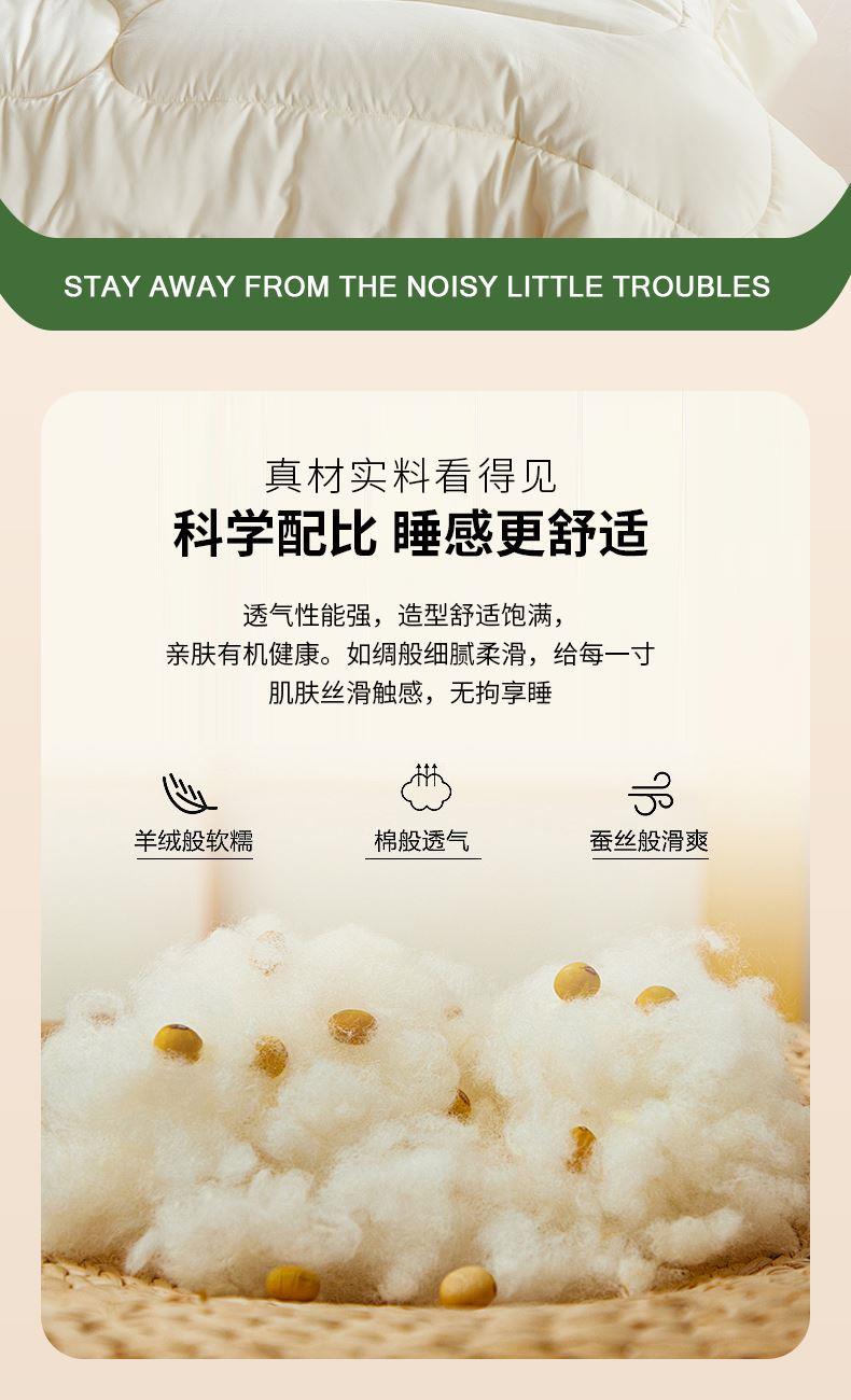 货 号:JB-1506 规 格:200×230cm 面 料:亲肤布 填 充:20%聚乙烯纤维 (含有蛋白)+80%聚酯纤维 克 重:2500G 面料柔滑质感,一触难忘,透气性能强,造型舒适饱满,亲肤有机健康,如绸缎细腻柔滑,给每一寸肌肤丝滑触感,含蛋白聚乙烯纤维,热量传递速度保暖效果更好,轻松好眠,温暖一整晚。
